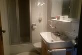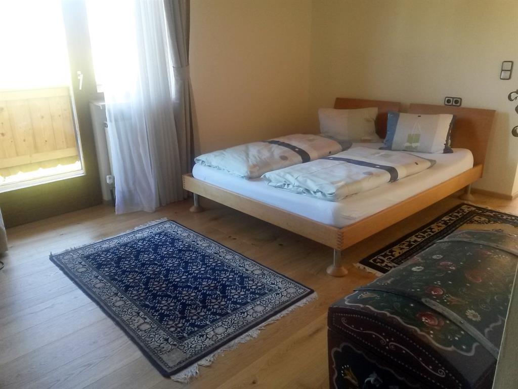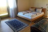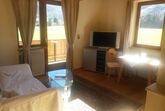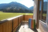 Appartement Kaiser (50 m²) im 1. Stock, Schlafzimmer , Boxspringbett mit 2 Matratzen mit offenem Durchgang zum Wohnraum, TV, Küchenzeile, Badezimmer mit Dusche und WC, großer Balkon nach Osten (Frühstück!) und nach Süden mit freiem Blick zum Unterberghorn, Frühstück auf Wunsch.