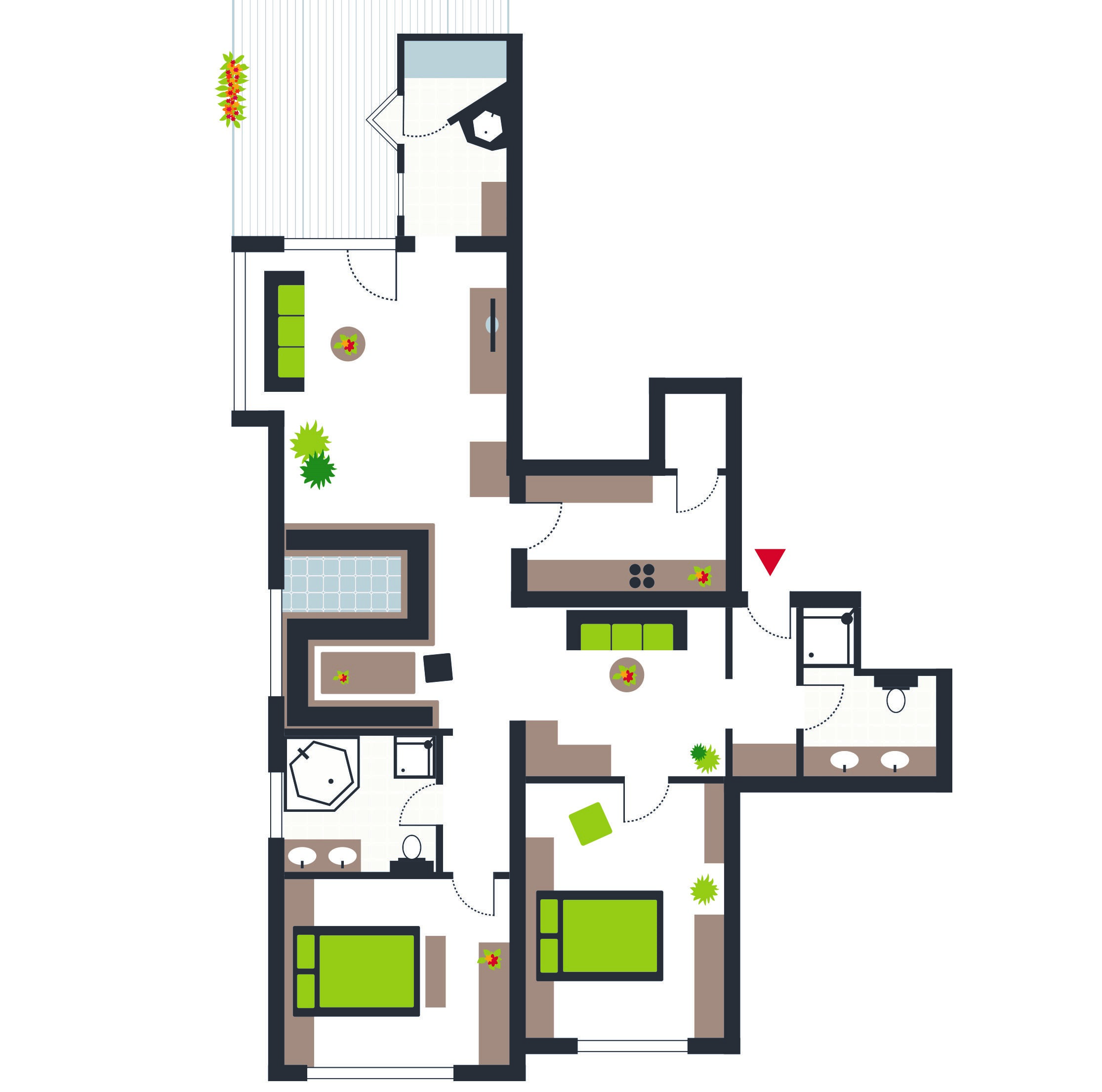 Dieses Apartment ist bestens und sehr komfortabel ausgestattet (wie etwa mit Bio-Matratzen, Holzböden, usw..) und ist ca. 100 m² groß;
