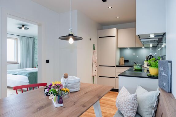 Freuen Sie sich auf eine Auszeit in unserer neuen Berg-See-Suite! Dieses lichtdurchflutete Zweiraumappartement im ersten Stock bietet auf 41m² eine hochwertige Ausstattung mit edlen Vollholzmöbeln und Echtholzböden. Das separate Schlafzimmer mit feiner Leinenbettwäsche und die helle Wohnküche mit zusätzlicher Schlafcouch sorgen für ein großzügiges Raumkonzept. Genießen Sie den atemberaubenden Panoramablick auf den See und die Berge von dem 10m² großen, überdachten, südseitigen Balkon. Zur Ausstattung gehören Sat-TV, ein modernes Badezimmer mit geräumiger Dusche und WLAN. Der Preis beinhaltet die Millstätter-Inclusive-Card, die Ihnen den kostenlosen Zugang zu Strandbädern, Mautstraßen und weiteren Angeboten der Region ermöglicht.