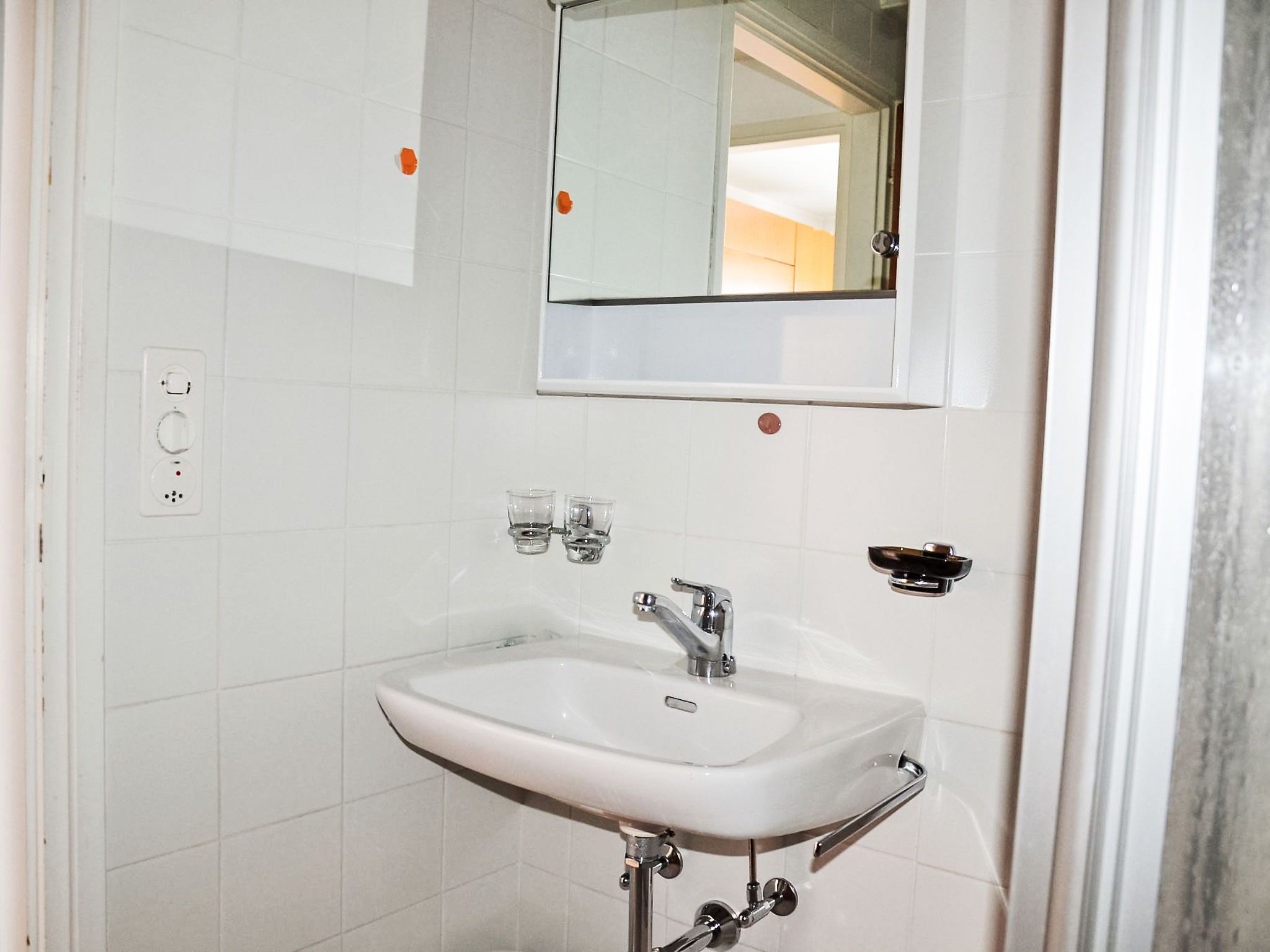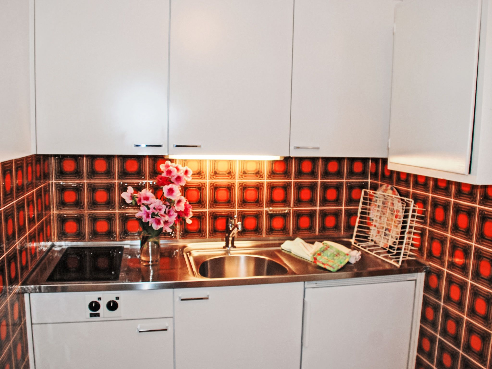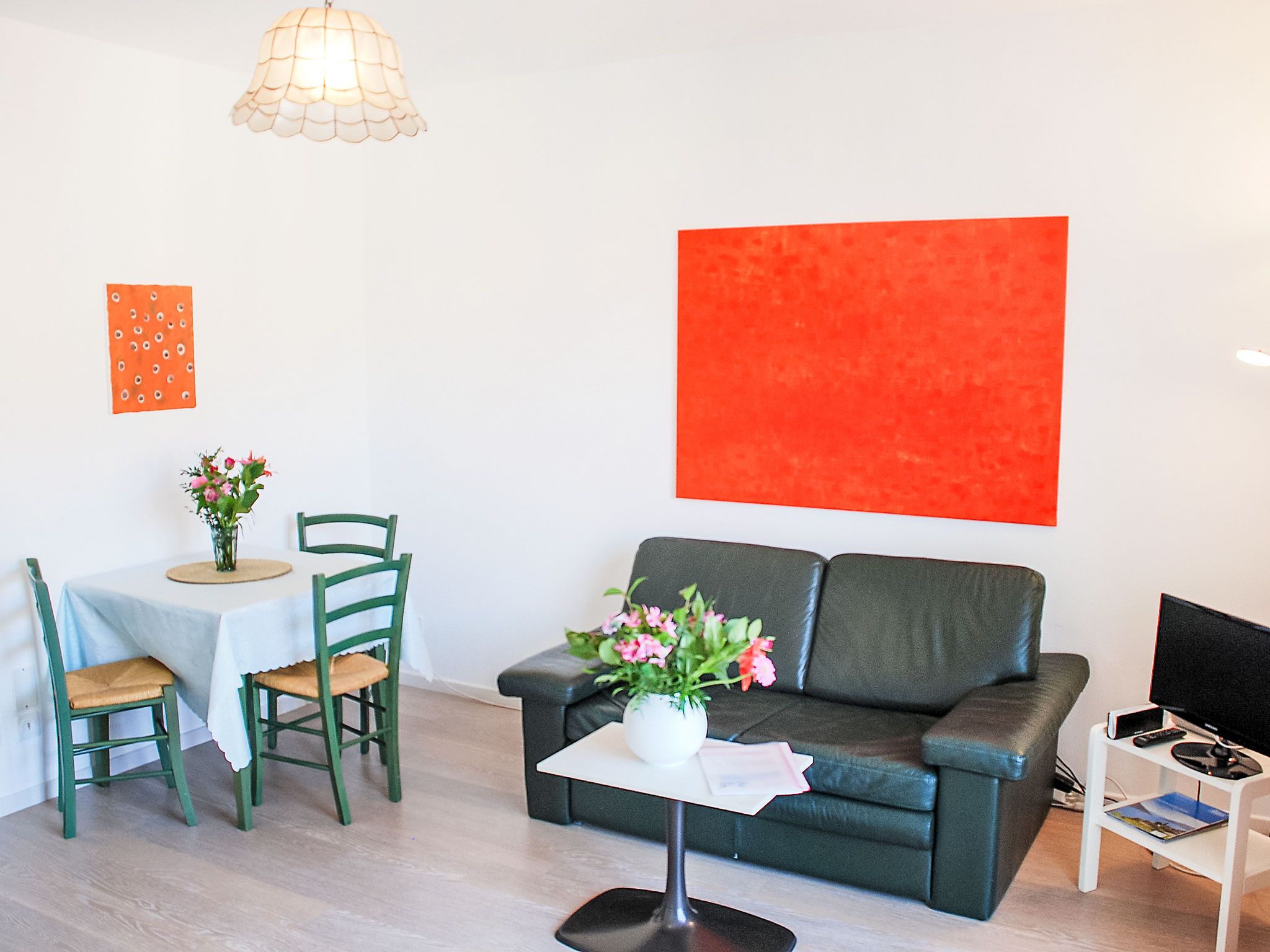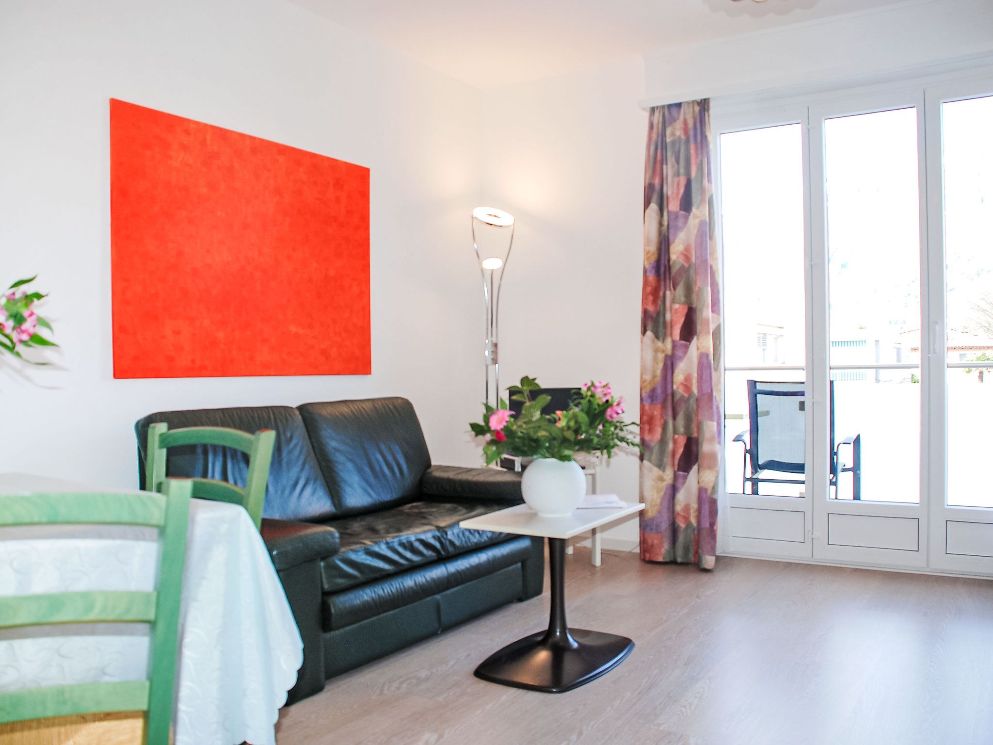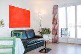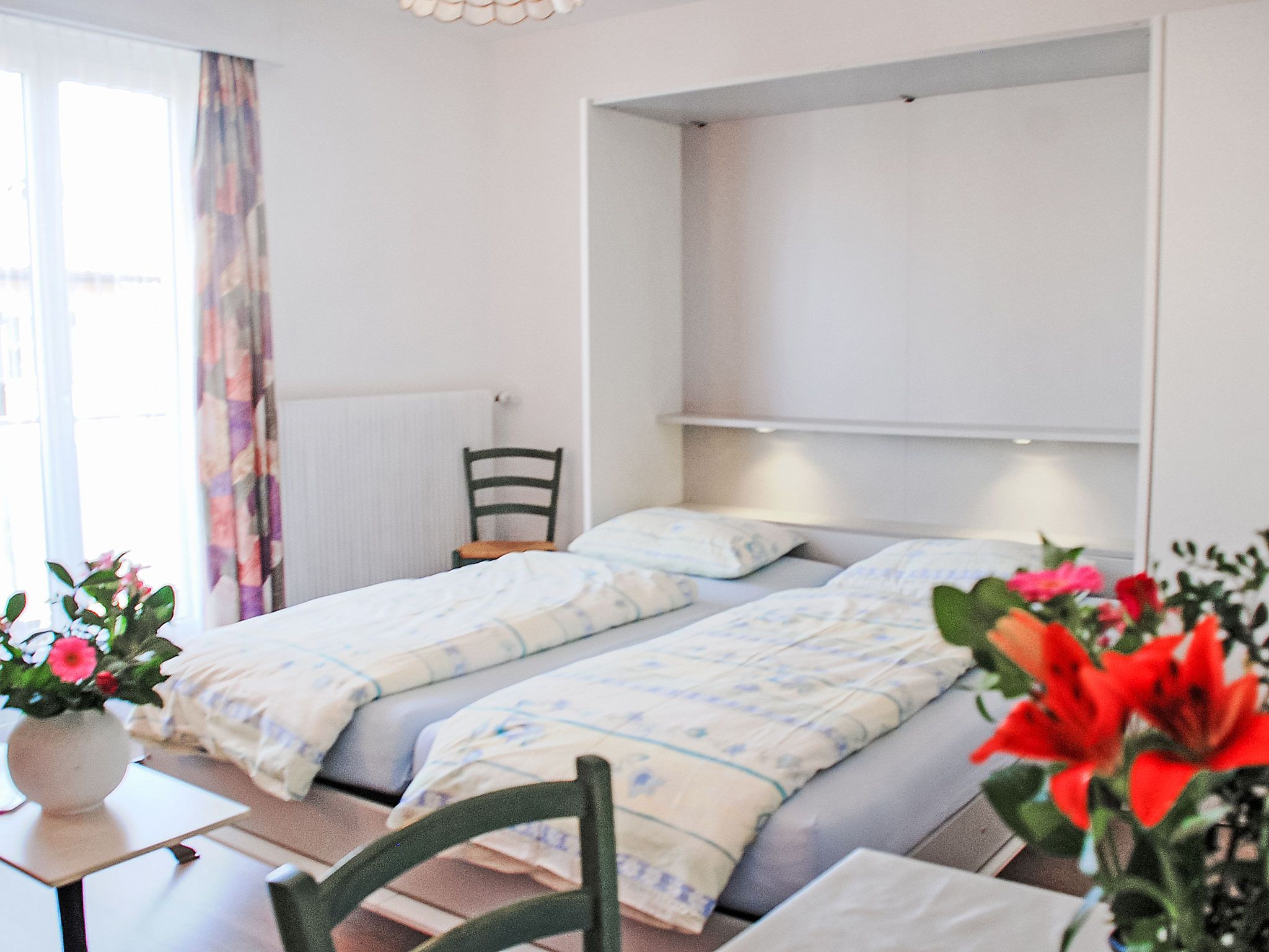 1-Zimmer-Wohnung 29 m2 im 2. Stock. Hell, teilweise renoviert im Jahre 2015, komfortabel und gemütlich eingerichtet: Wohn-/Esszimmer mit 1 Doppelwandschrankbett (2 x 90 cm, Länge 200 cm), Esstisch, Kabel-TV, Flachbildschirm, Radio und Ventilator. Ausgang zum Balkon. Kochnische im Eingang (2 Glaskeramikplatten, elektrische Kaffeemaschine, Kapseln für die Kaffeemaschine (Caffitaly) extra). Dusche/WC. Heizung. Balkon. Balkonmöbel. Zur Verfügung: Internet (WLAN). Bitte beachten: Nichtraucher-Unterkunft. Maximal 1 Haustier/Hund erlaubt. NL-