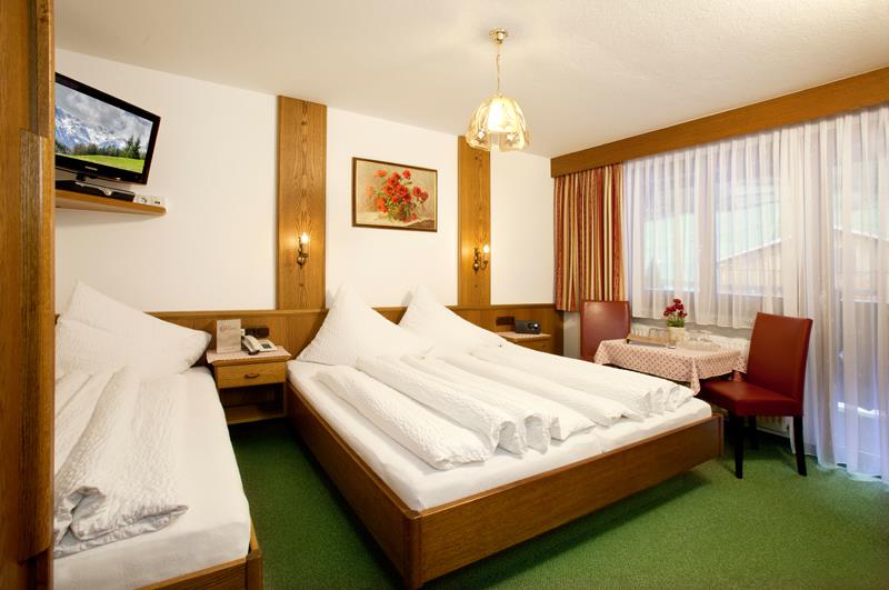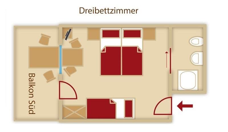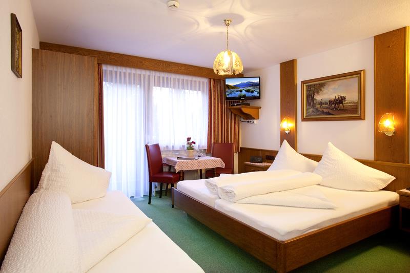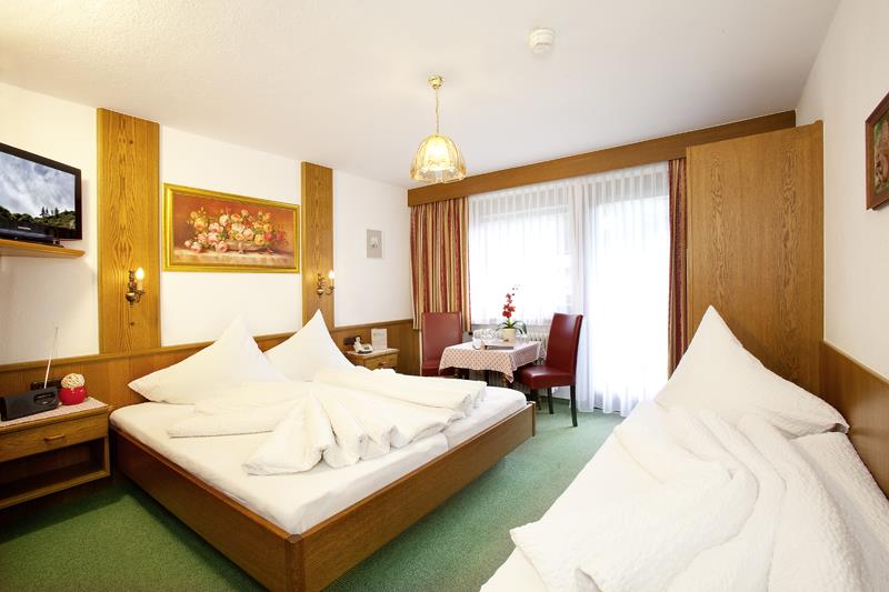Komfortables Dreibettzimmer (ca. 22 m²) mit Dusche oder Badewanne/WC, Kabel-TV ( 95 Programme und Videofilme gratis ) Radio, Telefon, Safe, Haarföhn, Südbalkon  und W-Lan.