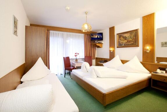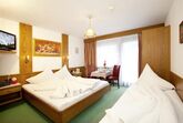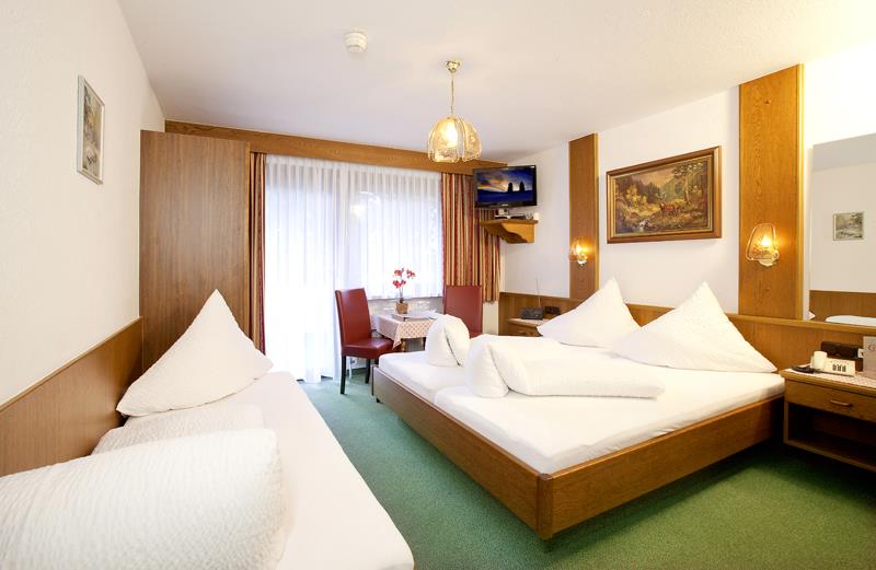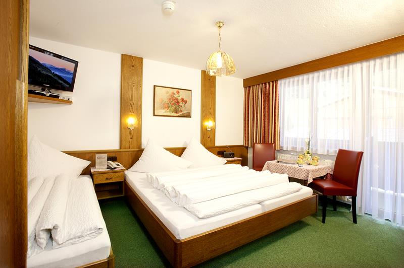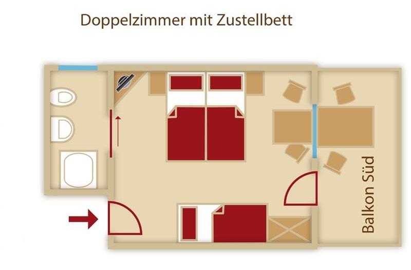 Komfortables Doppelzimmer mit Zustellbett für 2-3 Personen (ca. 22 m²) mit Dusche oder Badewanne/WC Süd-Balkon, Kabel-TV ( 95 Programme und Videofilme gratis ) Radio, Telefon, Safe, Haarfön und W-Lan.