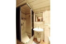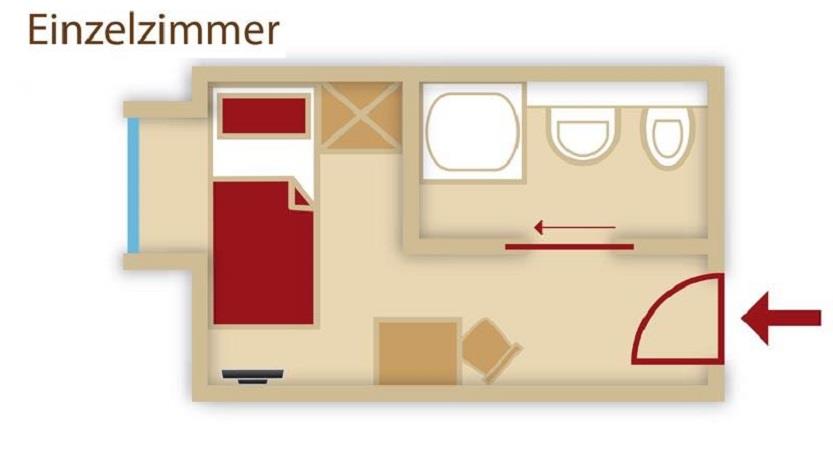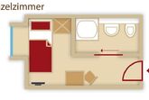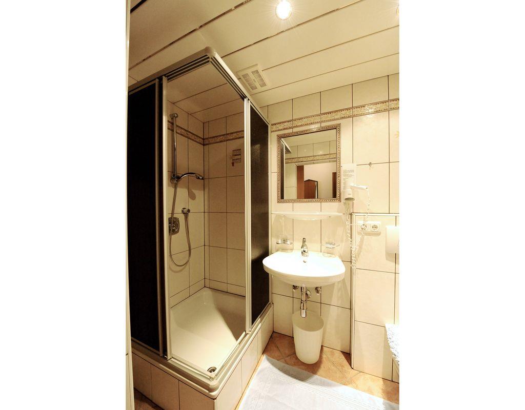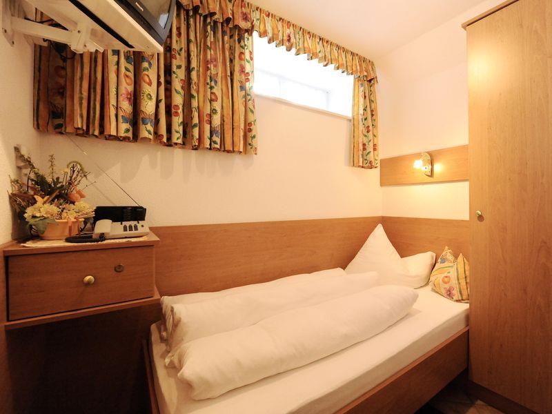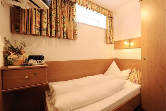 Einzelzimmer (ca. 10 m²) im Untergeschoß mit Fenster, Dusche/WC, Kabel-TV( 95 Programme und Videofilme gratis ) Radio, Haarföhn, Safe, Telefon und W-Lan.