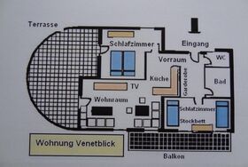 Die 3 - Zimmer Ferienwohnung Venetblick mit 62 m² besteht aus:. 2 getrennten Schlafzimmern ( 1x Doppel, 1x 3 Bettzimmer). Wohnzimmer mit Doppelausziehcouch, bestens ausgestatteter Küche mit Mikrowelle, Toaster, Geschirrspüler, Wasserkocher, Safe. Bettwäsche, Hand-, Bade- und Geschirrtücher sind vorhanden. SAT TV, Stereoanlage mit CD-Player,. Internetanschluss. Bad + WC sind separat, Fön, Kosmetikspiegel, Seife, Duschaufbau mit Glasschiebetür. Balkon und Terrasse mit herrlichem Bergblick über das Tal