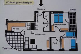 Die 3 - Zimmer Wohnung Hochzeiger mit 62 m² besteht aus: . 2 getrennten Schlafzimmern ( 1x Doppel, 1x 2 Bettzimmer) . Wohnzimmer mit Doppelausziehcouch . ein eigener Abstellraum mit Regalen . bestens ausgestatteter Küche mit Mikrowelle, Toaster, Geschirrspüler, Wasserkocher, Safe . Bettwäsche, Hand-, Bade- und Geschirrtücher sind vorhanden . SAT TV, Stereoanlage mit CD-Player, . Internetanschluss . Bad + WC sind separat, Fön, Kosmetikspiegel, Seife, Duschaufbau mit Glasschiebetür . Balkon und Terrasse mit Süd-West Lage