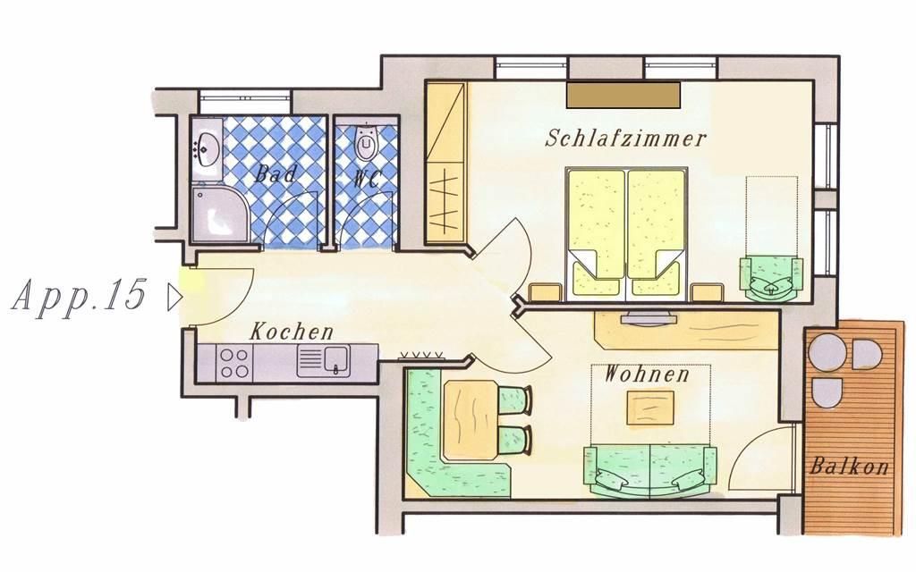 Zweiraumappartement, 48 m², Balkon, Kabel-TV, Radio, Safe, Telefon, Geschirr, Bettwäsche, Handtücher, Kaffeemaschine, Wasserkocher, Mikrowelle, Geschirrspüler.