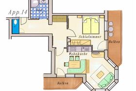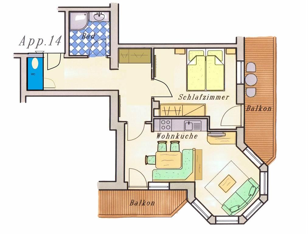 Zweiraumappartement, 50 m², Süd- und Ostbalkon, Kabel-TV, Radio, Safe, Telefon, Geschirr, Bettwäsche, Handtücher, Kaffeemaschine, Wasserkocher, Mikrowelle, Geschirrspüler.