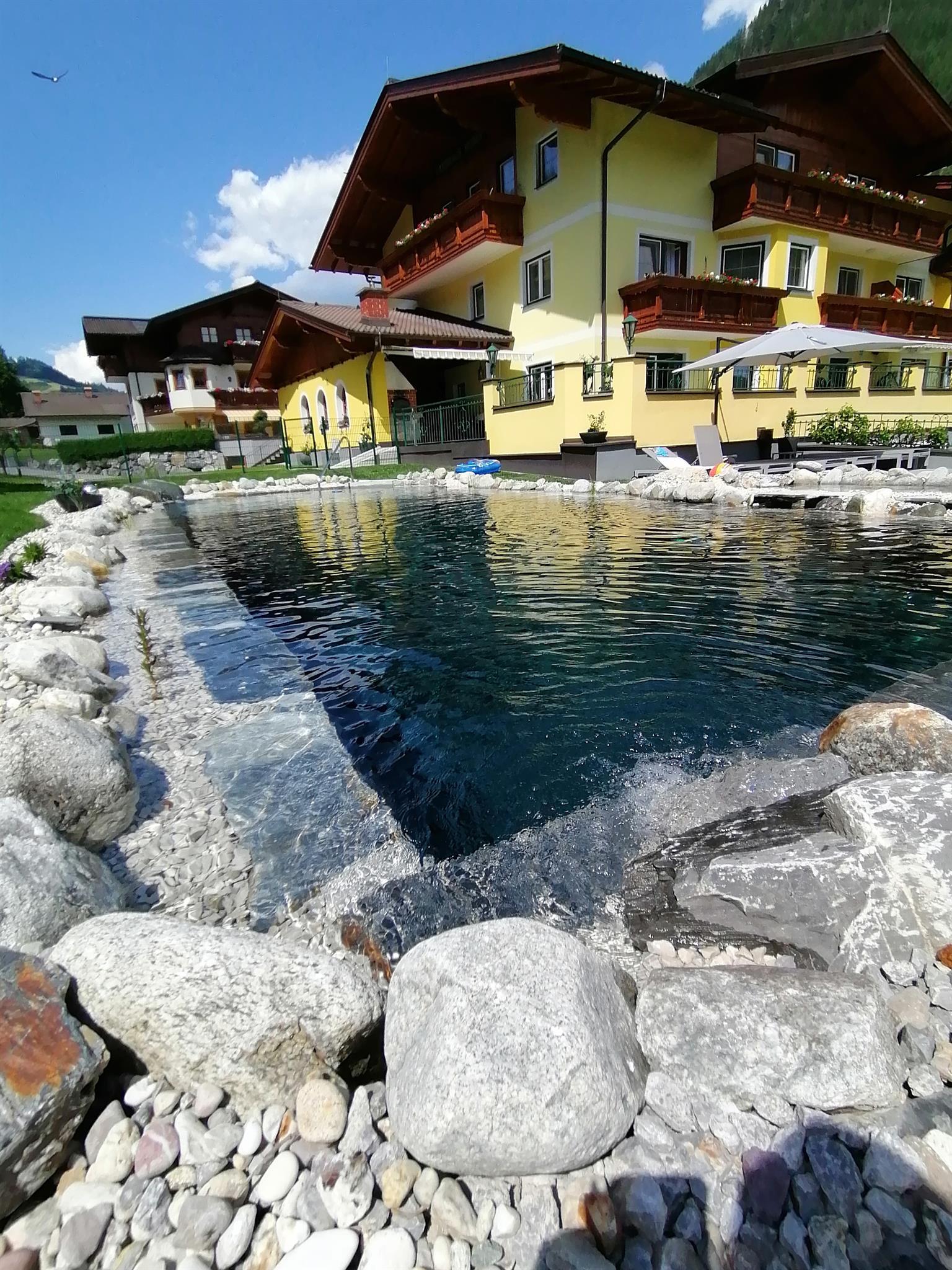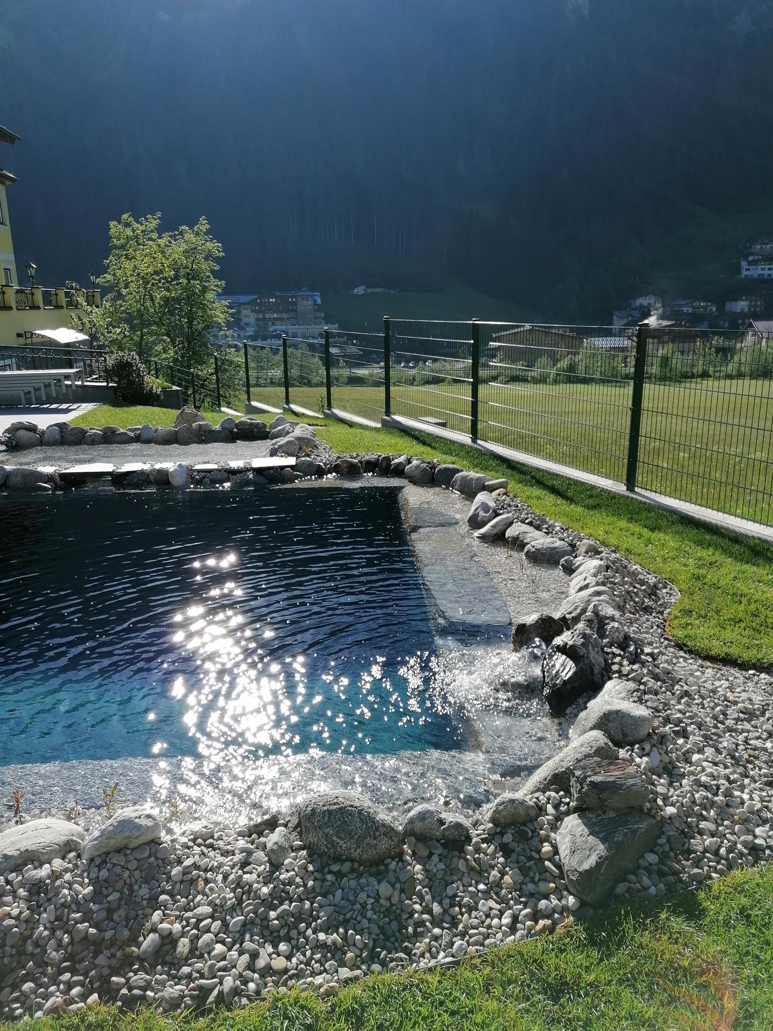 Unsere Saunalandschaft (Sauna, Infrarotkabine und Ruheraum) steht unseren Gästen im Winter kostenlos zur Verfügung. Im Sommer bietet unser Naturbadeteich eine sommerliche Erfrischung nach einem erlebnisreichen Tag in den Bergen.
