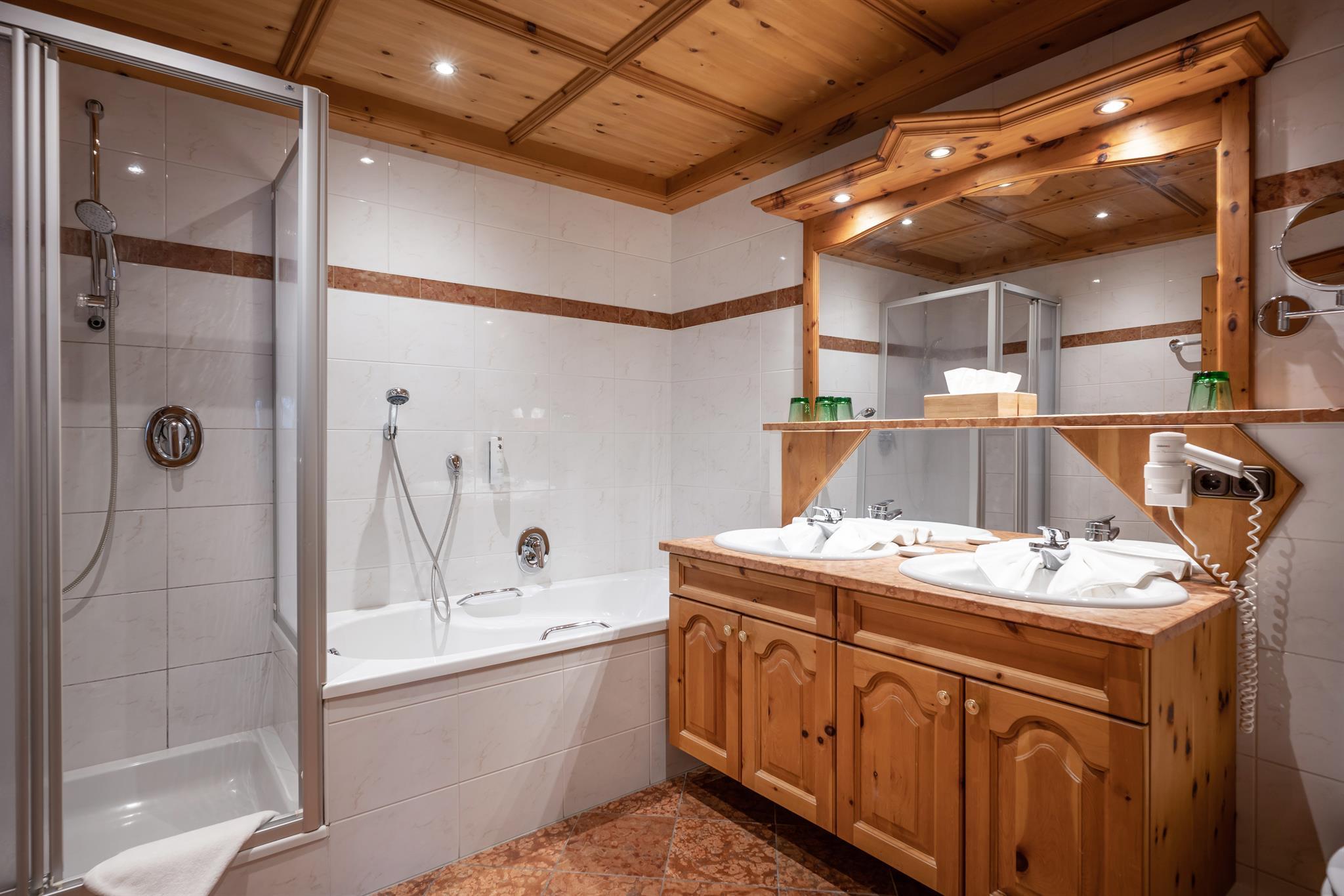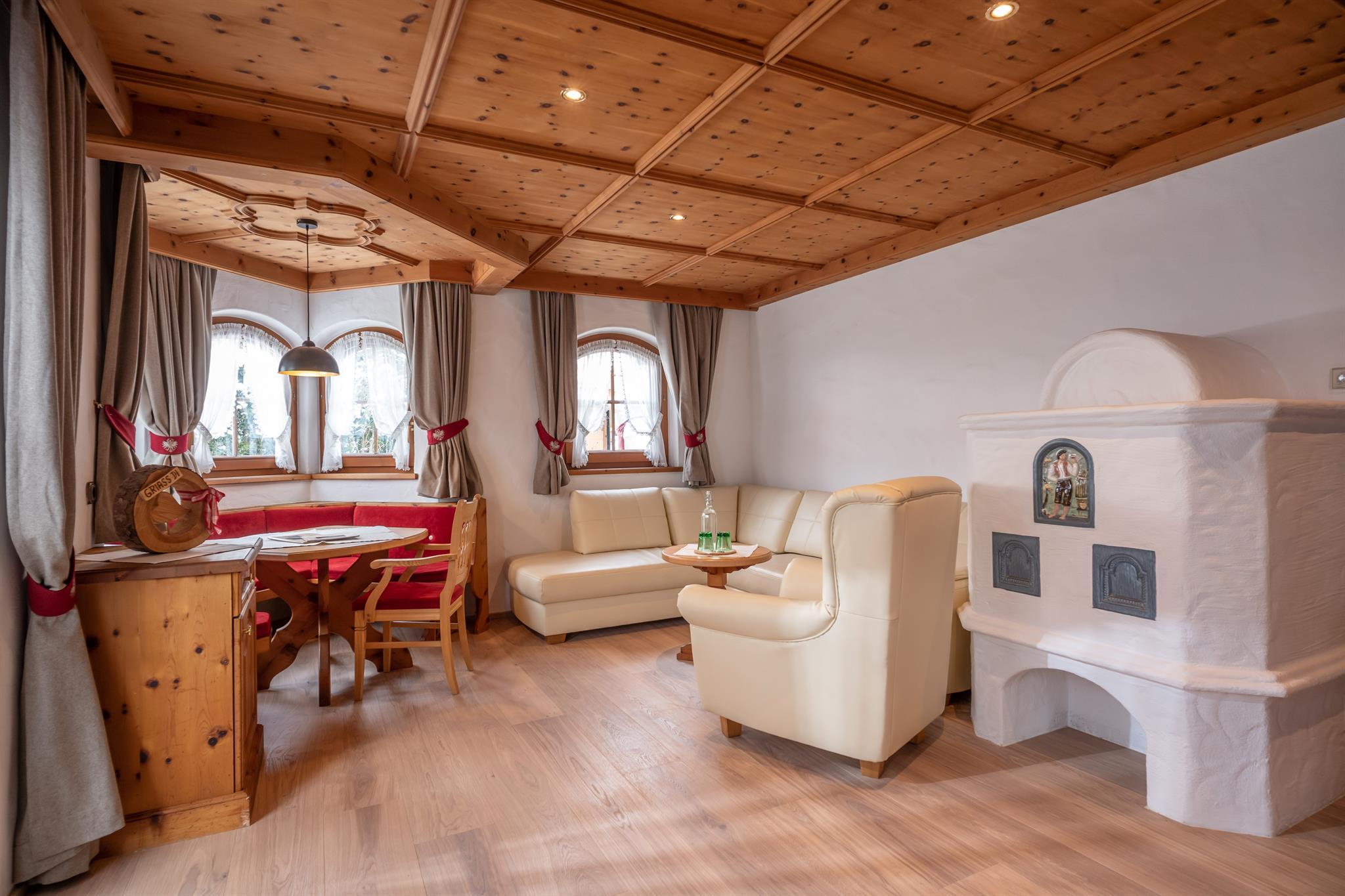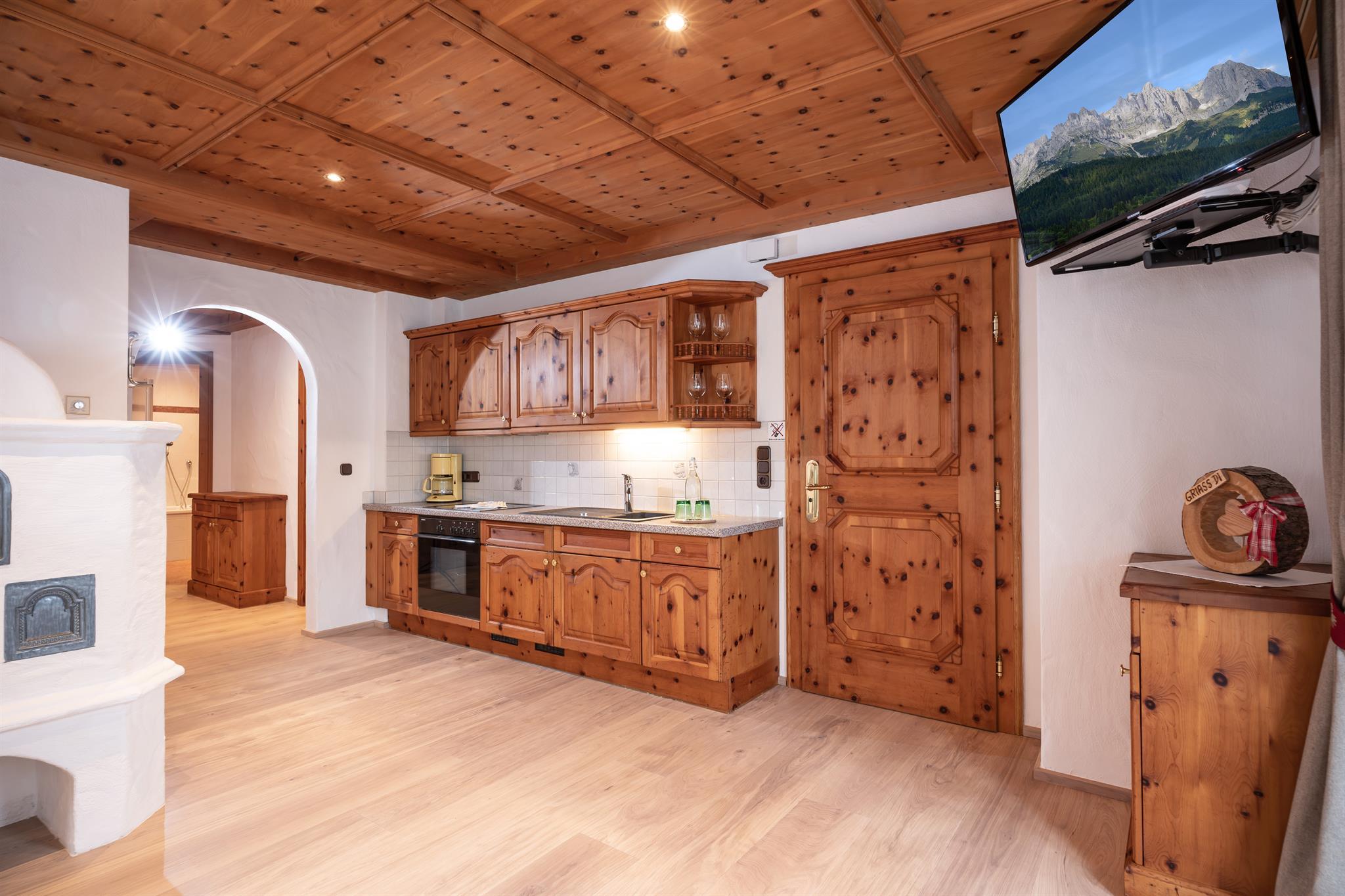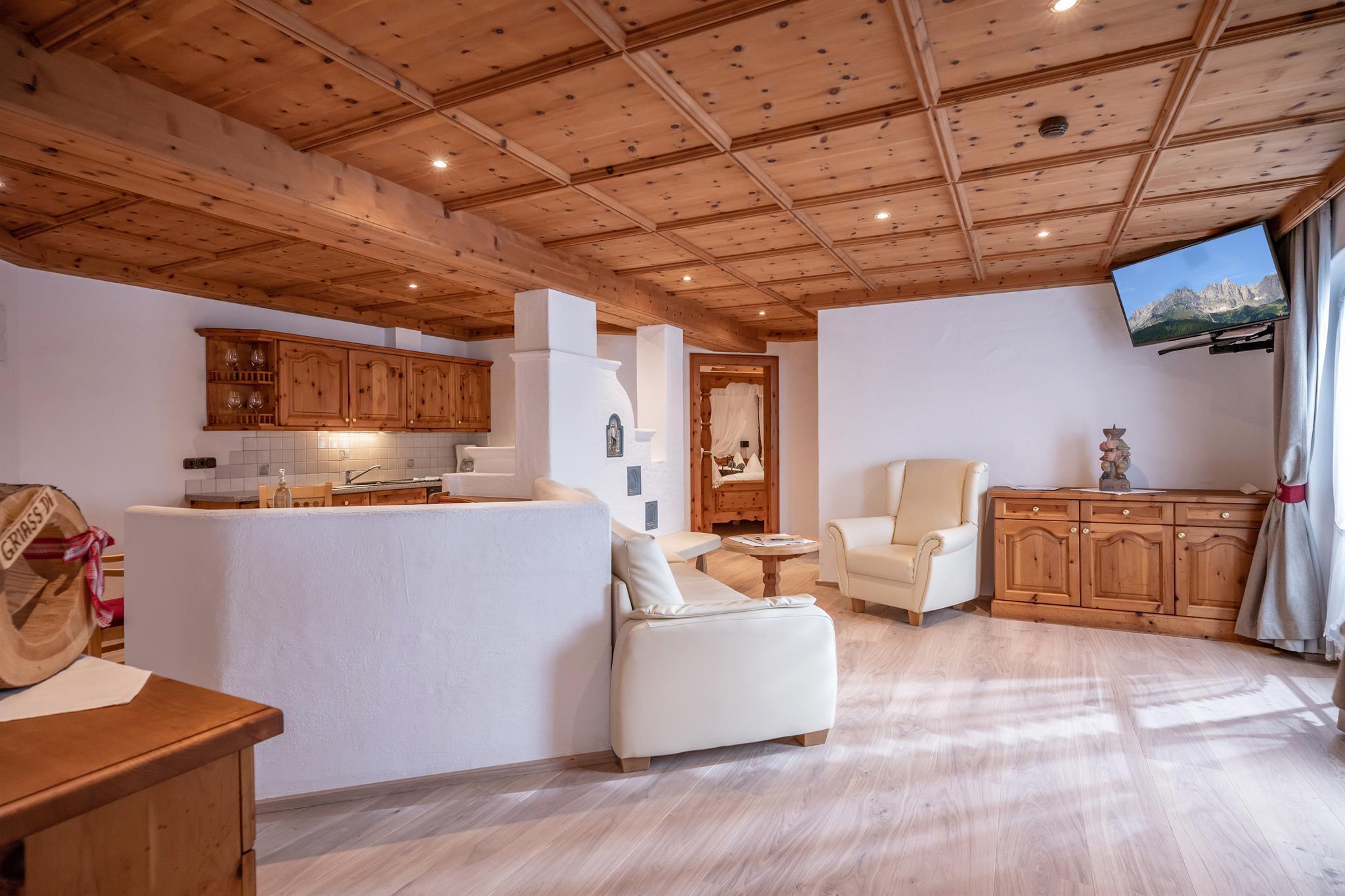 Die Kaisersuite befindet sich vom Hotel ca. 10 Meter entfernt und bietet Ihnen auf ca. 80m² Platz zum Erholen. Diese Suiten verfügen über 2 Schlafzimmer, ein großes Wohnzimmer mit Kachelofen und gemütlicher Sitzecke, komplett eingerichtete Küche, 3x Flatscreen-TV, Telefon, 1x Bad/Dusche, WC und 1x DU/WC, 2x Föhn, 2x Safe, Balkon oder Terrasse.