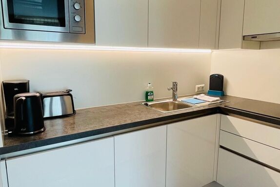 Die Wohnung mit separatem Eingang besteht aus einem Vorraum, 2 Schlafzimmern, 2 x Badezimmer, Haarfön, zusätzliche Fußbodenheizung, Wohnzimmer mit gemütlicher Couch, Kabel-TV, Radio, komplett eingerichtete Küche mit Mikrowelle, Spülmaschine, Wasserkocher, Kaffeemaschine ,