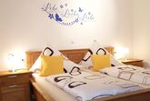 Sie besteht aus 1 Dreibettzimmer und 1Doppelzimmer, Bad und WC (sind getrennt), einer Küche und einem Ess-Wohnzimmer.