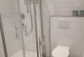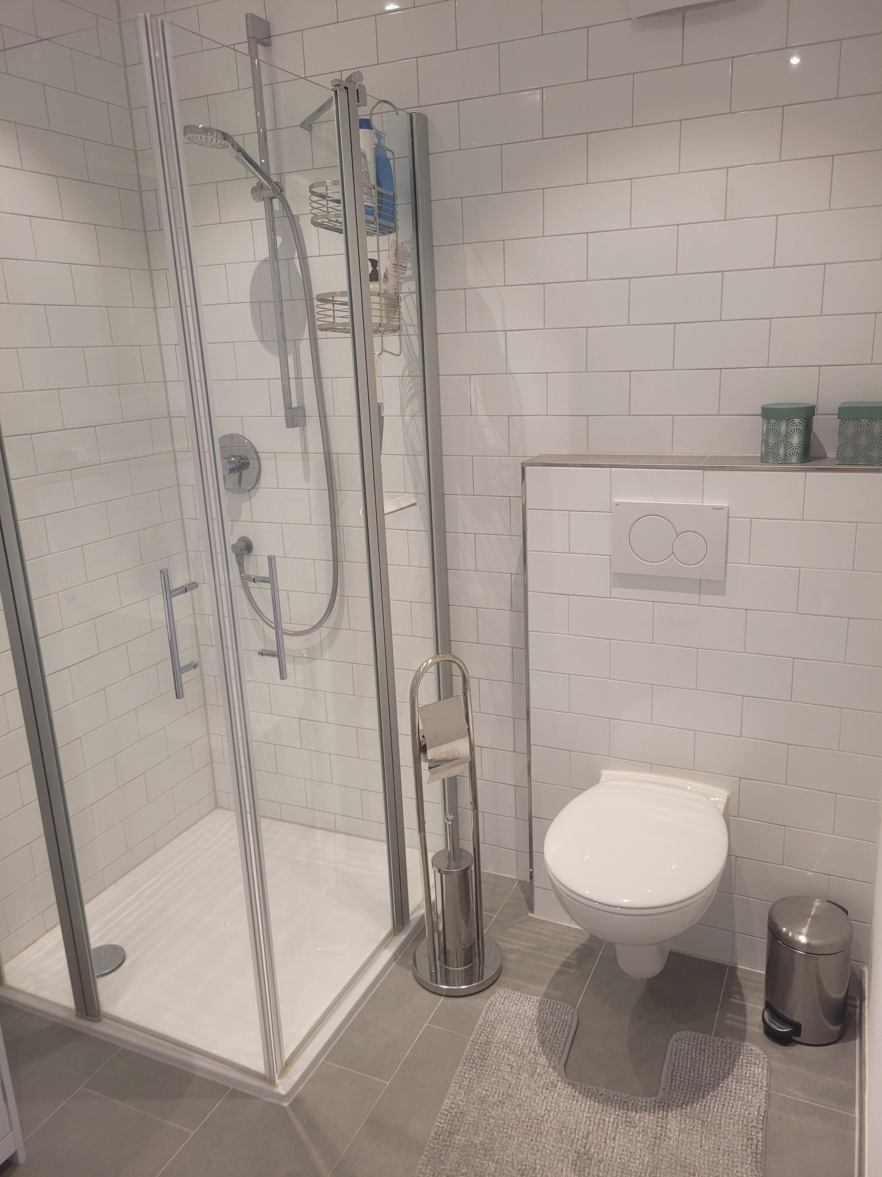 Im Badezimmer mit Dusche sind Handtücher und Fön vorhanden.