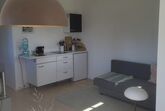 Die Wohnung hat eine kleine Essecke mit vier Sitzplätzen im lichtdurchfluteten Erker und eine Küchenzeile mit einem Doppelkochplattenherd. Außer dem Kühlschrank befinden sich in der Küche noch ein Toaster, eine Kaffeemaschine und ein kleiner Espressokocher.