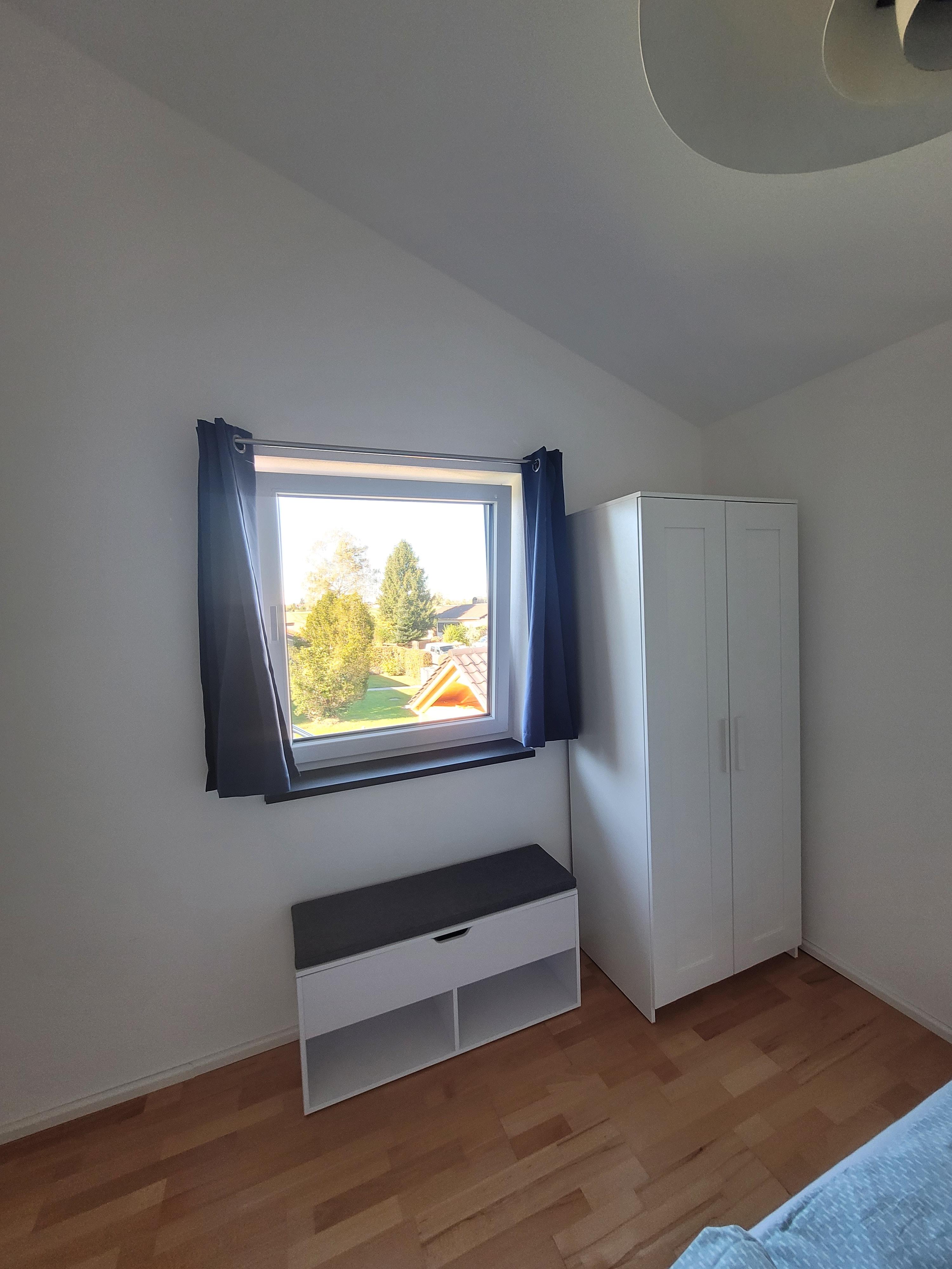 Das Schlafzimmer hält Bettwäsche und einen ausreichend großen Kleiderschrank bereit.