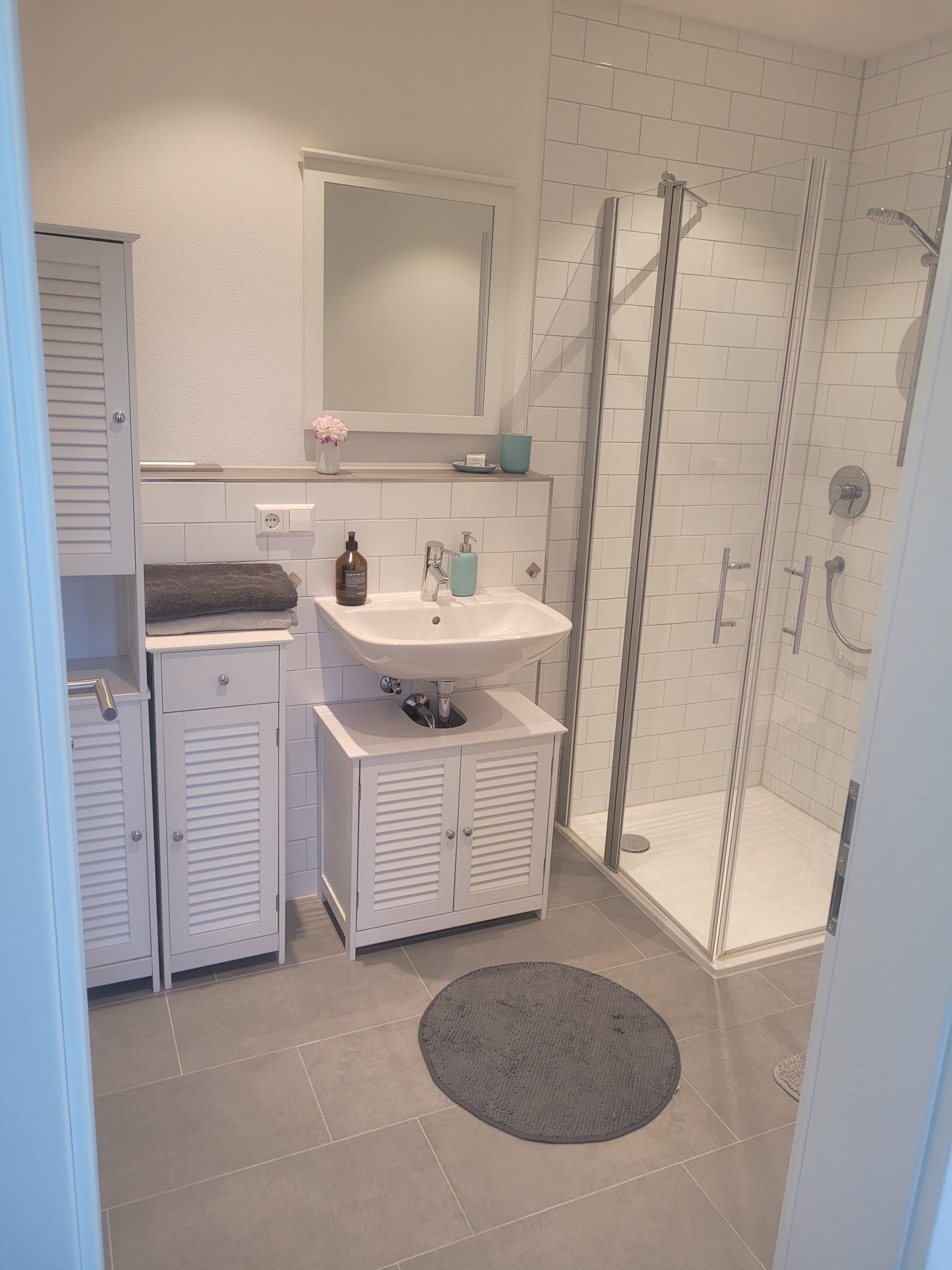 Im Badezimmer sind Handtücher und Fön, sowie Duschprodukte vorhanden.
