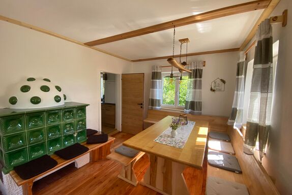 Licht und Warmwasser kommen über eine Photovoltaikanlage und mit Gas. Geheizt wird mit dem Küchenofen und Kachelofen in der Stube.