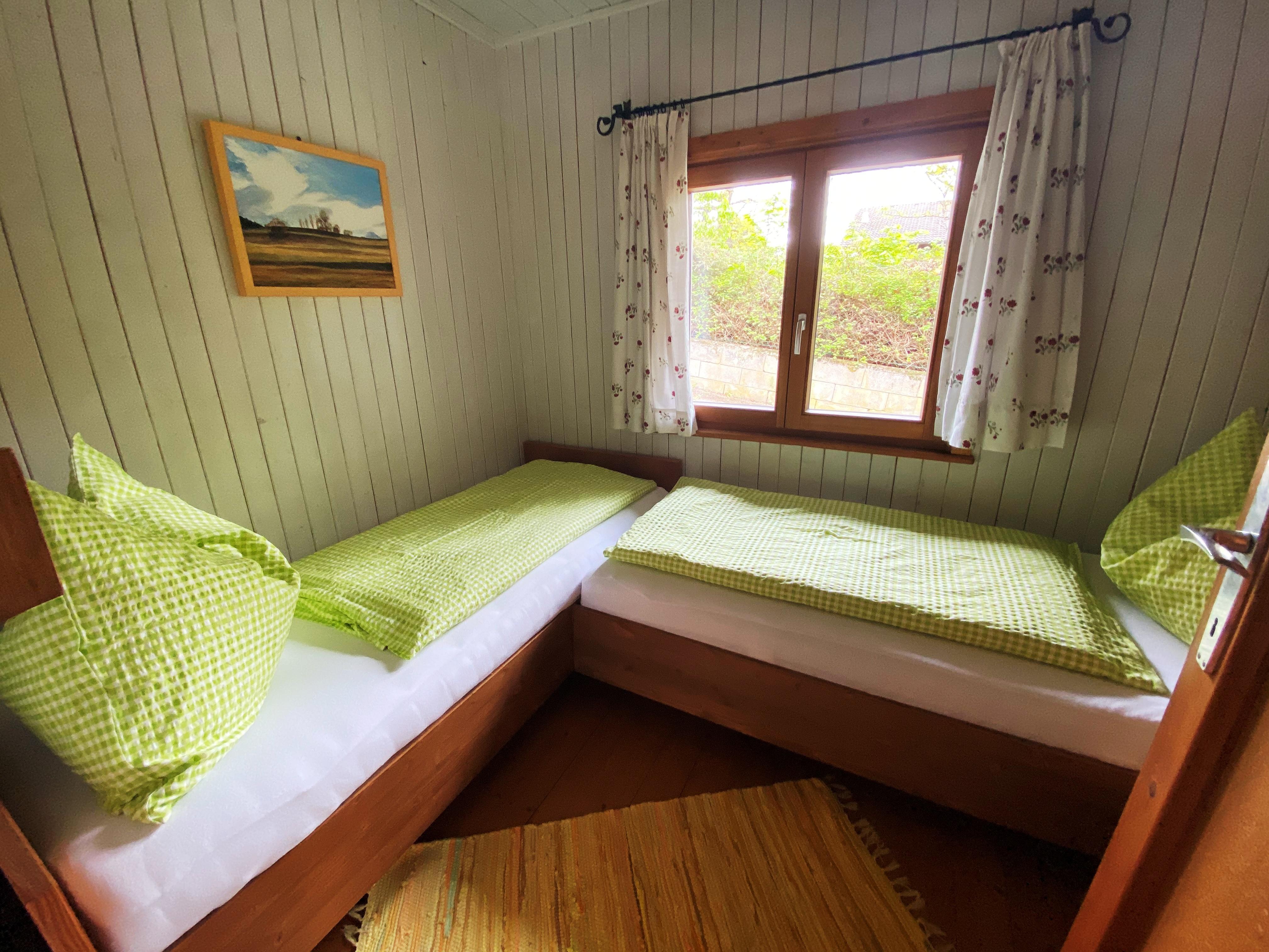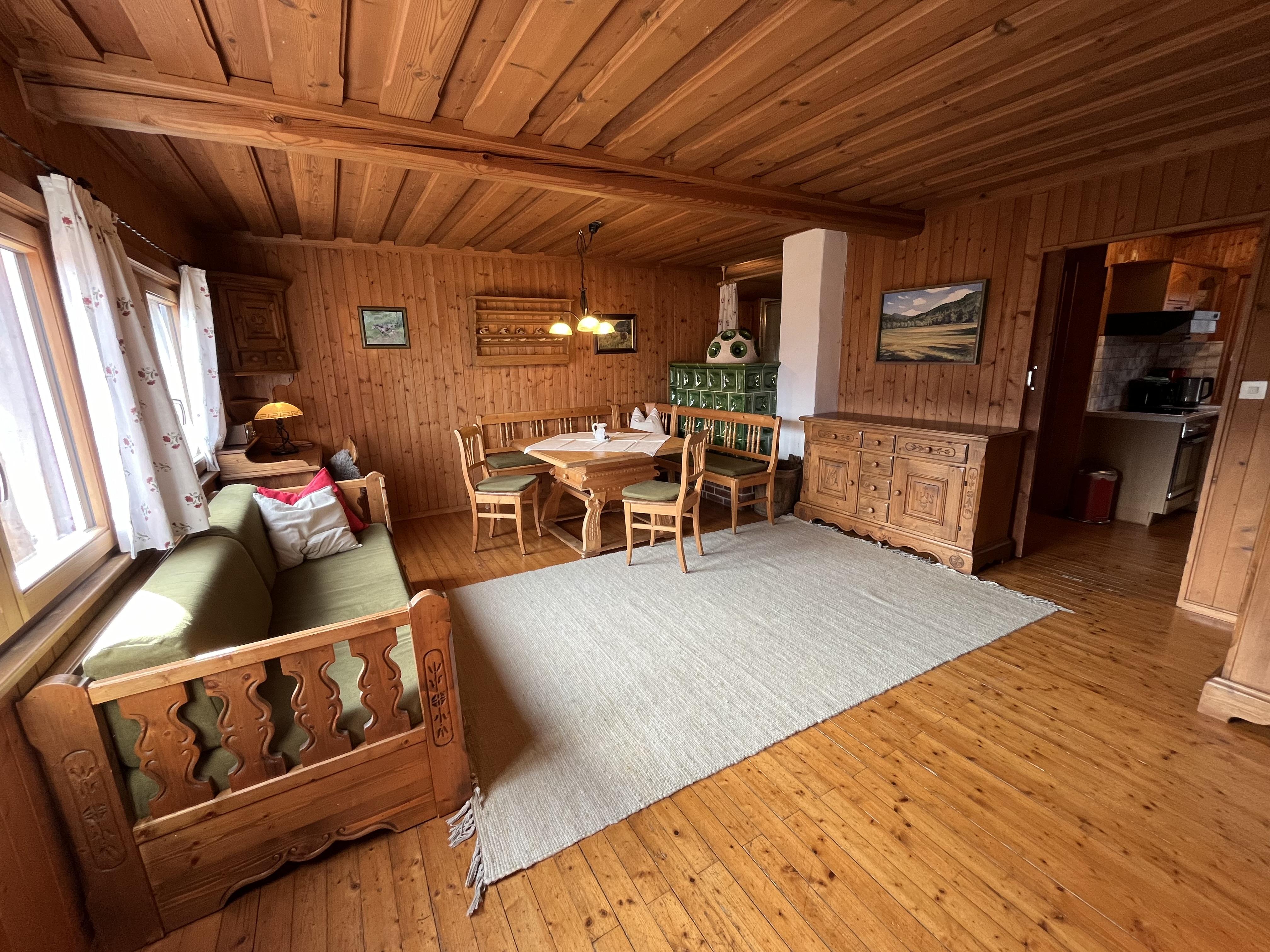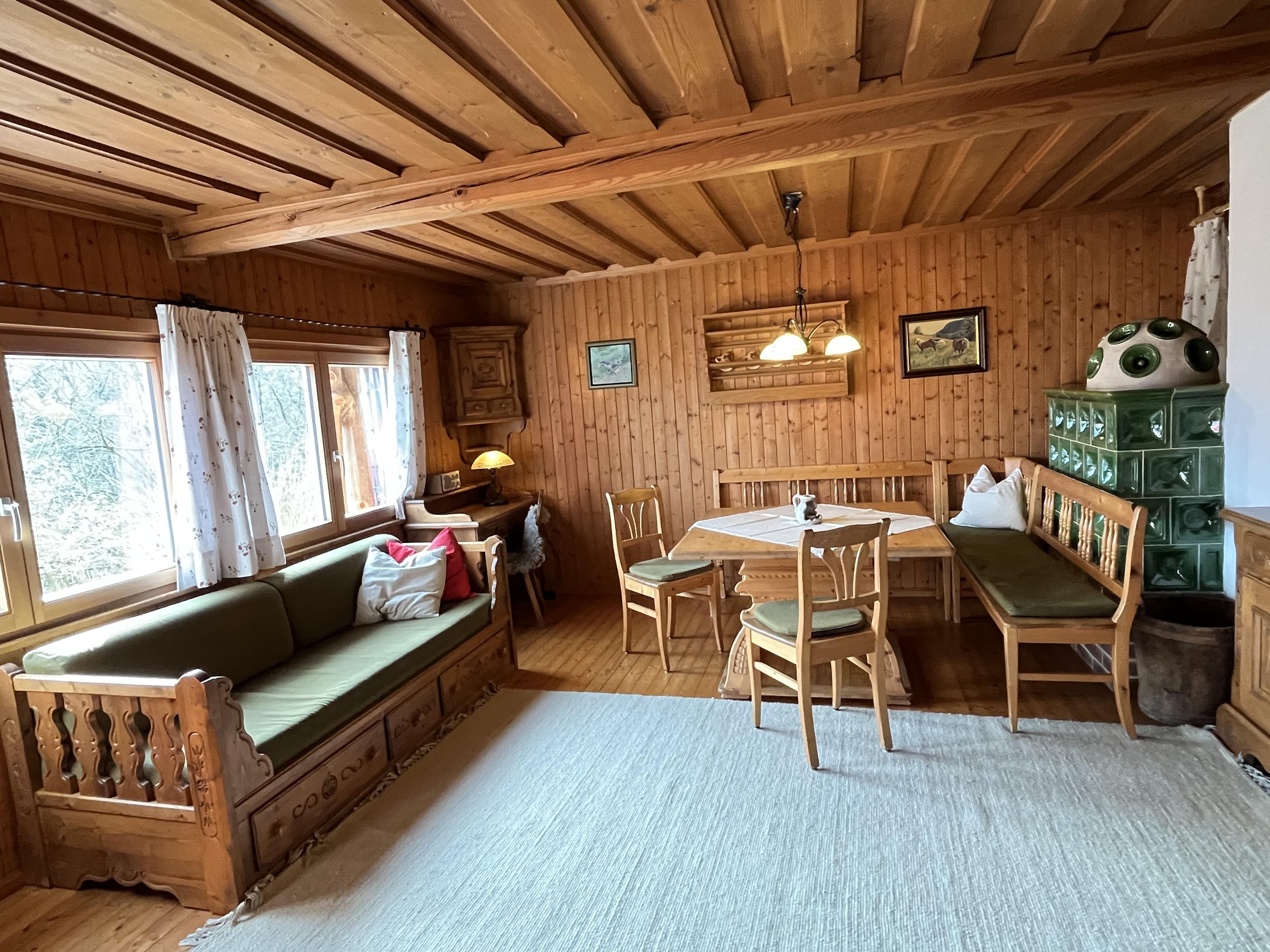 2 kleine Schlafzimmer mit je 2 Betten, ein gemütlicher Wohnraum mit Kachelofen (und genügend Brennholz für kalte Nächte), Küche und Dusche/WC. Viel Ruhe im eigenen Garten mit Gartenmöbeln und Grill oder Geselligkeit bei uns am Hof. WLan Corner finden Sie am Haupthaus, nicht in der Blockhütte.