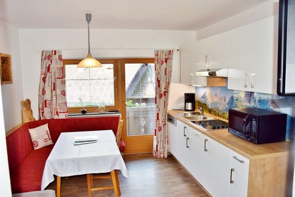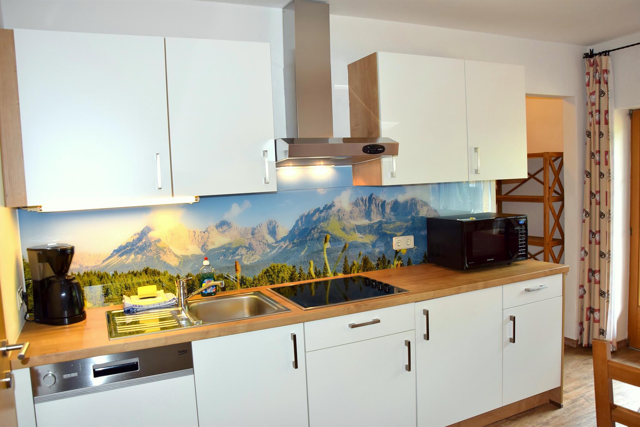 Wie alle unsere Appartements ist die Küche voll ausgestattet mit Koch- und Essgeschirr und Kaffeemaschine, ein Esstisch mit aussreichend Platz für 4 Personen und eine Liegecouch laden zum Verweilen ein. In diesem Raum befindet sich auch das Kabel TV Gerät.
