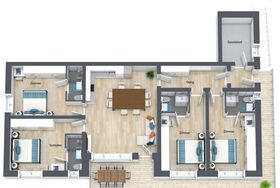 4 Schlafzimmer mit Doppelbetten - jeweils eigene DU/WC + TV (1 Babybett möglich), grosszügiger Wohn-Ess-Bereich mit voll ausgestatteter Küche (4-Platten-Herd, Doppelkühlschrank, Mikro, Senseo Kaffeemaschine u.v.m.), Terrasse mit Garten, Trampolin, Spielgeräte, Gartengrill .... Allergiefreundlich: auf Wunsch Spezialreinigung antibakteriell mit Hyla. Ebenso antibakterieller Luftreiniger möglich.