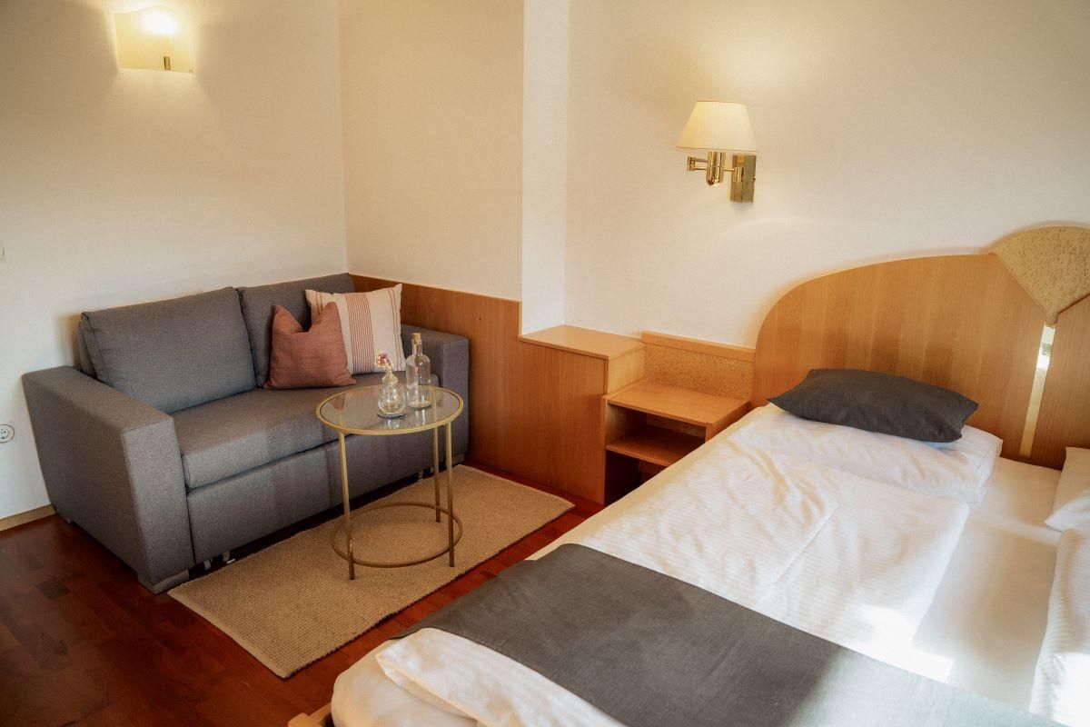 Allergenfreie Zimmer, mit Holzböden, ca. 30m². Gemütliche Sitzecke mit Minibar, Safe, Smart-TV - 42 Zoll Full HD Flatscreen,WLAN im ganzen Haus. Bademäntel und Badeschlappen am Zimmer, Dusche und Toilette getrennt. Alle Zimmer mit Balkon und Panorama - Bergblick.