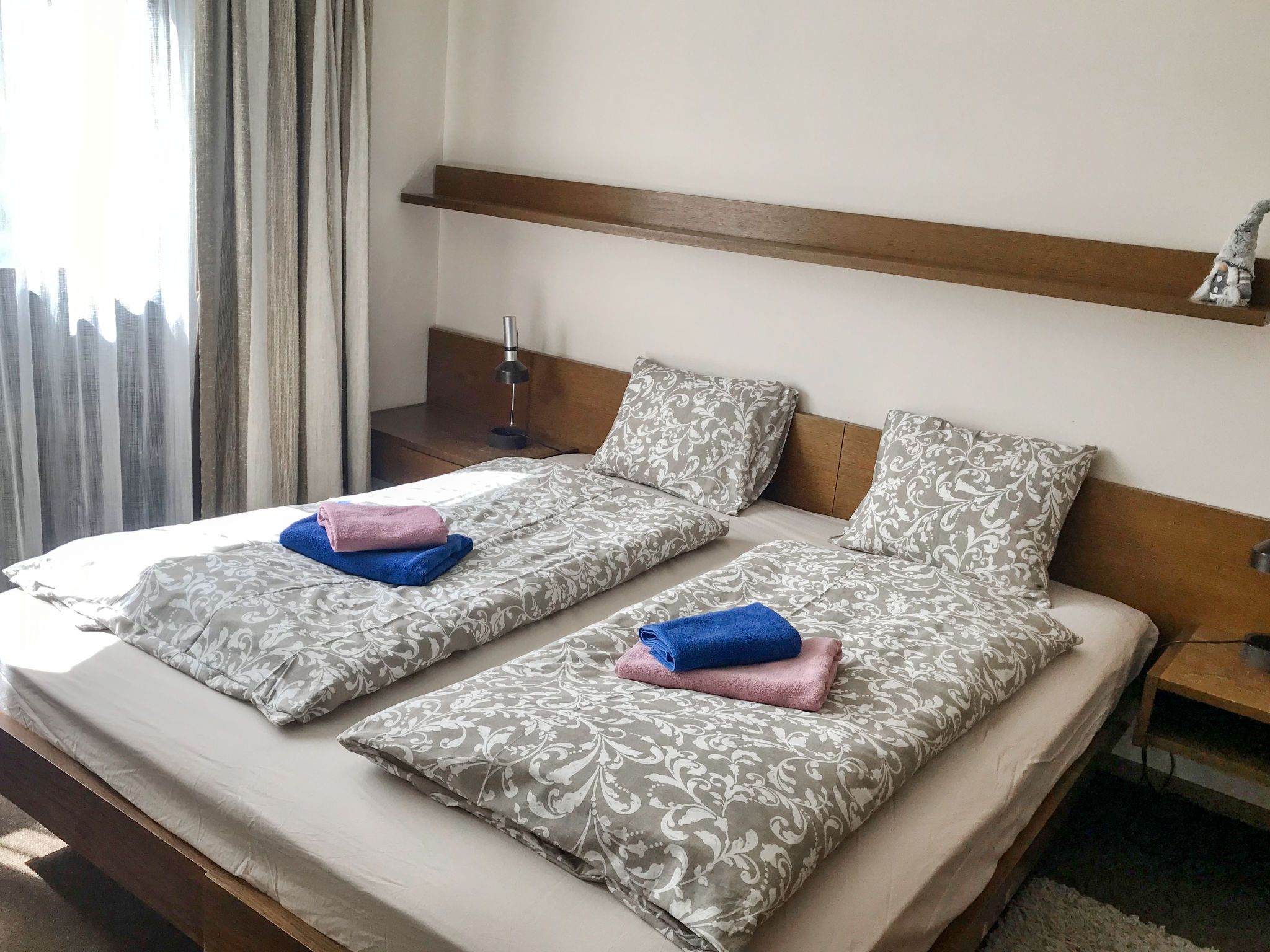 Panorama View 905, 2-Zimmer-Wohnung 49 m2 im 9. Stock. Objekt geeignet für 2 Erwachsene + 2 Kinder. Geräumig, komfortabel und gemütlich eingerichtet: Wohn-/Schlafzimmer mit 1 Diwanbett (140 cm, Länge 190 cm), Esstisch, Kabel-TV, Flachbildschirm und Radio. Ausgang zum Balkon. 1 Doppelzimmer mit 1 Doppelbett (2 x 90 cm, Länge 200 cm). Kleine Küche (4 Kochplatten, Backofen, Toaster, Wasserkocher, elektrische Kaffeemaschine, Kapseln für die Kaffeemaschine (Nespresso) extra). Bad/WC. Kleiner Balkon, Südlage und Westlage. Balkonmöbel. Herrliche Panoramasicht auf die Berge, die Landschaft und die Ortschaft. Zur Verfügung: Haartrockner. Internet (Wireless LAN, gratis). Bitte beachten: Nichtraucher-Unterkunft. Maximal 1 Haustier/Hund erlaubt.