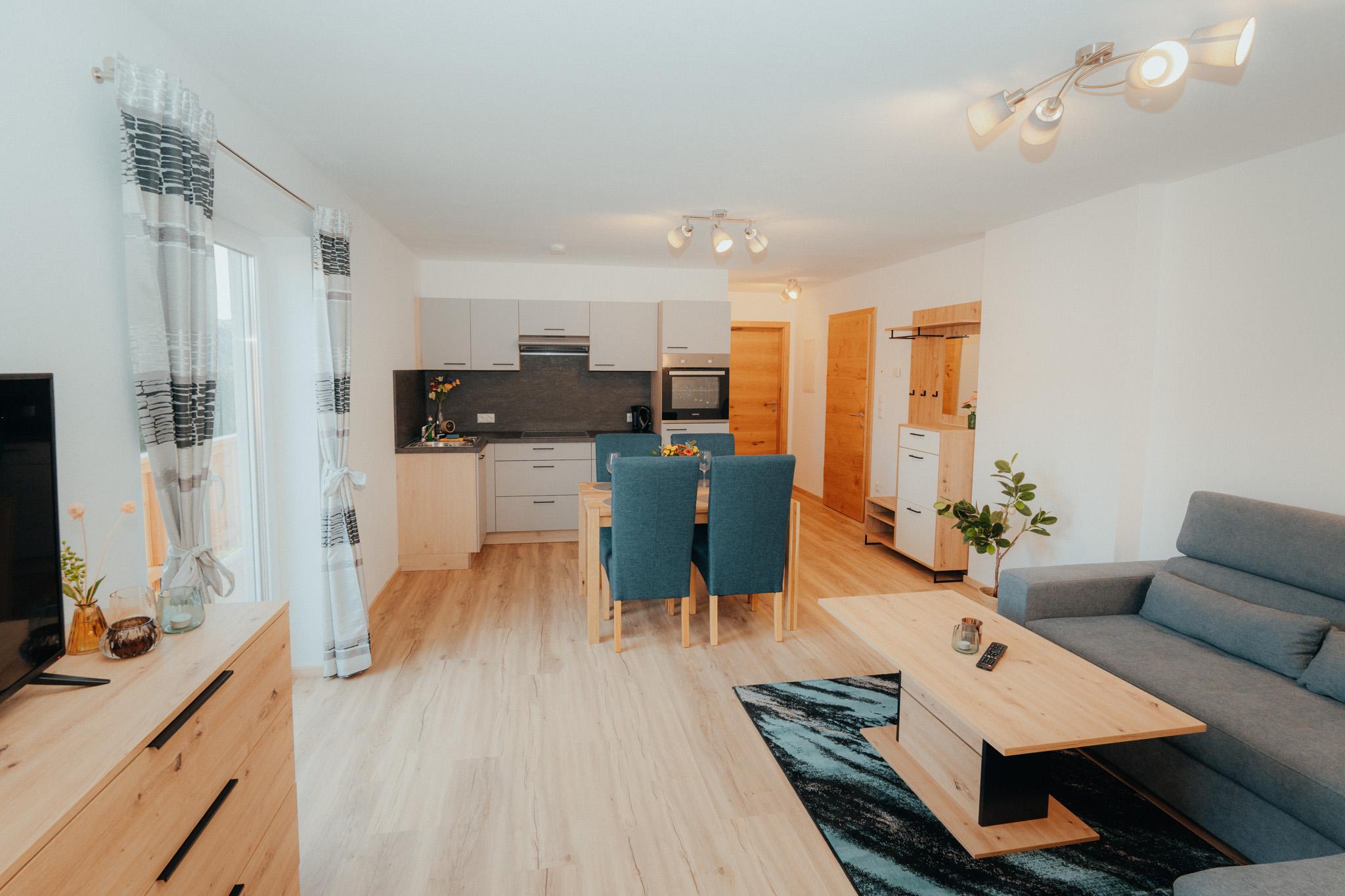 Diese geräumige Wohnung bietet 55m² Wohnfläche und ist in zwei Schlafzimmer aufgeteilt. Das erste Schlafzimmer verfügt über ein komfortables Boxspringbett und einen geräumigen Kleiderschrank. Das zweite Schlafzimmer ist als Kinderzimmer eingerichtet und bietet eine Schlafcouch sowie einen weiteren Kleiderschrank. Die Wohnküche ist mit einer Garderobe, einer gemütlichen Wohnlandschaft und einer Wohnwand inklusive Fernseher ausgestattet. Die Küche selbst ist voll ausgestattet und verfügt über einen E-Herd, einen Kühlschrank, einen Geschirrspüler und einen Dunstabzug. Das Badezimmer bietet eine Dusche, ein WC und einen Handtuchtrockner. Ein besonderes Highlight ist die Fußbodenheizung, die in der gesamten Wohnung für angenehme Wärme sorgt. Zudem gibt es einen großen Balkon mit Sitzmöglichkeiten, auf dem man die frische Luft genießen kann.