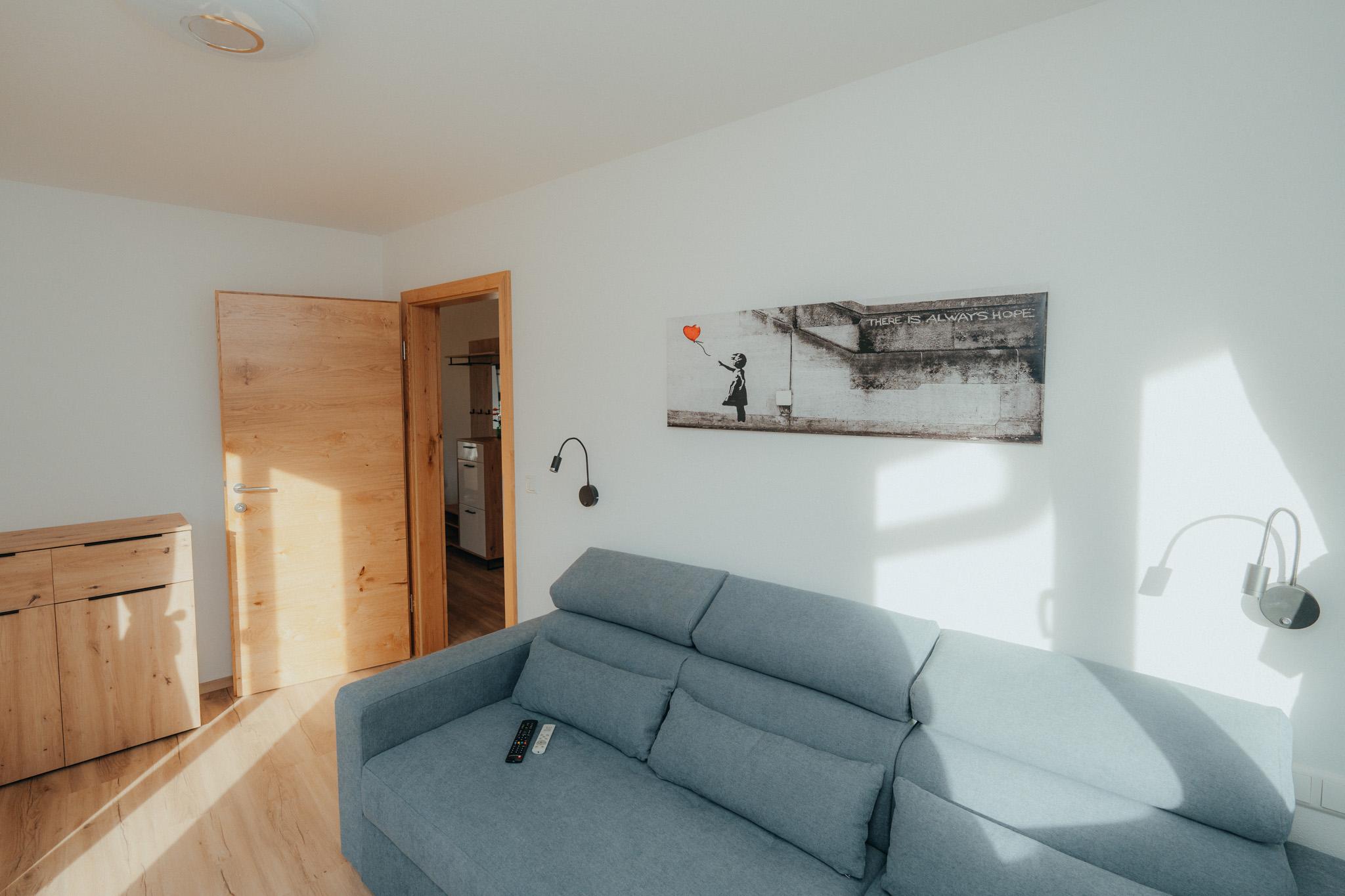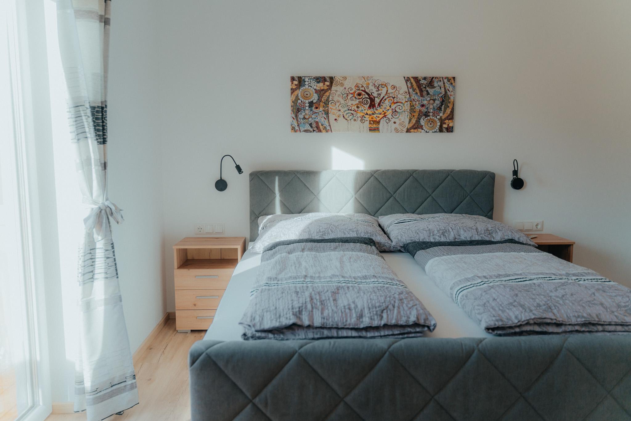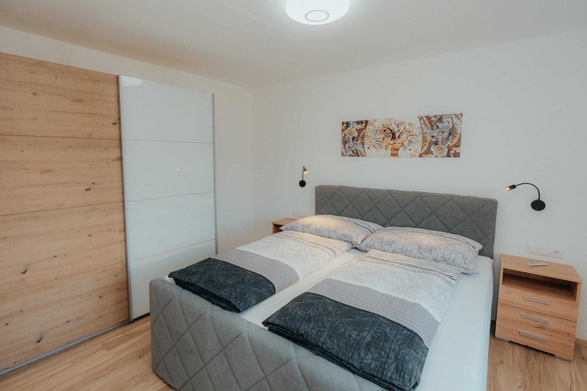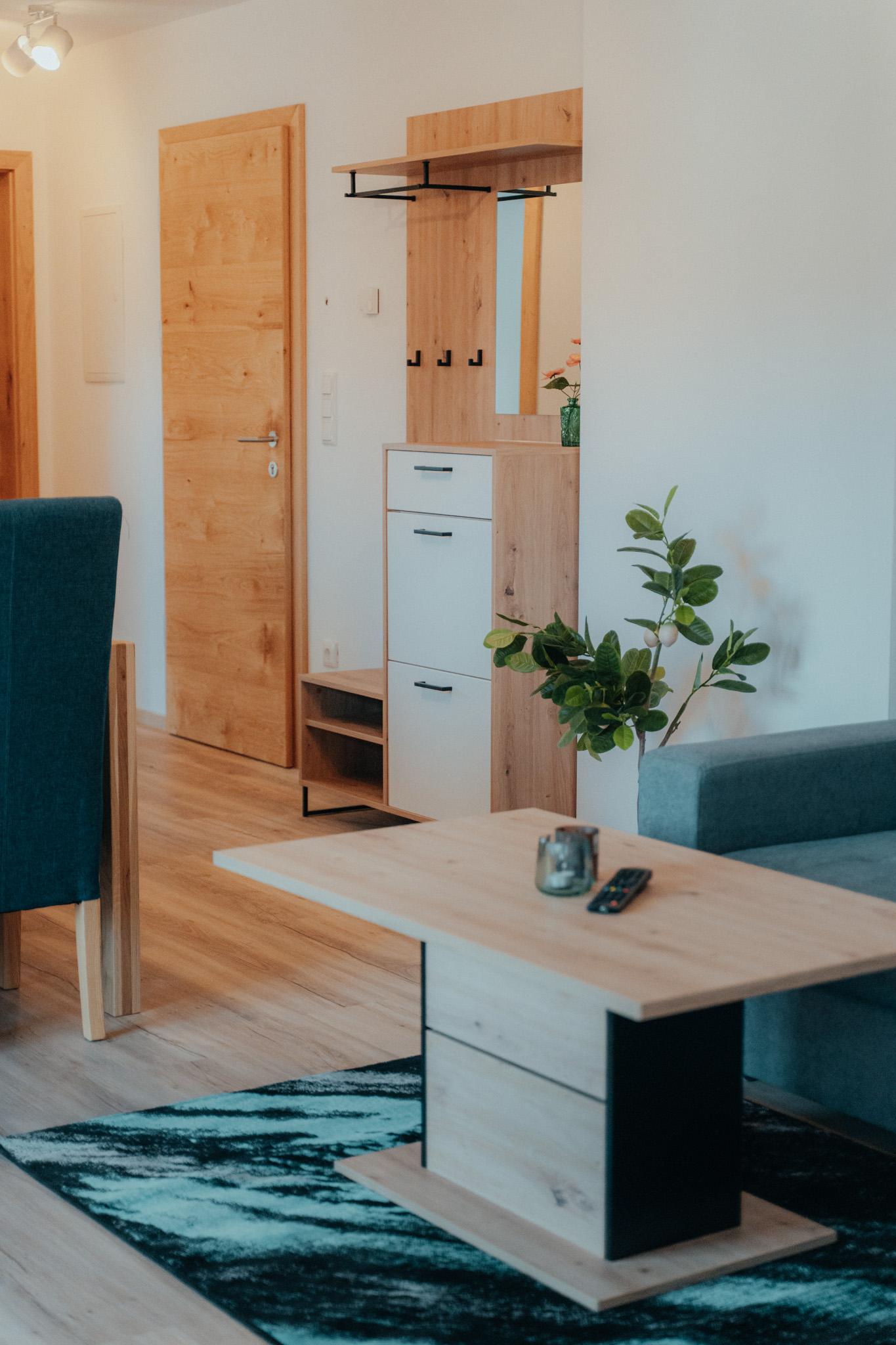 Die Wohnung hat eine Gesamtfläche von 58m² und ist in zwei Schlafzimmer mit Boxspringbetten und Kasten aufgeteilt. Es gibt auch eine Wohnküche mit einer Couch und einem Fernseher sowie einer Sitzgruppe für 4 Personen. Die Küche ist voll ausgestattet mit einem Kühlschrank, Geschirrspüler, E-Herd, Dunstabzug und anderen Geräten. Eine Garderobe ist ebenfalls vorhanden. Die gesamte Wohnung verfügt über eine Fußbodenheizung und einen großen Balkon mit Sitzmöglichkeiten. Das Badezimmer ist mit einer Dusche, einem WC und einem Handtuchtrockner ausgestattet.