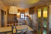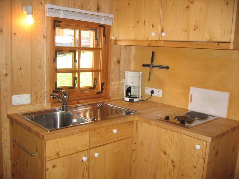 Der Wohnraum ist mit einer kleinen Kochnische ausgestattet, in der ein Plattenherd und ein Kühlschrank mit einem kleinen Gefrierfach vorhanden ist. Es gibt keine Spülmaschine. Toaster, Wasserkocher und Koch- und Essgeschirr ist vorhanden.