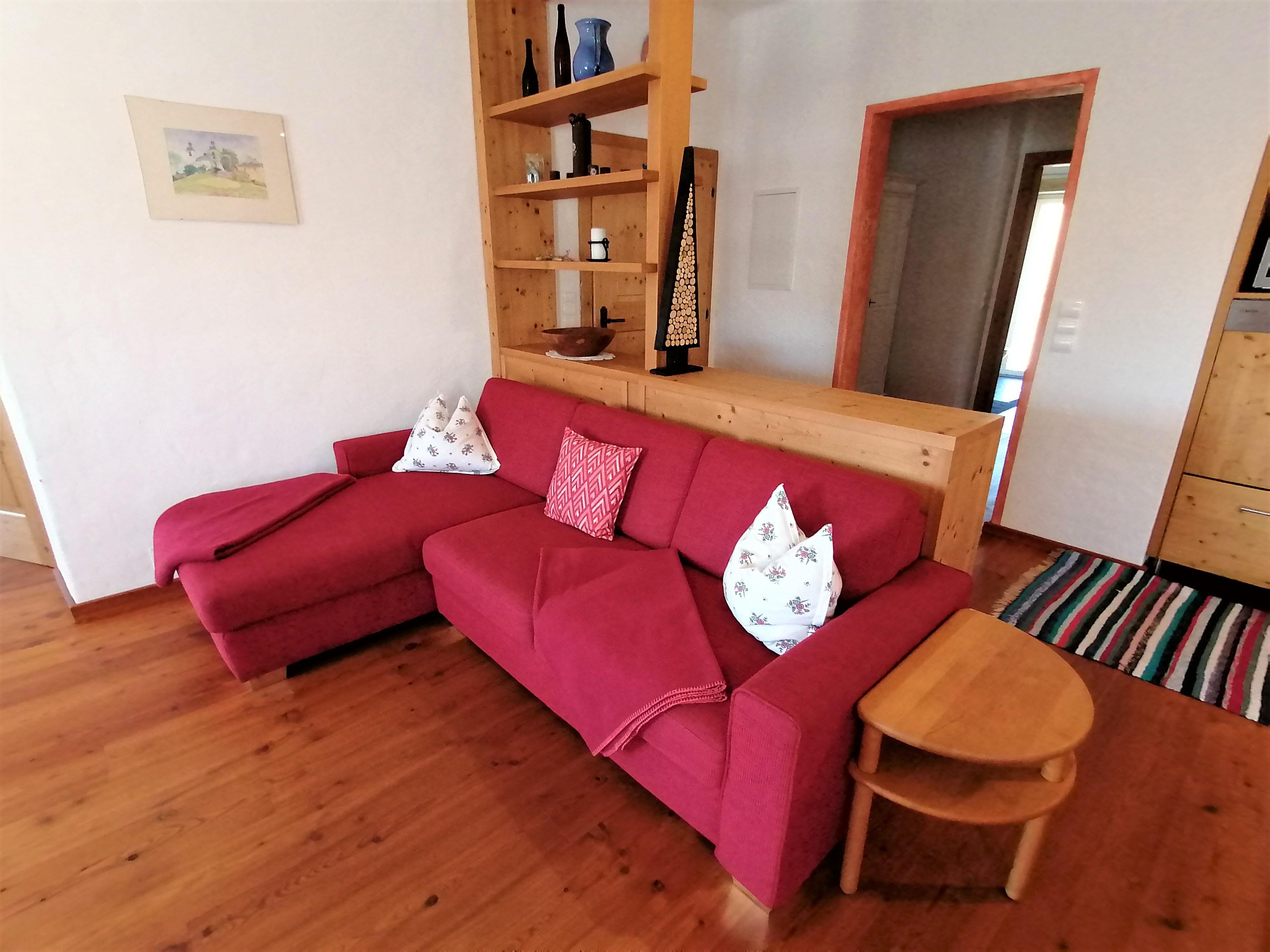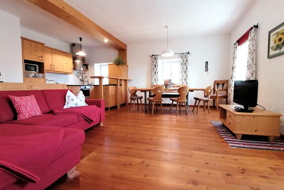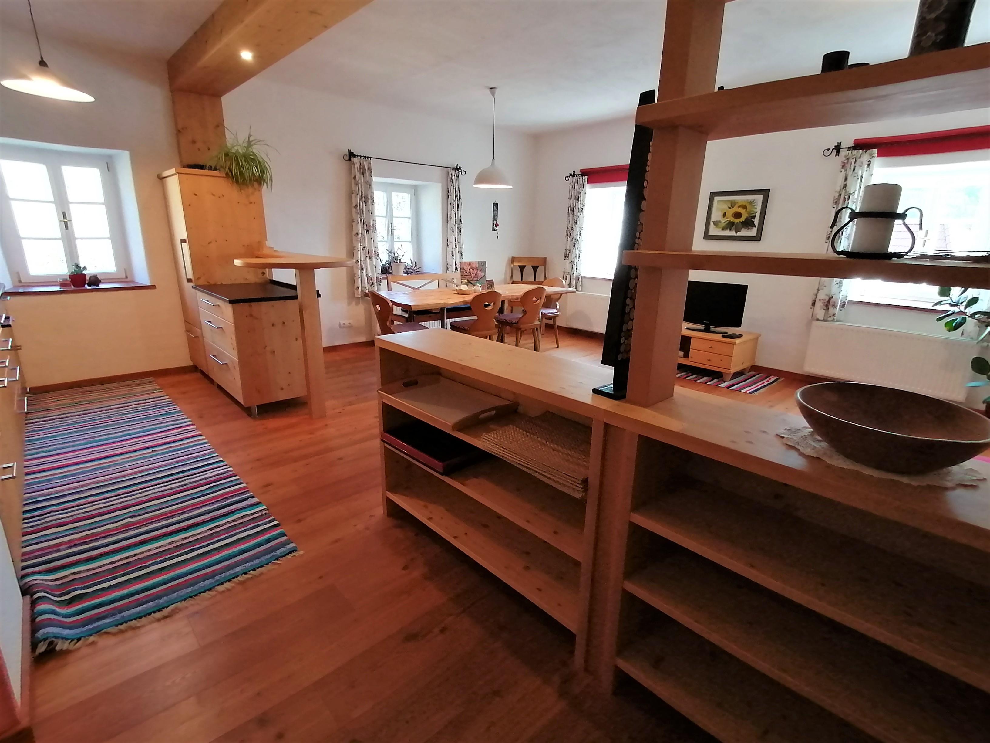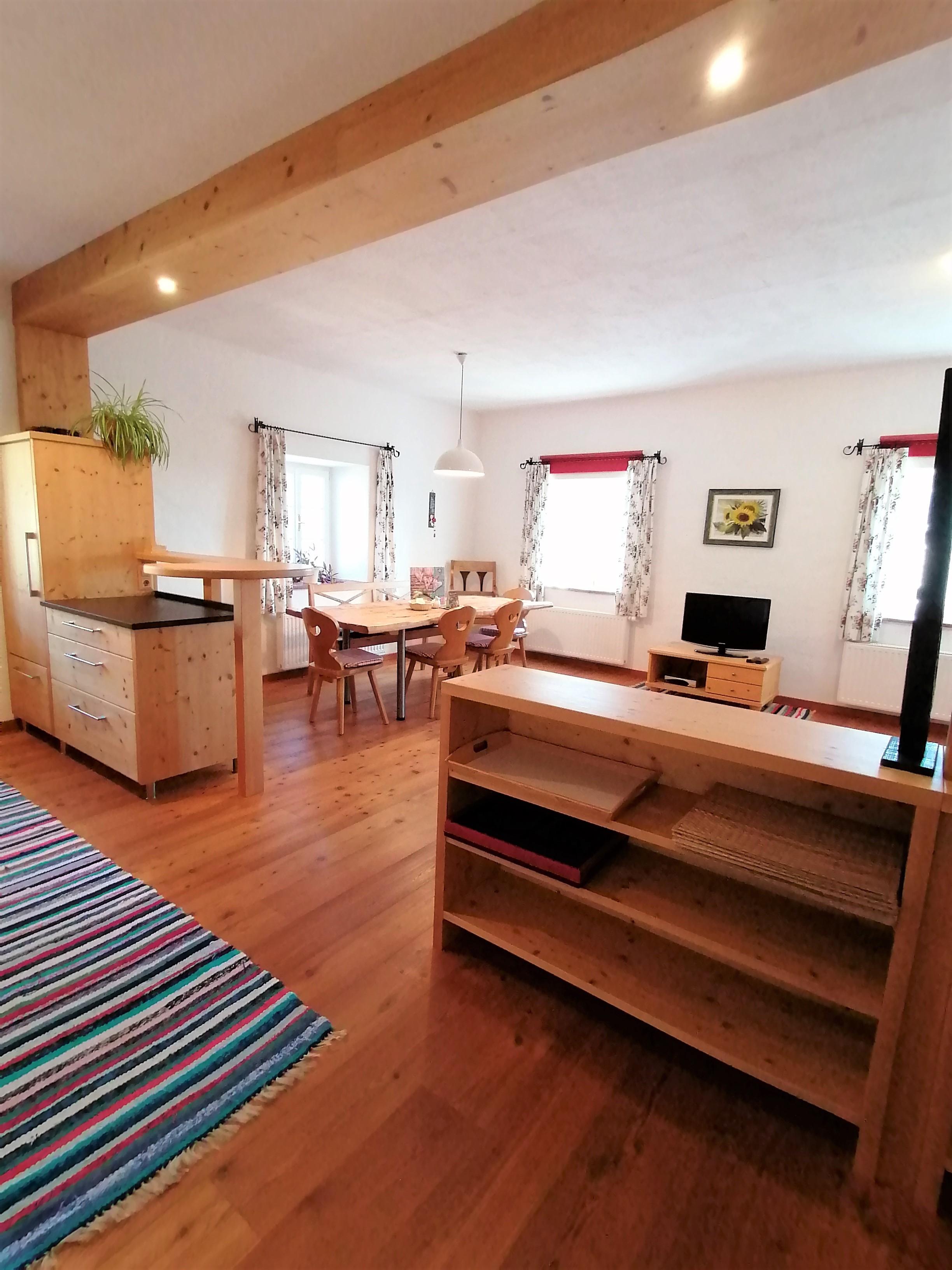 Das Appartement wurde 2014 sehr großzügig errichtet, ist liebevoll und komfortabel mit Möbel und Böden in Massivholz ausgestattet und liegt im 2. Stock unseres „Haupthauses“. Die Wohnung verfügt über eine sehr große, voll ausgestattete Küche mit Kühlschrank plus Gefrierfach, Geschirrspüler, Mikrowelle, E-Herd plus Ceranfeld, Filter-Kaffeemaschine und Wasserkocher, einem Schlafzimmer mit Doppelbett und einem Schlafzimmer mit Stockbett und Couch, einem großen Wohn- und Essbereich mit Fernseher sowie einem Bad mit französischem Balkon, Dusche und WC.