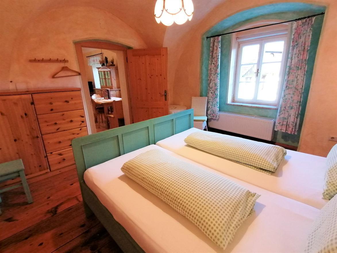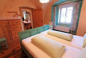 Über eine urige Außenstiege kommt man in das kleine Apartment Gartenblick. Der eigene Zugang dient auch als Balkon. Kleiner Vorraum mit Koch-Nische, DU/WC. Schlafzimmer mit großem Doppelbett, ausziehbarer Couch und einem Tisch. Mit viel Liebe eingerichtet konnten wir ein wenig Seinerzeit erhalten.