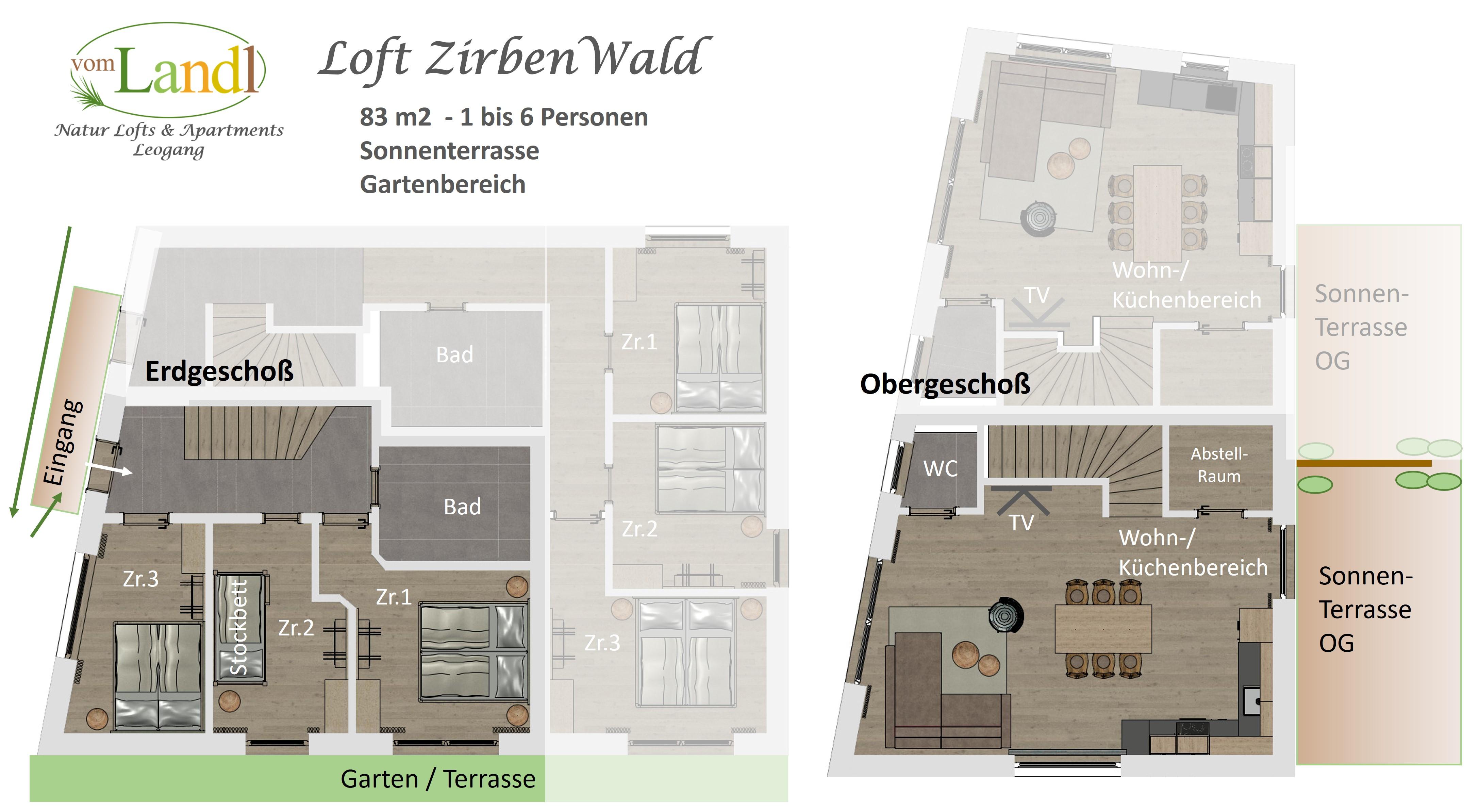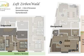Es erwarten dich zwei Natur Lofts (ZirbenWald 83 m2, FichtenWald 85 m2) mit gemütlichem Ambiente auf 2 Etagen mit viel natürlichem Holz und ein Natur Apartment EschenWald mit 103 m2 mit Kachelofen und Landhausküche, alles im Erdgeschoß mit großzügigem Garten.