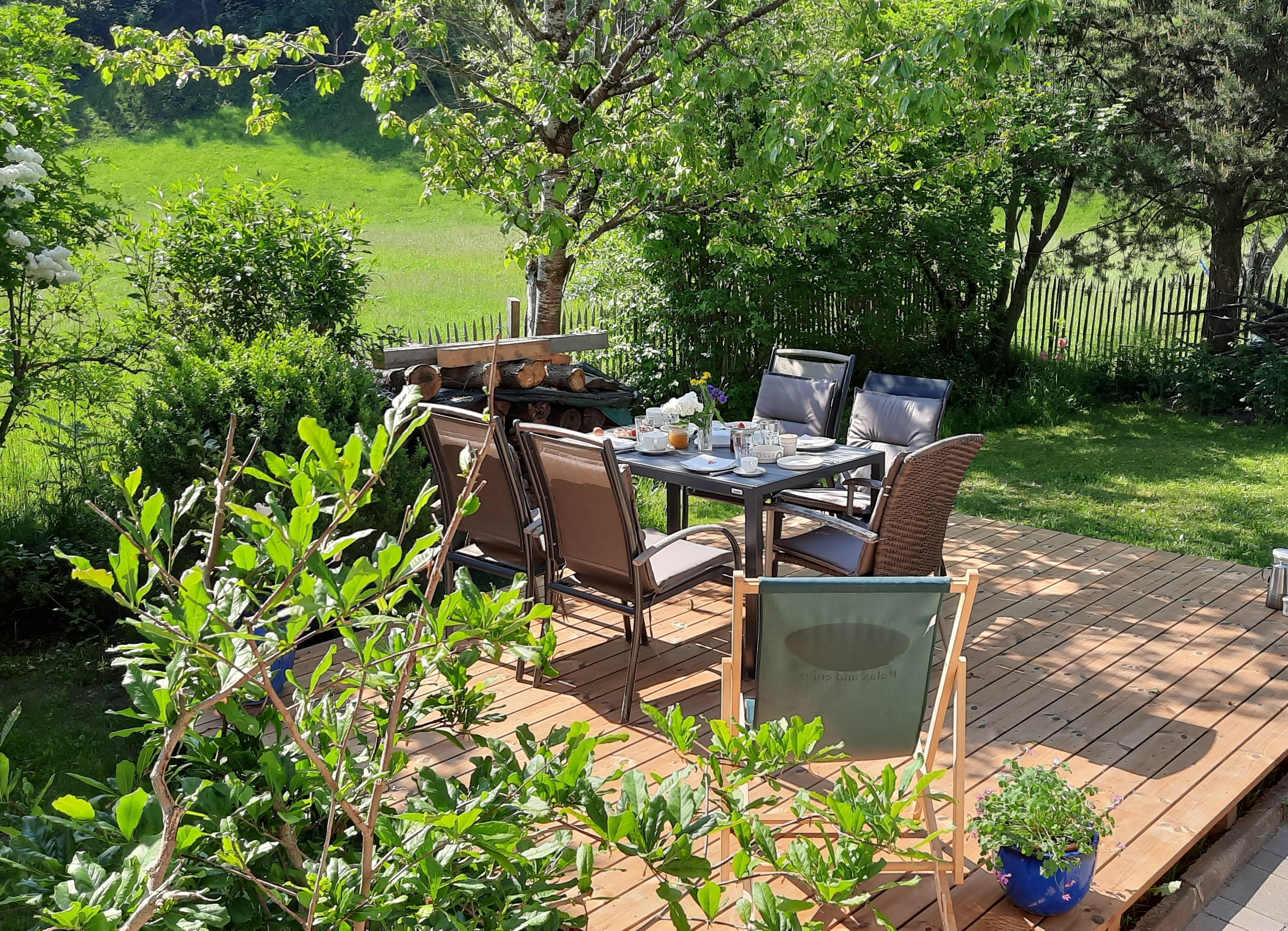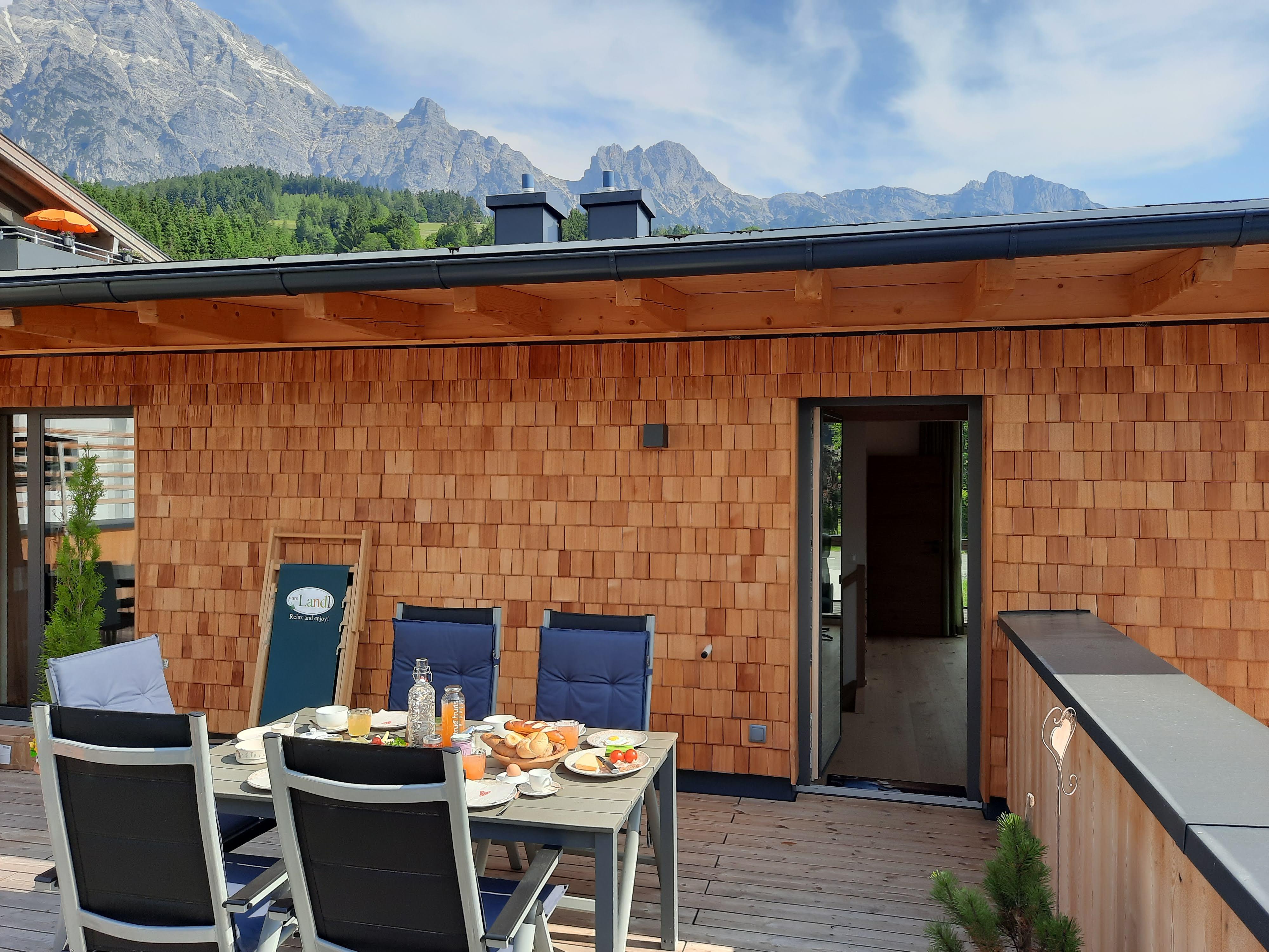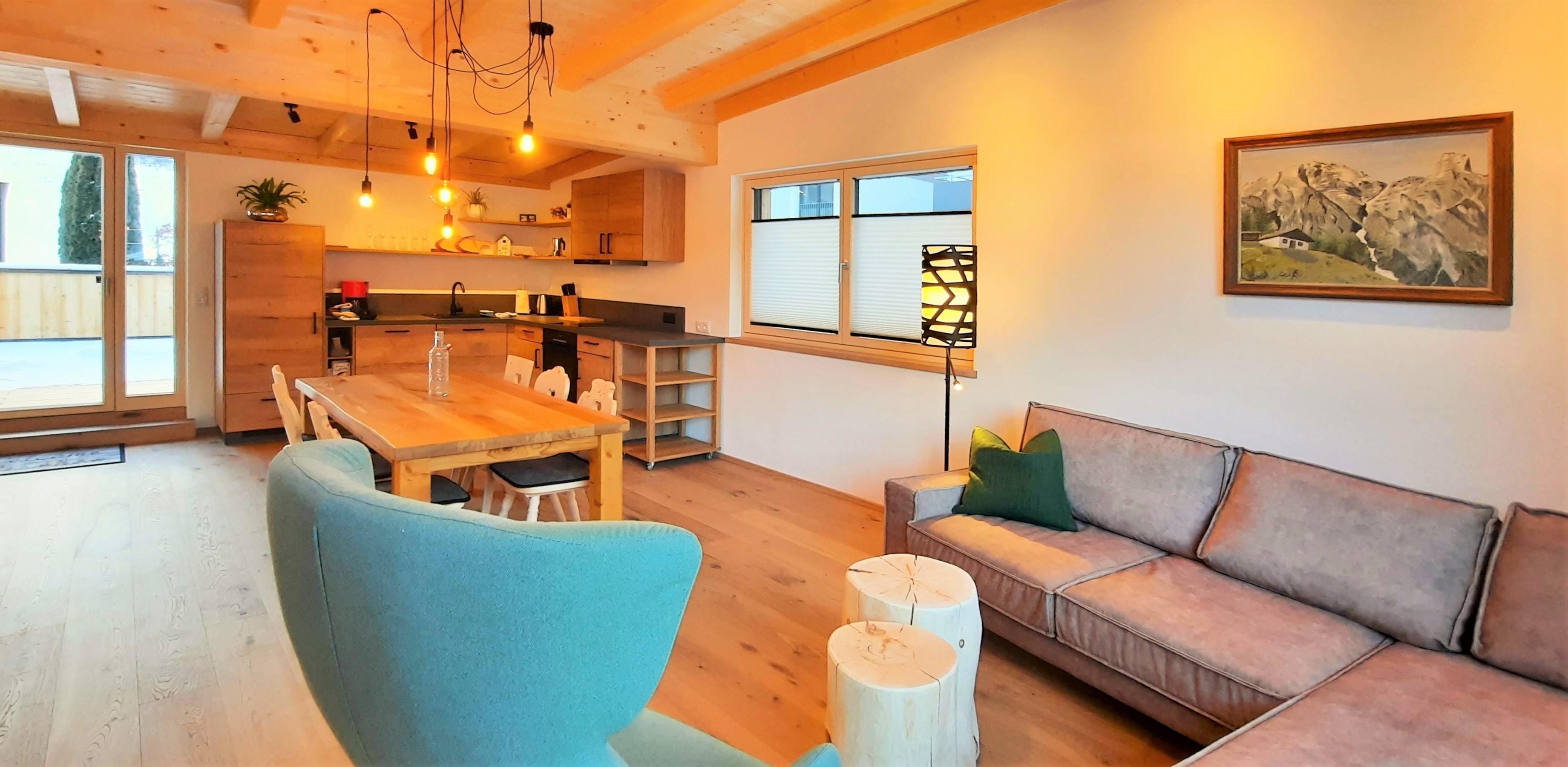 Die naturbelassene Fichtenholzdecke und ein gemütliches Ecksofa aus Naturleinen laden zum Chillen und Genießen des Ausblicks ein. Panoramafenster auf die Leoganger Steinberge. Eigene Sonnenterrasse mit Esstisch und Stühlen mit Blick auf die sanften Grasberge im Süden und Gartenbereich im Freien mit Liegestühlen.