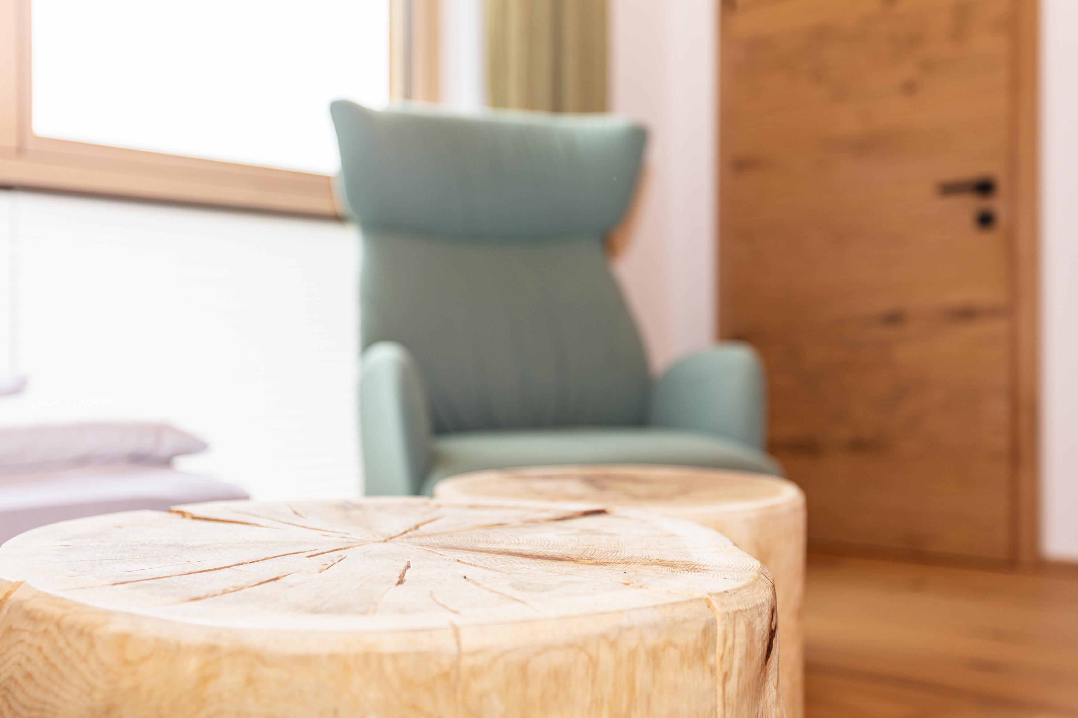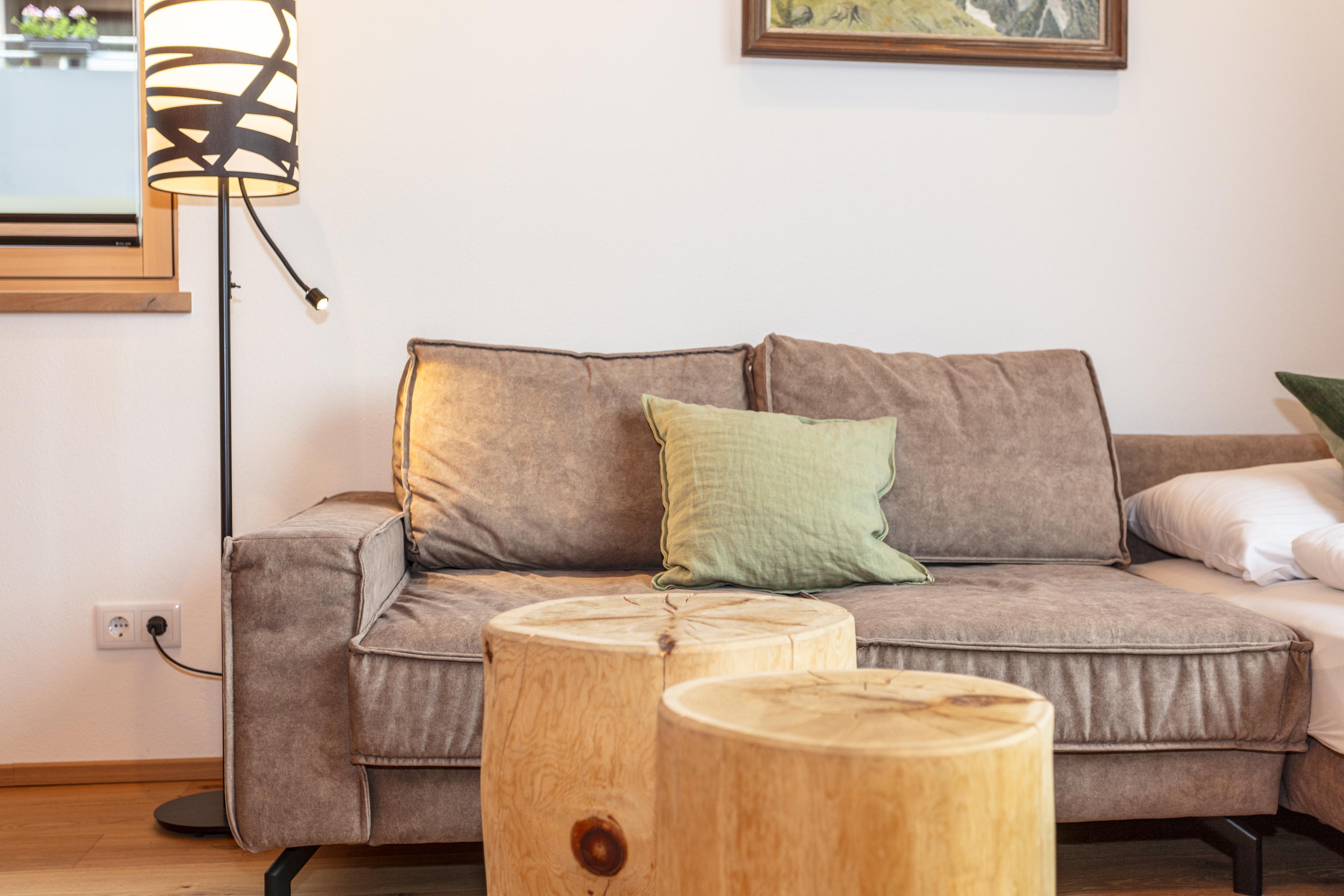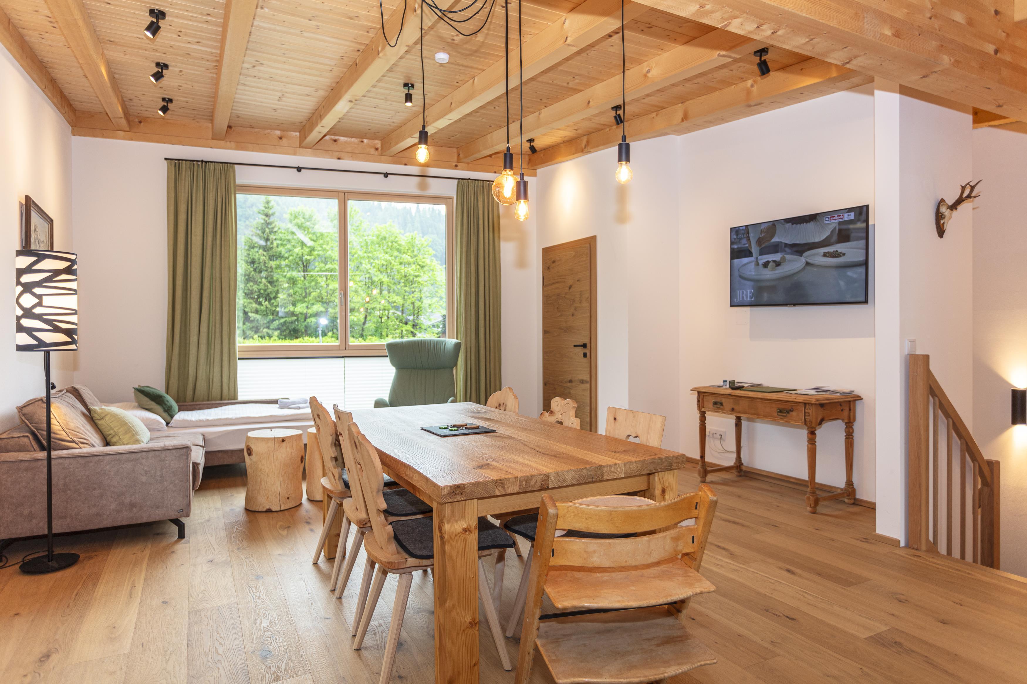 Die naturbelassene Fichtenholzdecke und ein gemütliches Ecksofa aus Naturleinen laden zum Chillen und Genießen des Ausblicks ein. Panoramafenster auf die Leoganger Steinberge. Eigene Sonnenterrasse mit Esstisch und Stühlen mit Blick auf die sanften Grasberge im Süden und Gartenbereich im Freien mit Liegestühlen.