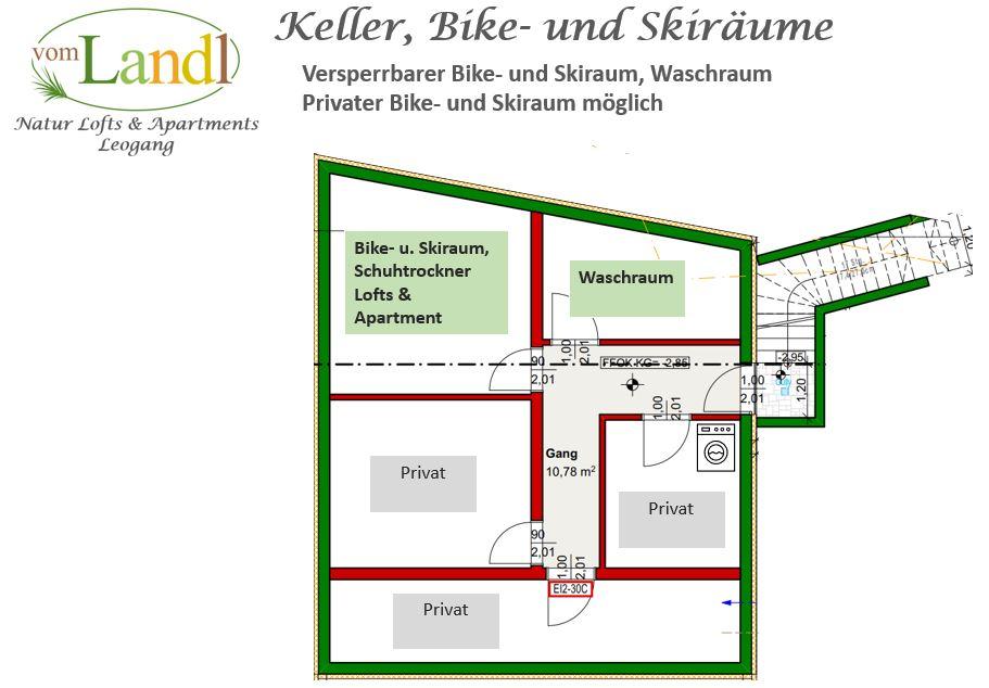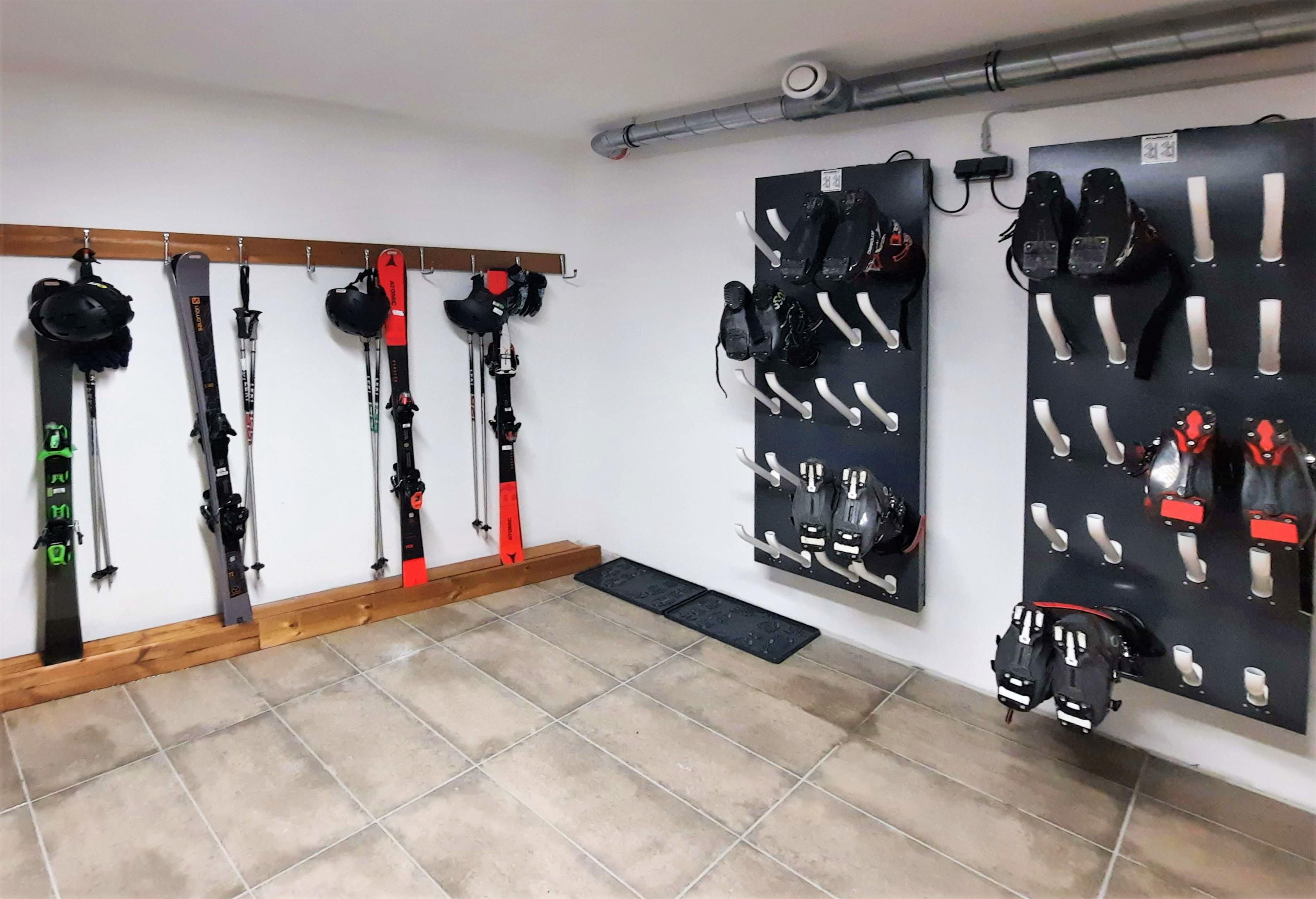 Versperrbarer Ski- und Bikeraum mit belüftetem Skischuhtrockner, Waschmaschine und Wäschetrockner inklusive.