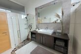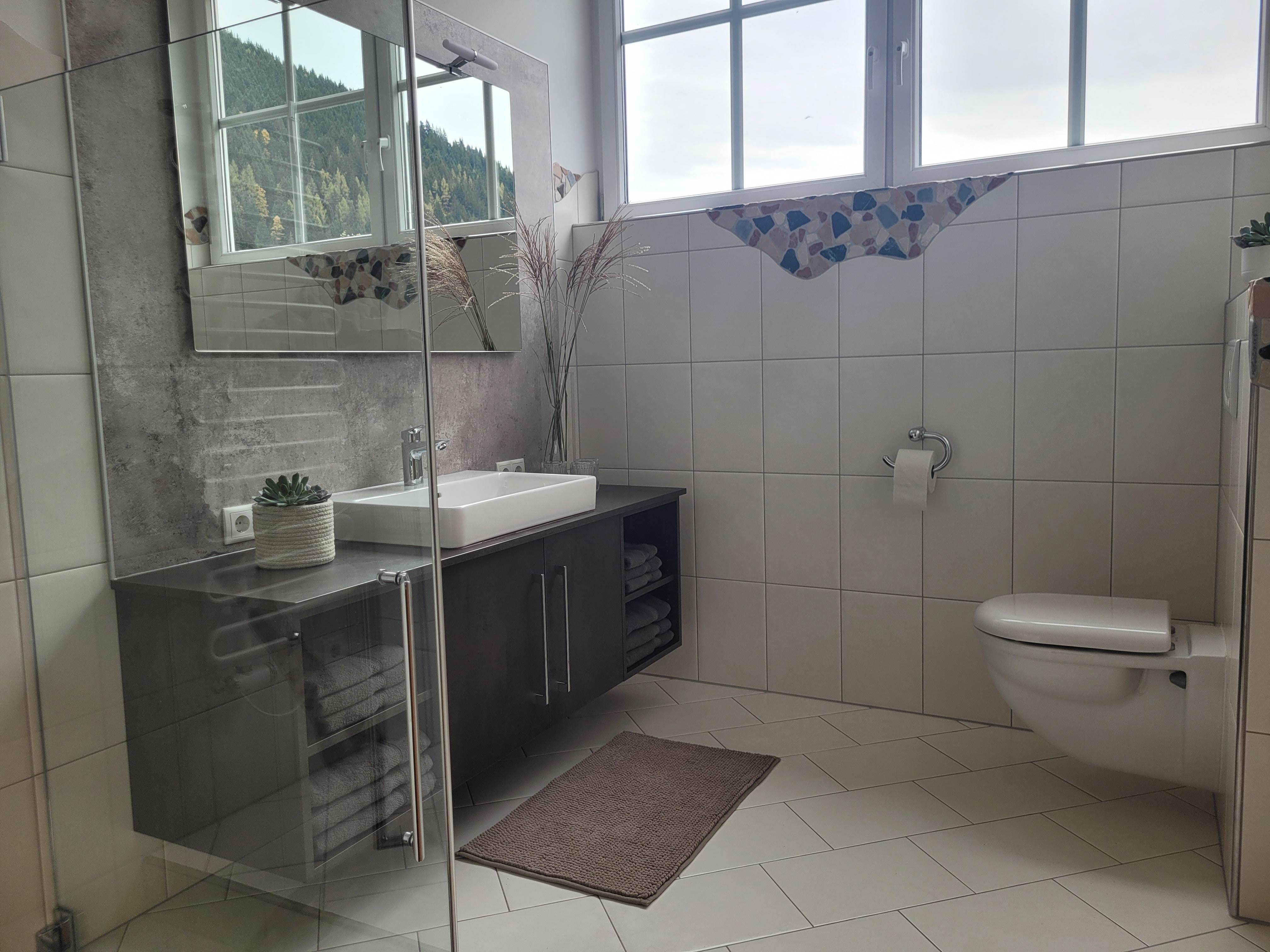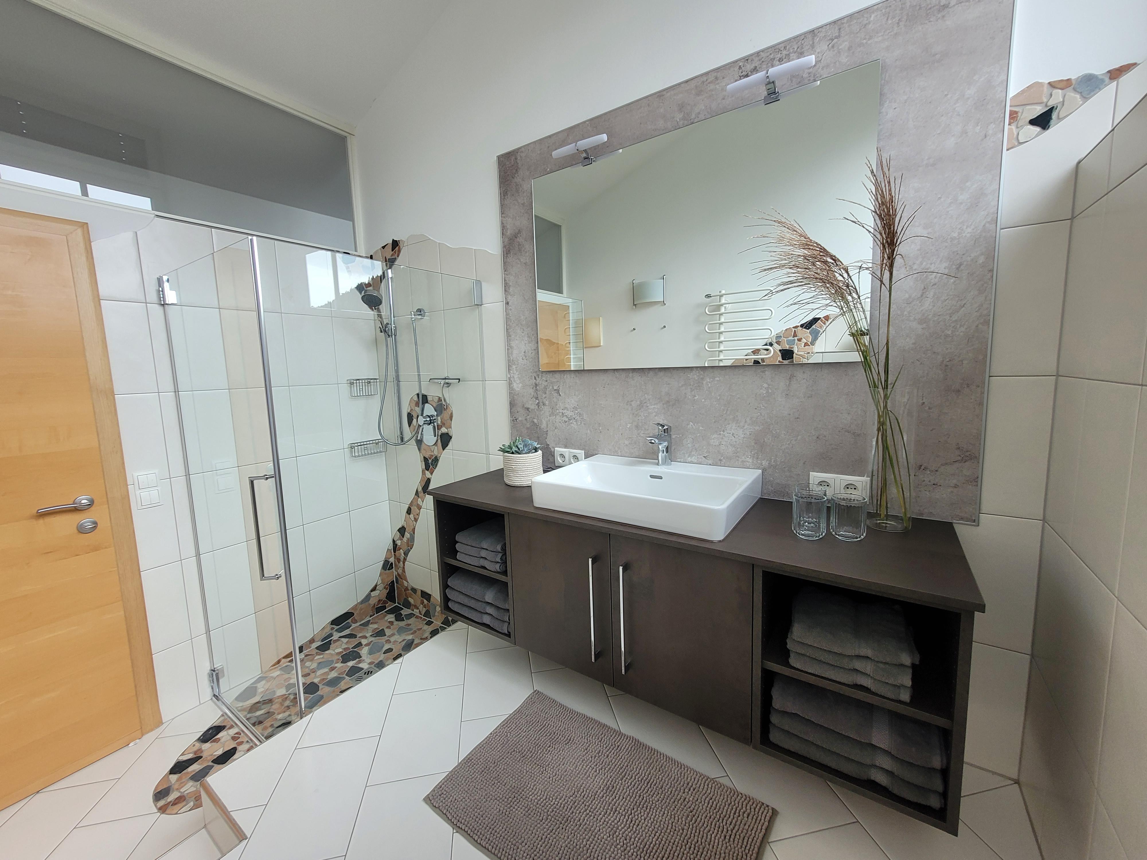 Das Badezimmer bietet Ihnen eine großzügige Dusche, ein WC sowie Handtücher und einen Haarföhn.