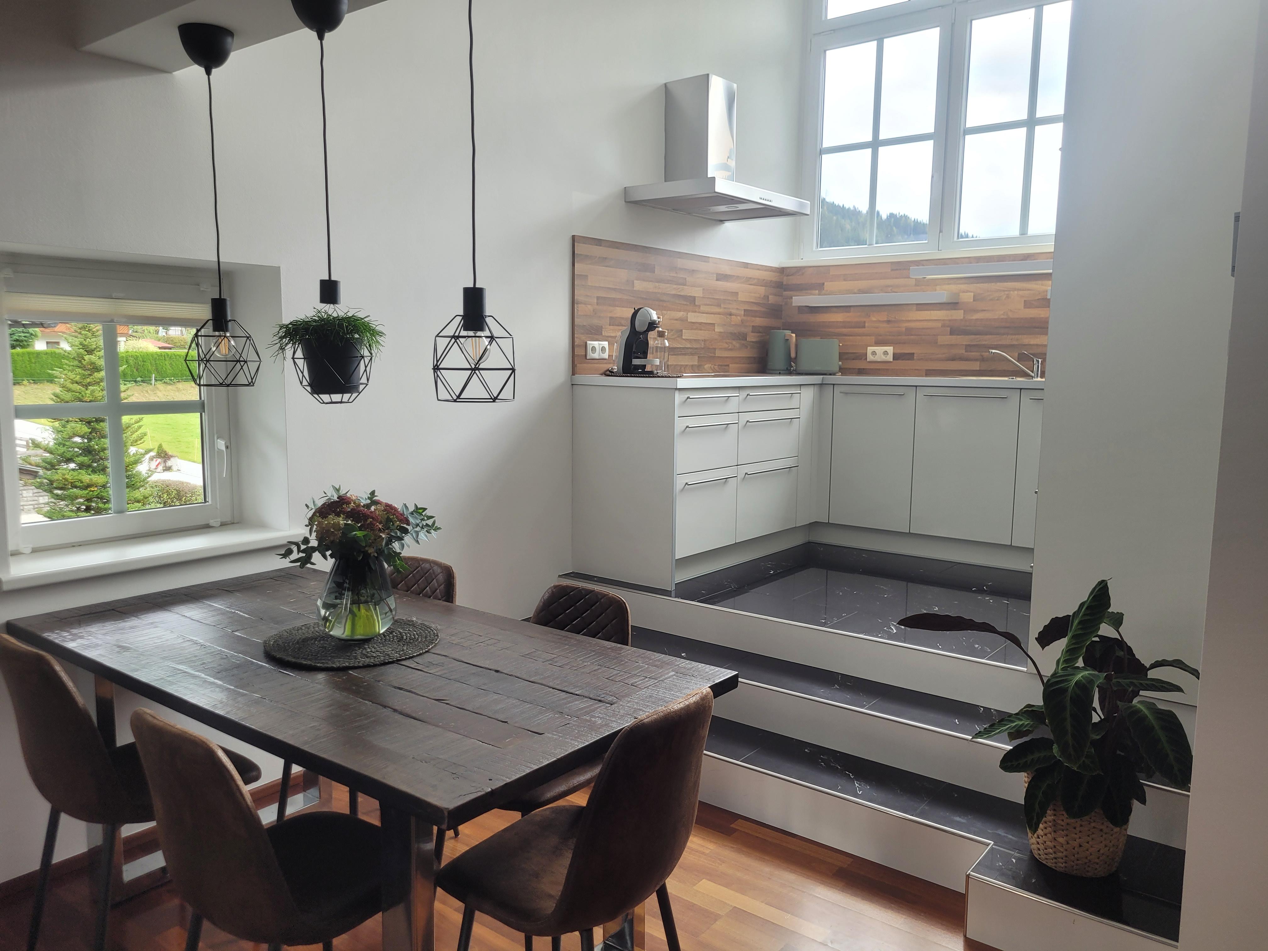 Für Ihr leibliches Wohl steht Ihnen eine vollausgestattete Küche und ein gemütlicher Esstisch zur Verfügung.