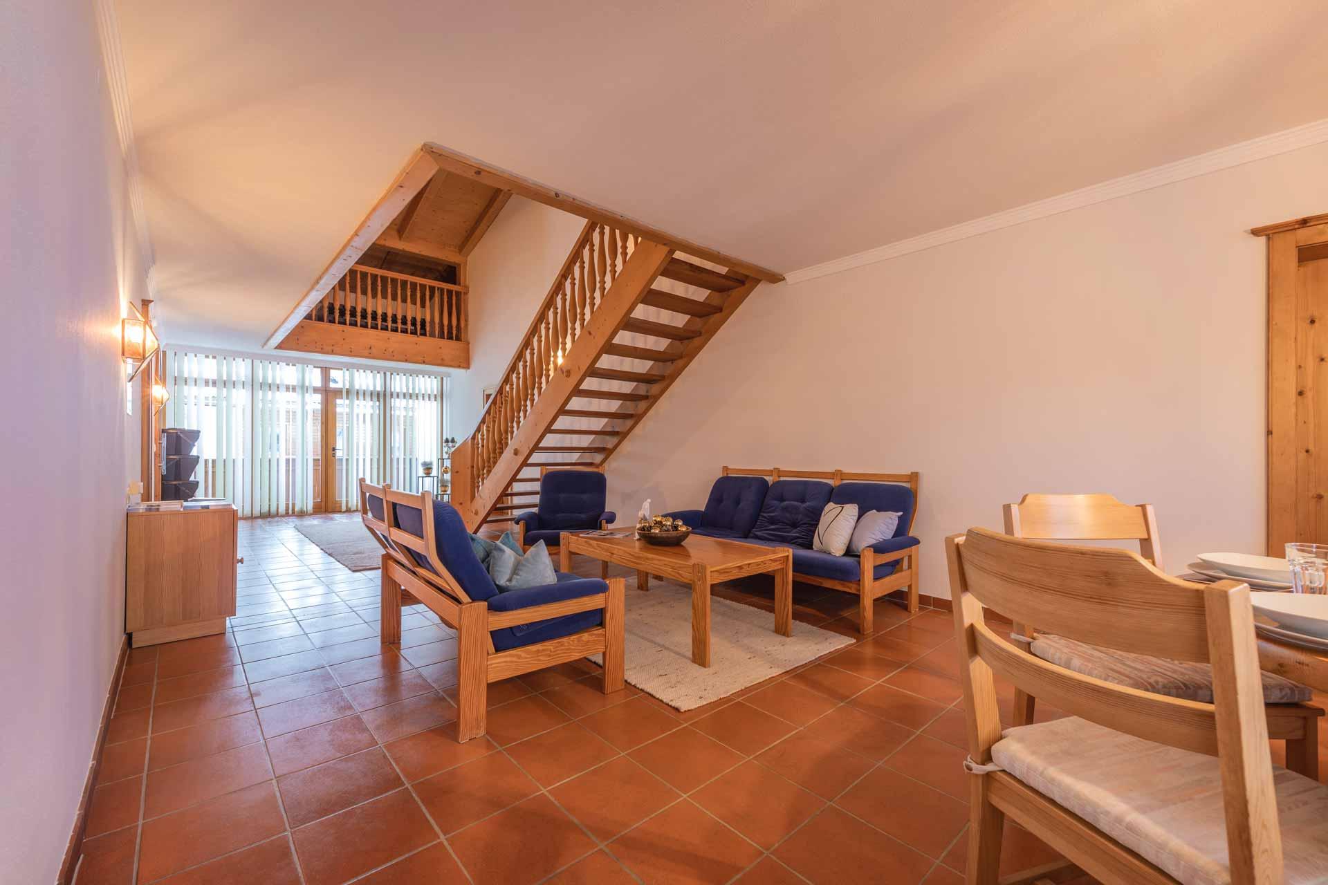 Das Herzstück der Ferienwohnung ist das großzügige Wohnzimmer, wo Sie sich nach einem aktiven Tag in den Bergen entspannen können. Die bequemen Sofas laden zum Verweilen ein, und hier können Sie vielleicht einen Filmabend mit der Familie veranstalten.