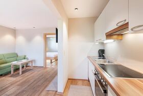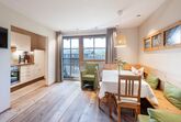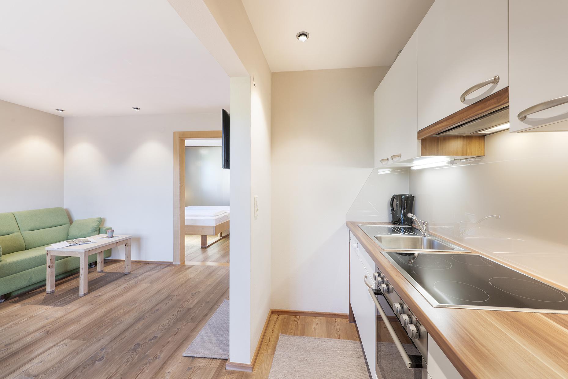 Hochwertig renovierte Ferienwohnung für 2-6 Personen mit 46 m². Die Ferienwohnung ist mit unbehandelten Vollholzmöbeln und Holzböden ausgestattet und besteht aus einem Wohnraum mit vollausgestatteter Küchenzeile mit Geschirrspülmaschine, Essecke und Doppel-Ausziehcouch, 1 Schlafzimmer mit Doppelbett und Flatscreen, 1 Schlafzimmer mit zwei getrennten Betten, Bad mit Dusche, separatem WC und möbliertem Balkon. LCD TV, gratis WLAN, Safe und Direktwahltelefon.