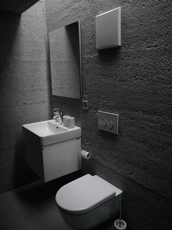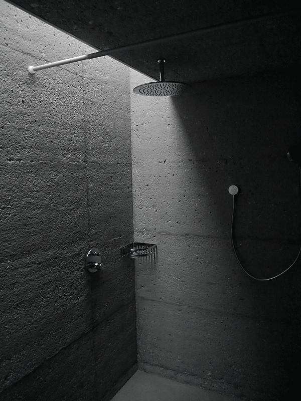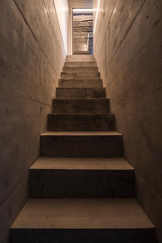 Im Sockel befindet sich das Hauptschlafzimmer, das sich auf eine überdachte Terrasse mit Blick auf das Tal ausdehnt. Das Badezimmer wird durch einen in den Boden gehauenen Schlitz beleuchtet, der ein diffuses Licht ermöglicht.