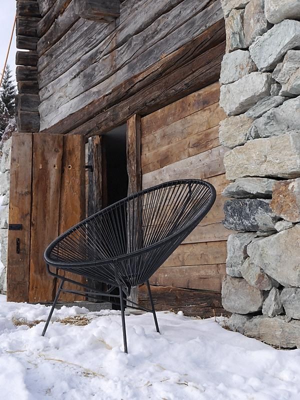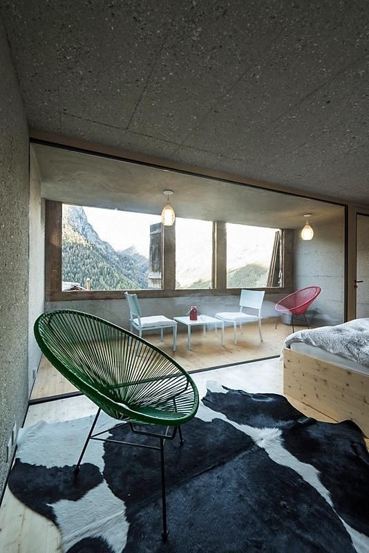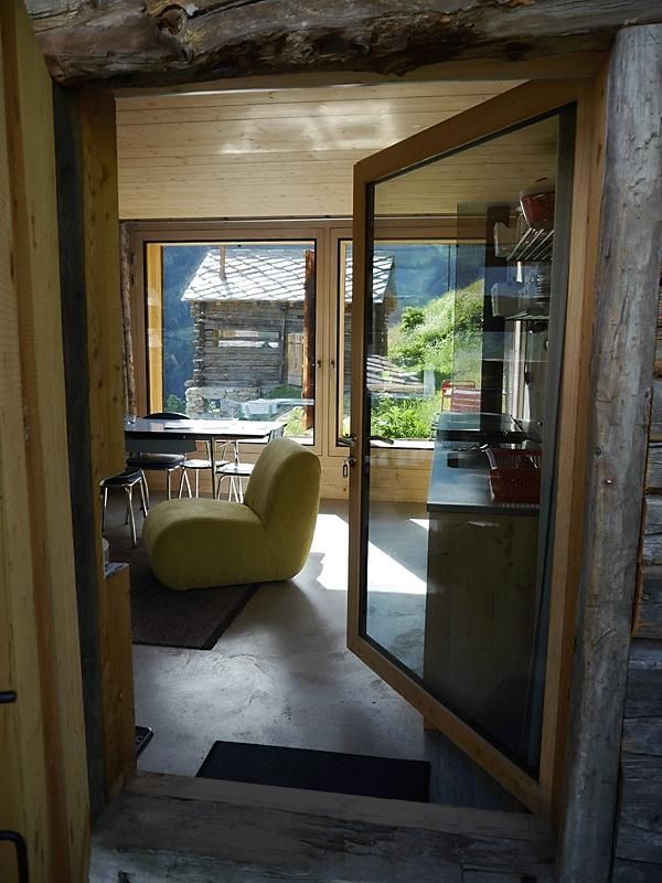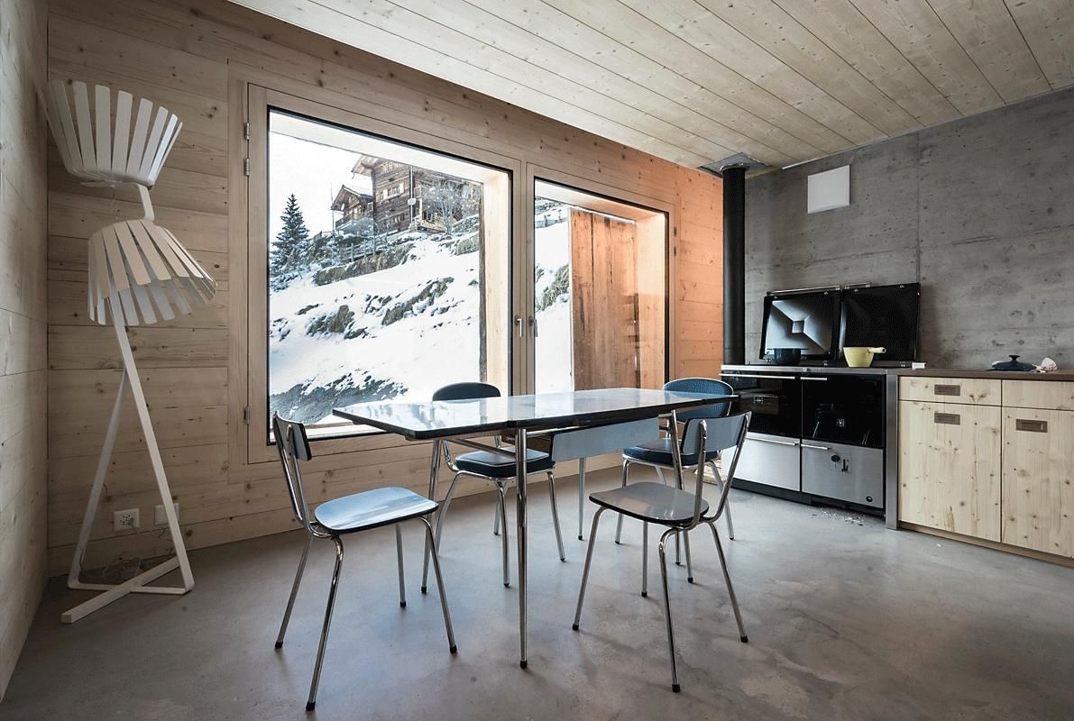 Die ehemalige Scheune beherbergt den Hauptwohnbereich, der aus einer Einbauküche, einem Esstisch und einem Entspannungsbereich besteht. Der Wohnbereich umfasst auch den Holzofen, mit dem das gesamte Maiensäss im Geist vergangener Zeiten beheizt werden kann. Große Öffnungen an den Seiten ermöglichen den Blick auf das Tal in einem entschieden modernen Ambiente, diese Öffnungen bestehen aus