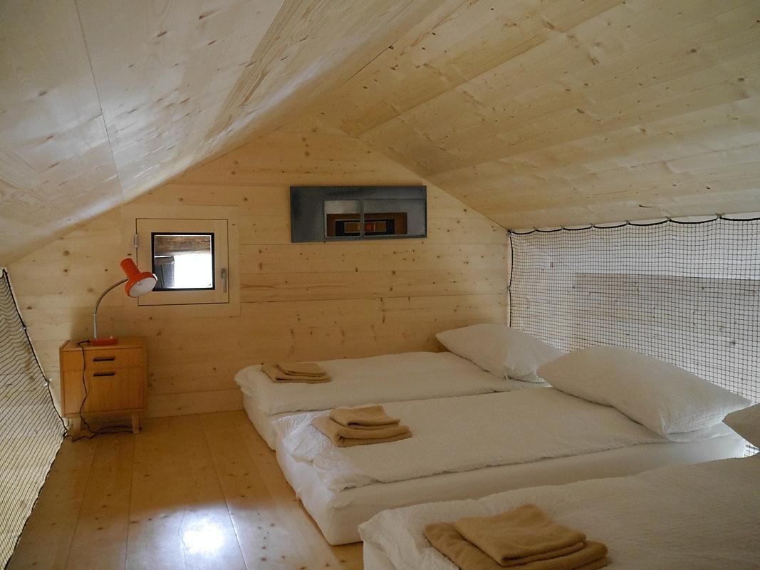 aus einer Mischung aus Holz und Beton. Im Wohnbereich befindet sich ein Mezzanin, das je nach Bedarf als Schlafraum oder Doppelzimmer genutzt werden kann.