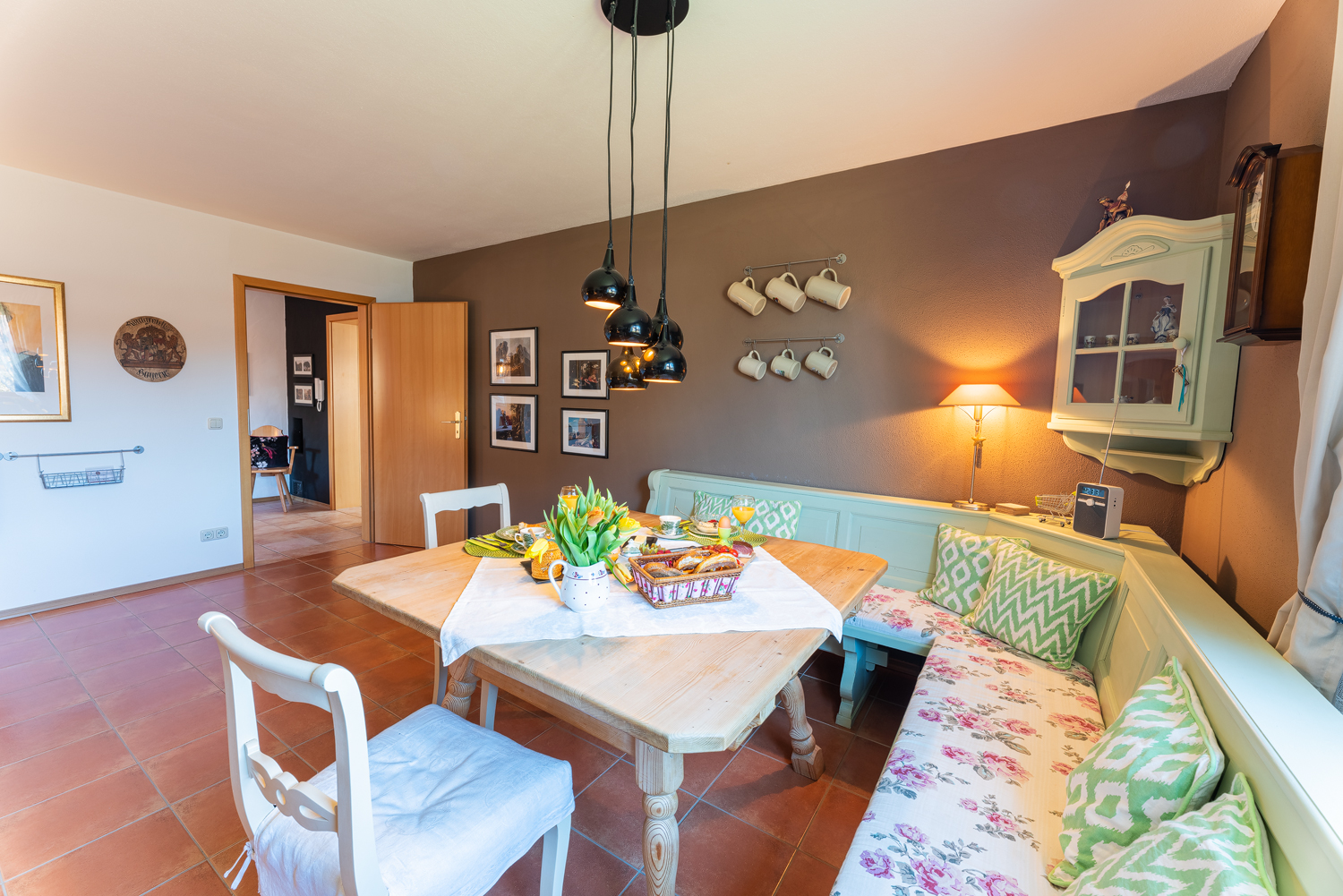 Platz zum Essen finden sie alle auf der echten, bayerischen Eckbank, rund um den urigen Esstisch.