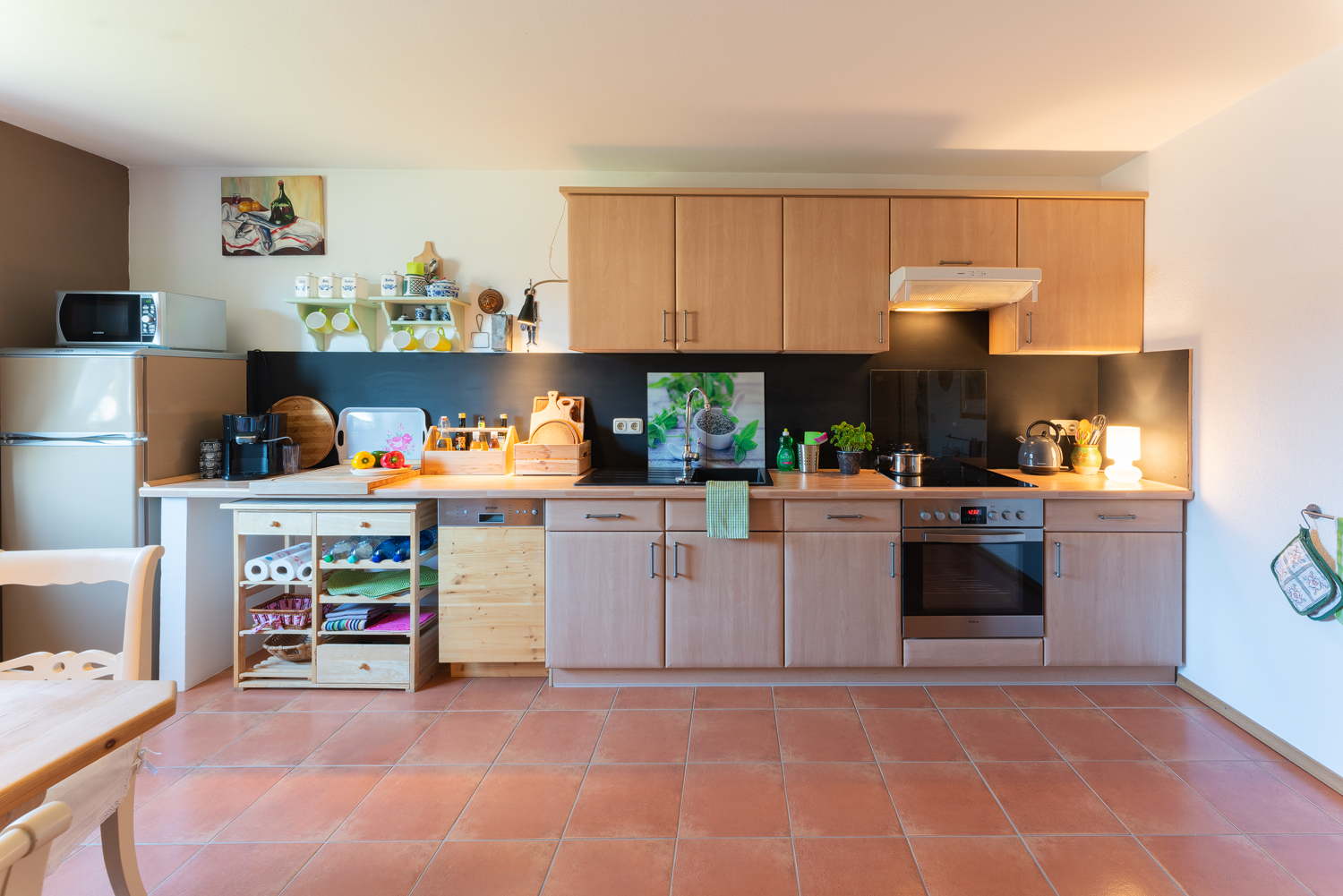 Die große separate Küche ist im modernen Alpen-Stil eingerichtet und hat neben einen Herd/Backofen, Kühlschrank/Gefrierkombination sowie auch eine Spülmaschine. Geschirr und Küchenutensilien sind ausreichend vorhanden. Essig und Öl, Salz und Pfeffer, sowie einige gängige Gewürze, Spültabs und -Mittel stellen wir Ihnen zur Verfügung. Die Küche hat eine Kaffee-Pad-Maschine.