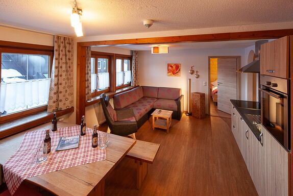 Großzügiger Wohnbereich mit gemütlicher Sofacouch, Essplatz, Flachbildschirm mit Smart TV ,HD, komplett eingerichtete Küche, Spülmaschine, Backofen. Ceranfeld, Kaffeemaschine usw. 2m langen Zirbenbett mit Bandscheibenmatratzen und verstellbaren Lattenrosten. Das Bett ist bei Ihrere Anreise bezogen.