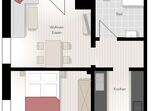 Diele mit Garderobe, Wohnraum mit Essplatz, gemütlichem Sofa, TV HD, WLAN, komplett eingerichtete Küche, Spülmaschine, Backofen. Ceranfeld, Kaffeemaschine. Separates Schlafzimmer mit 2m langen Doppelbett, Bandscheiben Matratzen und Verstellbaren Lattenrosten. Bad mit Dusche/WC, Flachem einstieg, Handtücher und Duschtücher, Fön sind vorhanden. Nichtraucher.