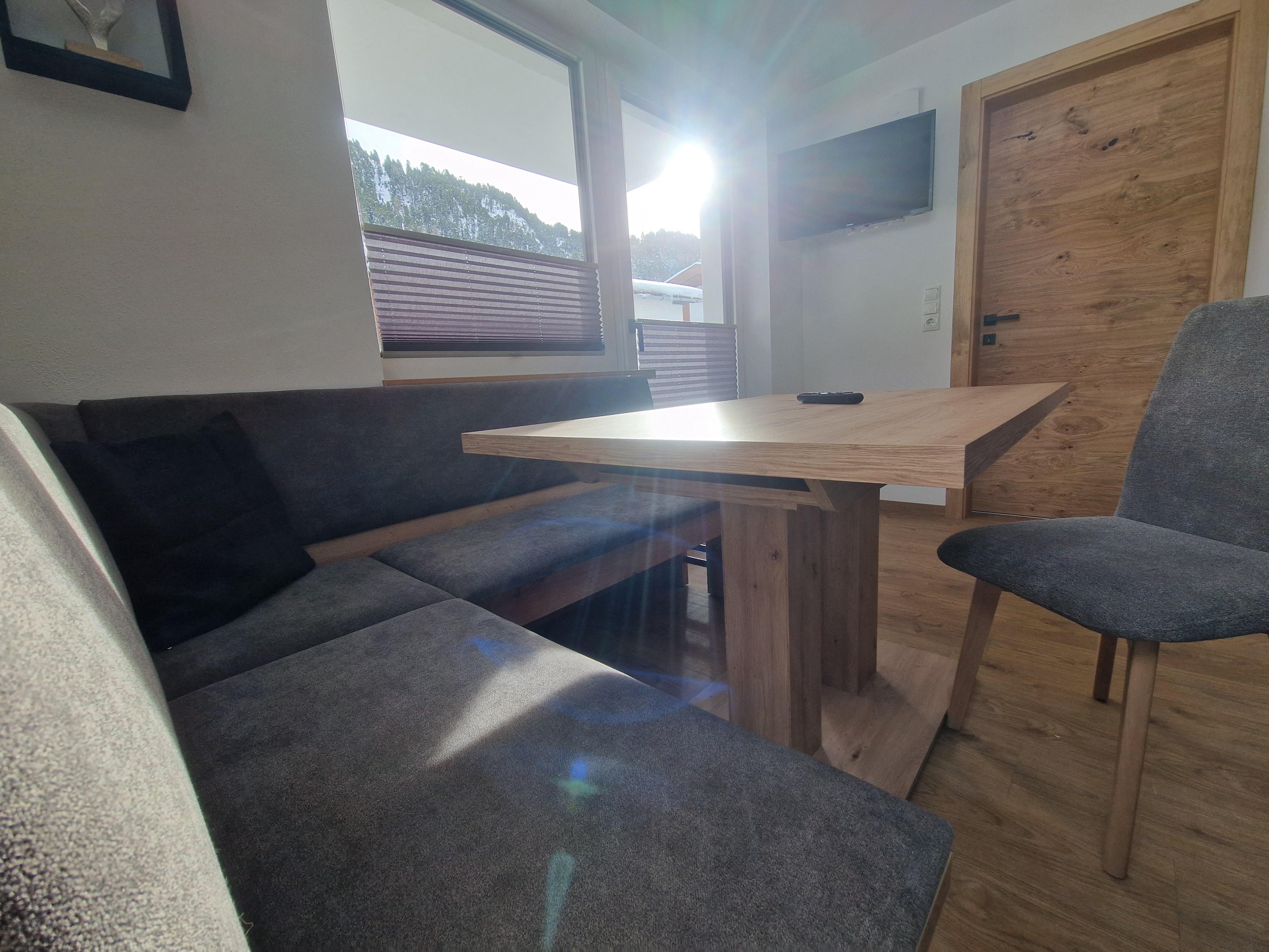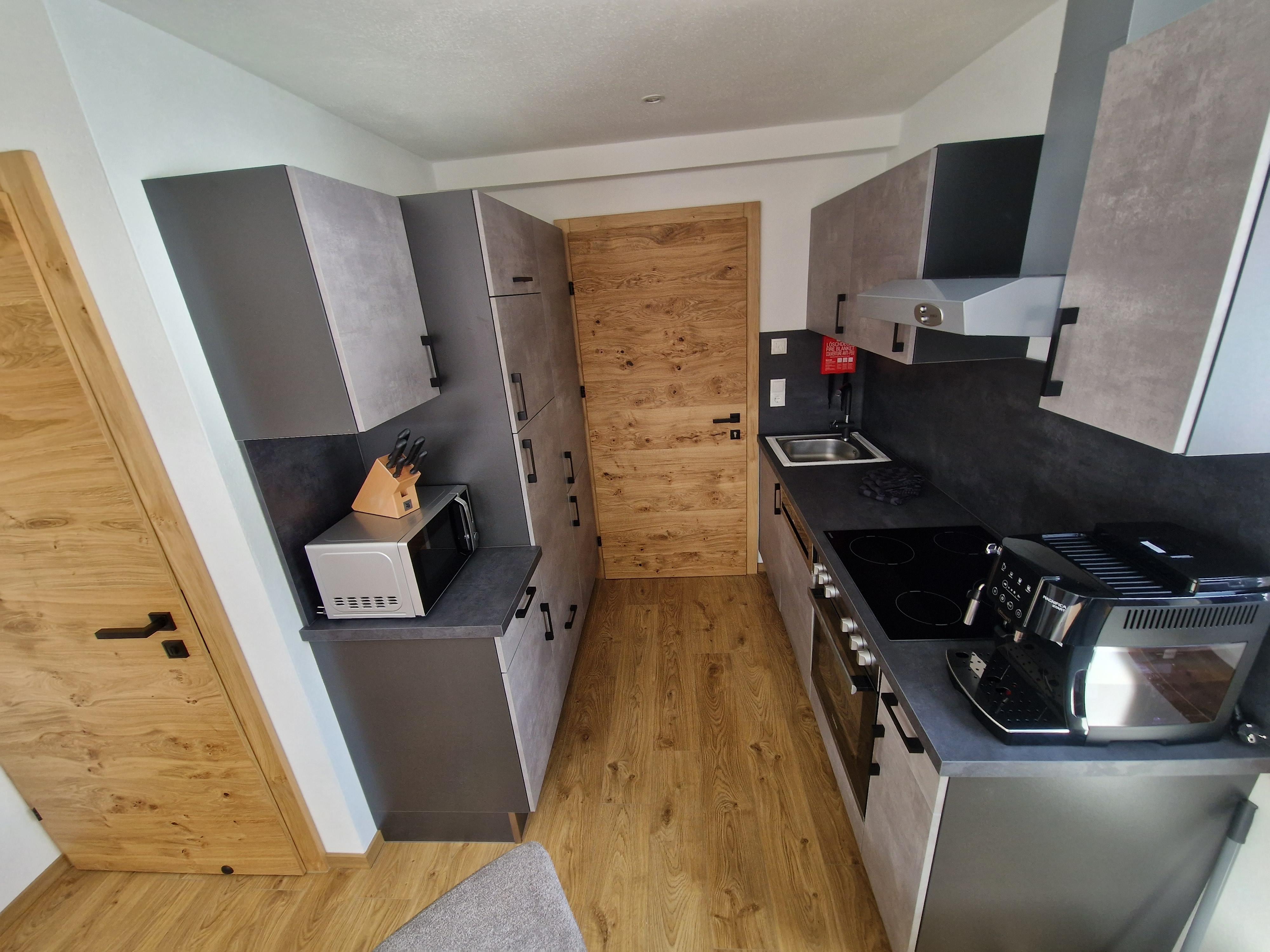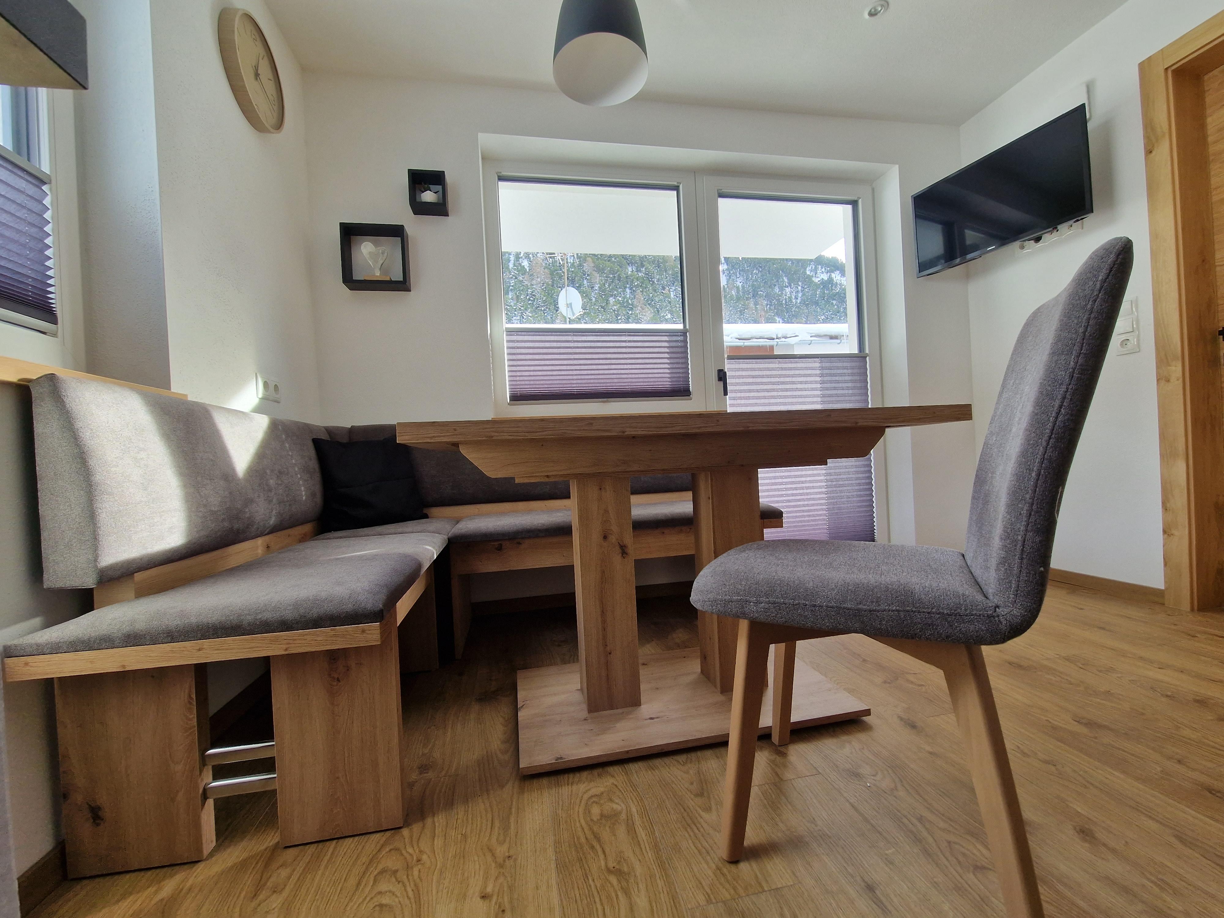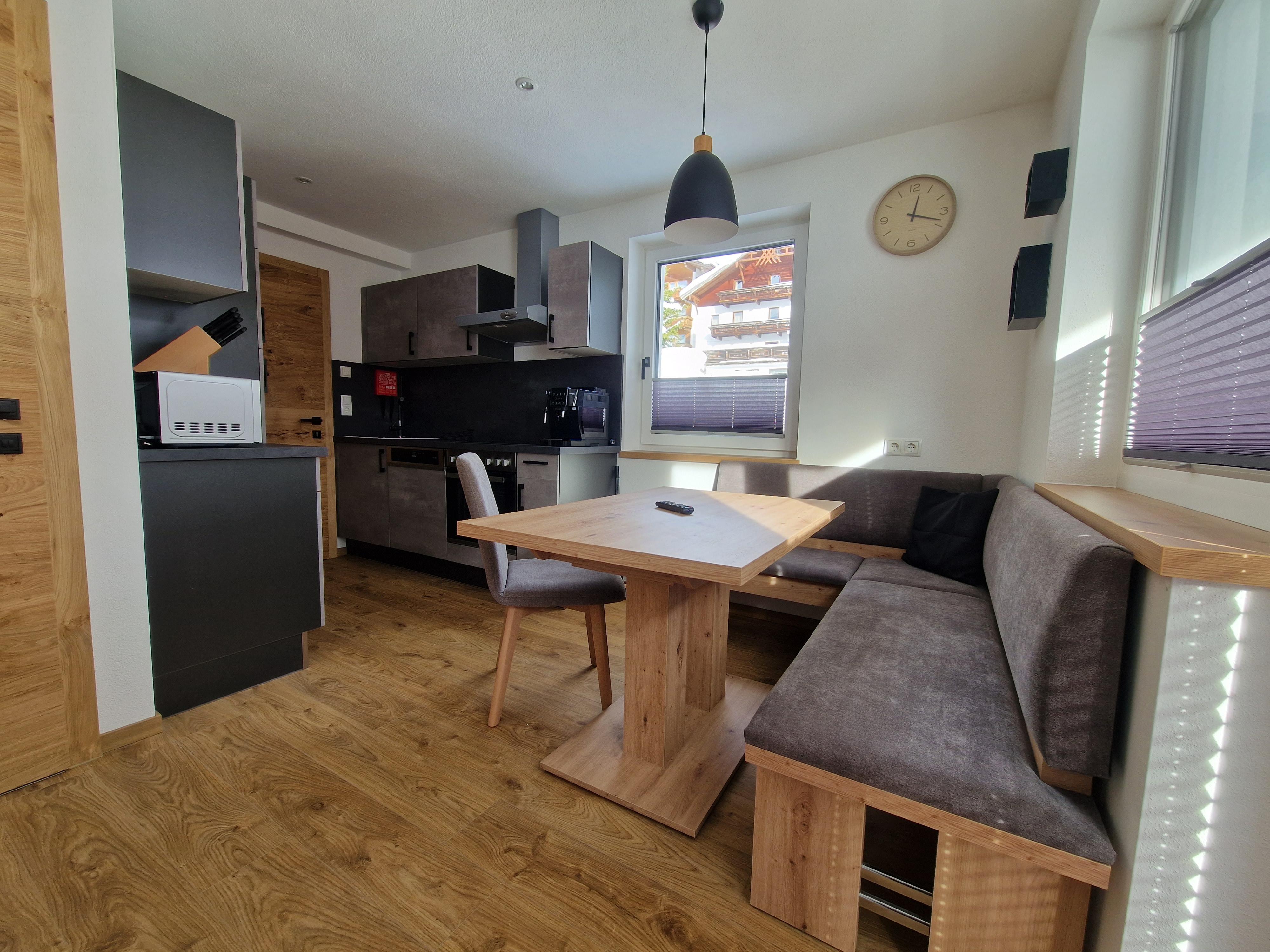 Apart Kreuzspitz mit ca. 31 m²: 1 Schlafzimmer mit Doppelbett und einem Einzelbett, Badezimmer mit Dusche/WC, Wohnküche mit Essbereich und Küchenzeile (Cerankochfeld, Backrohr, Geschirrspüler, Kühlschrank, Wasserkocher uvm.), Balkon mit Sitzgelegenheit.