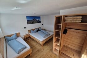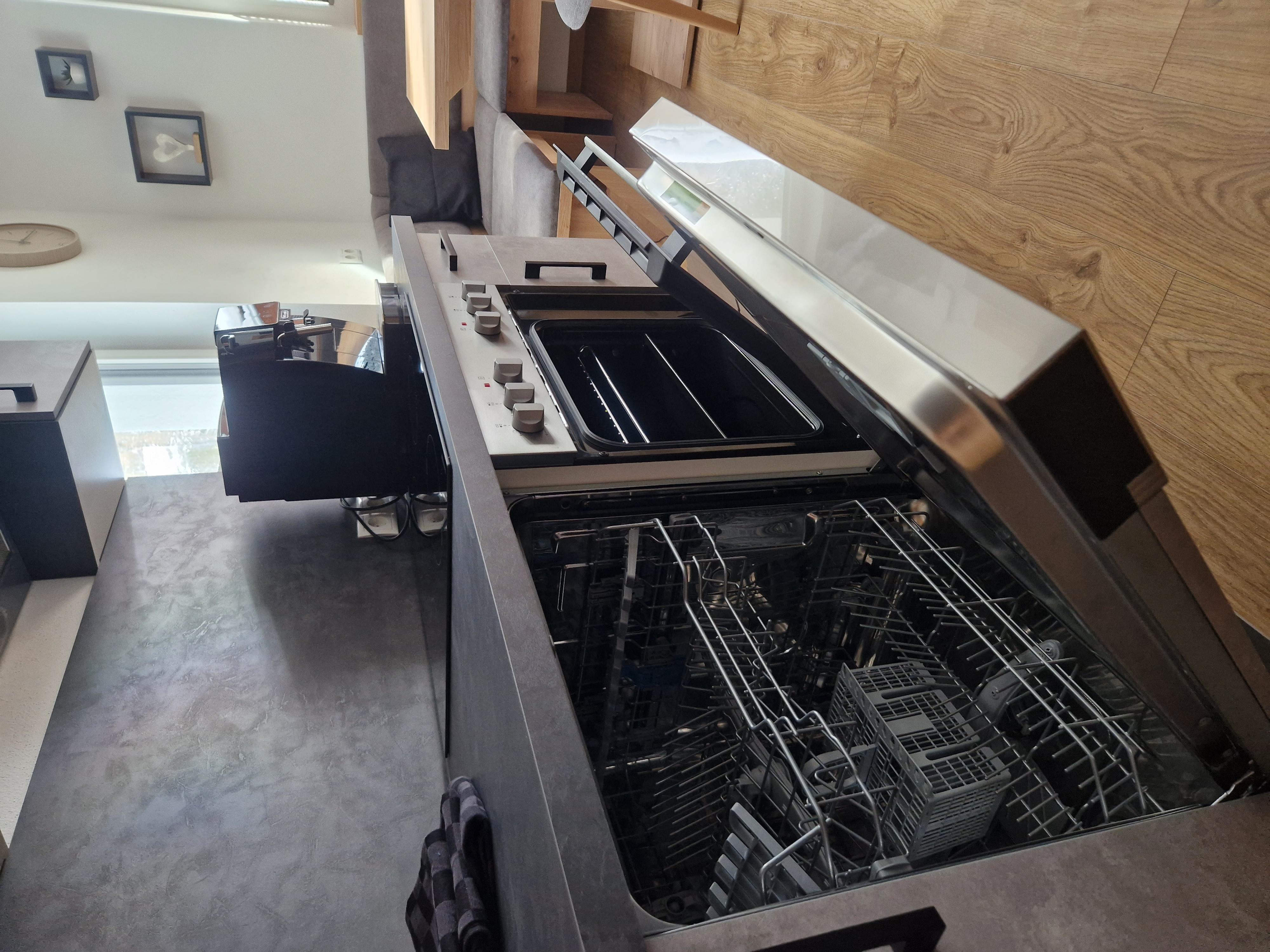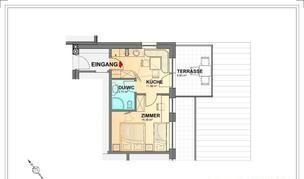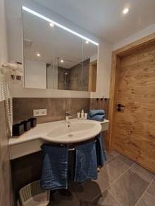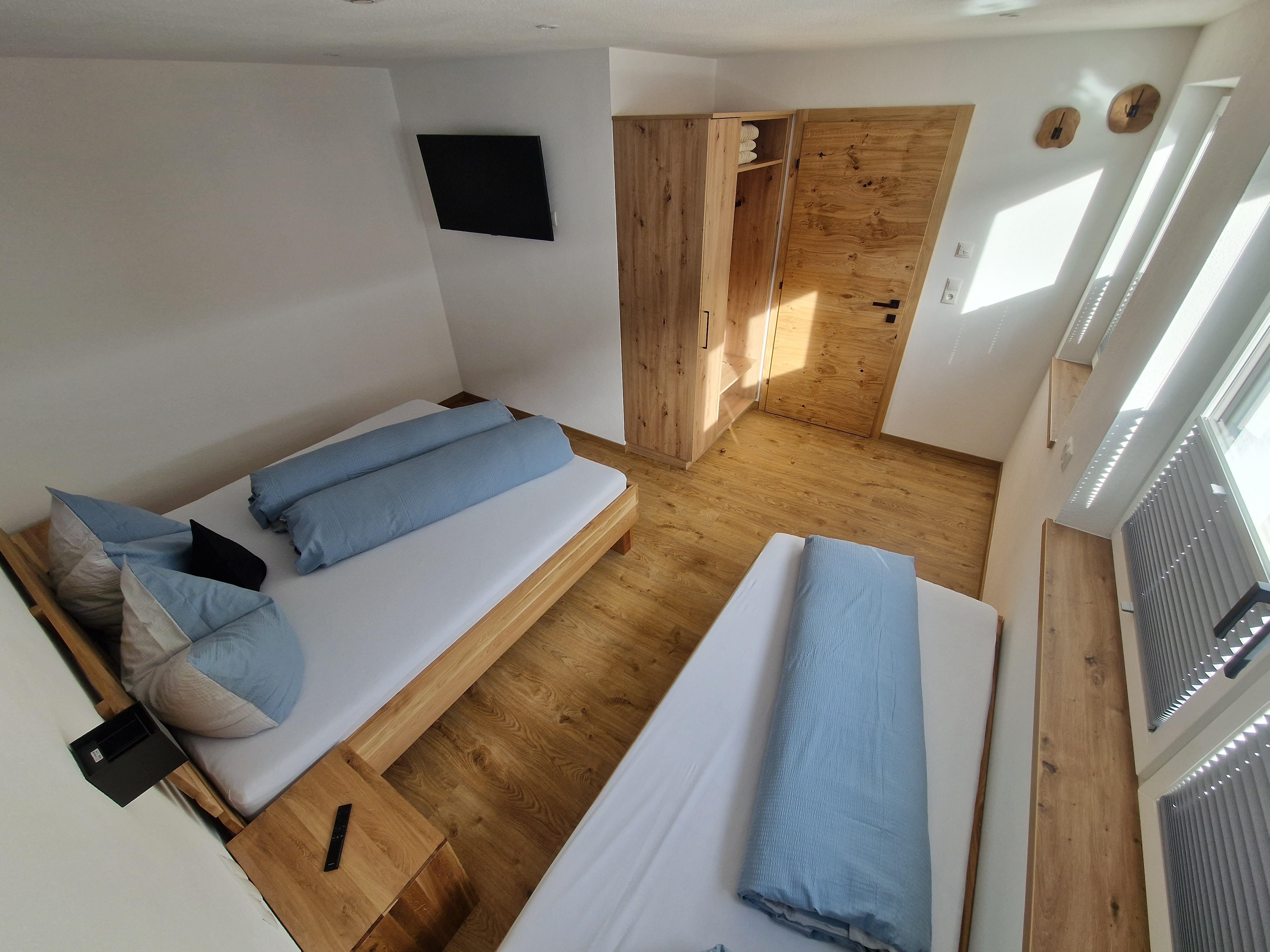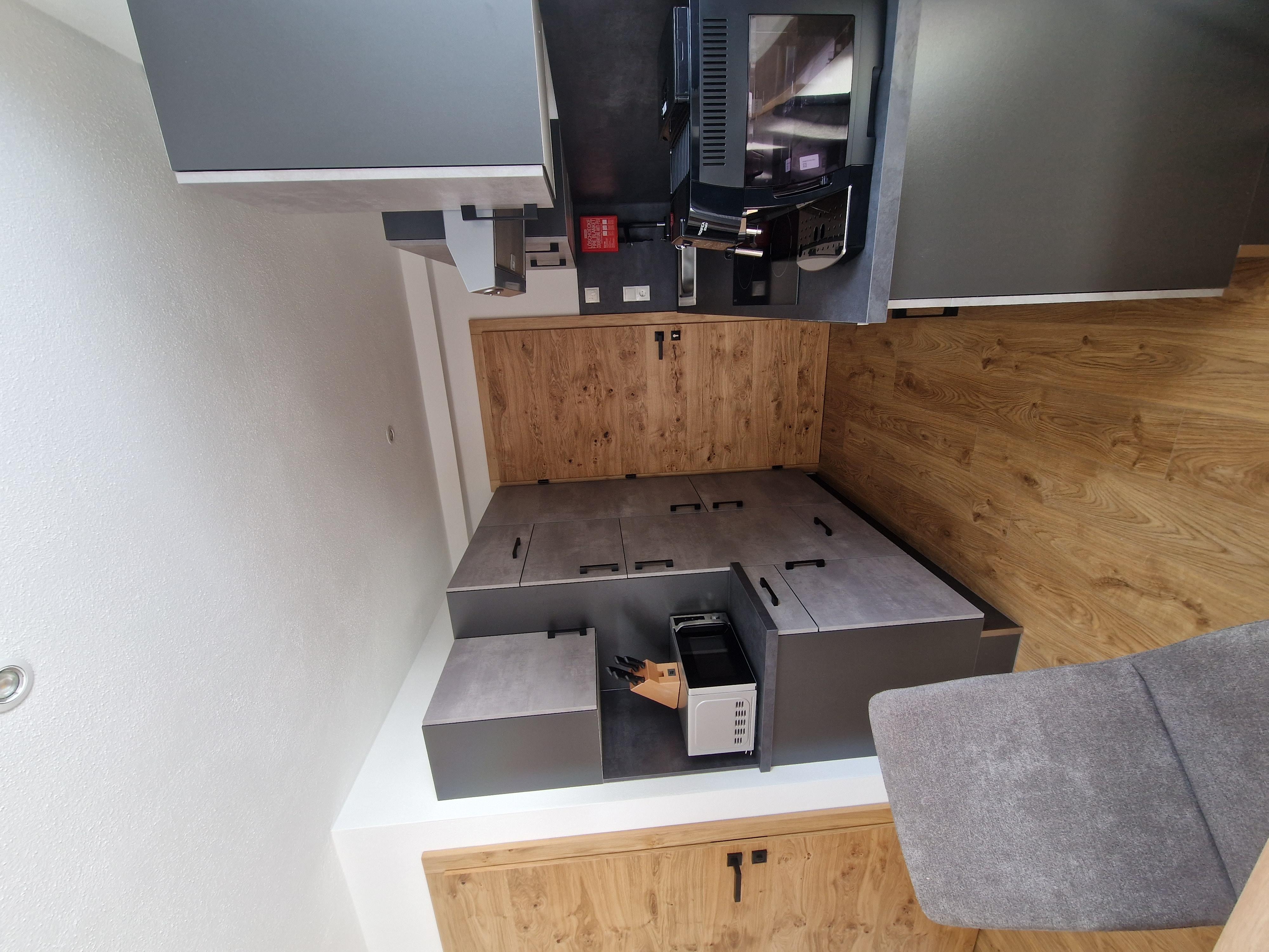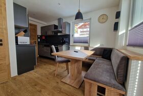 Apart Kreuzspitz mit ca. 31 m²: 1 Schlafzimmer mit Doppelbett und einem Einzelbett, Badezimmer mit Dusche/WC, Wohnküche mit Essbereich und Küchenzeile (Cerankochfeld, Backrohr, Geschirrspüler, Kühlschrank, Wasserkocher uvm.), Balkon mit Sitzgelegenheit.