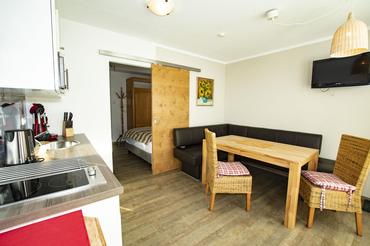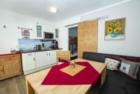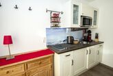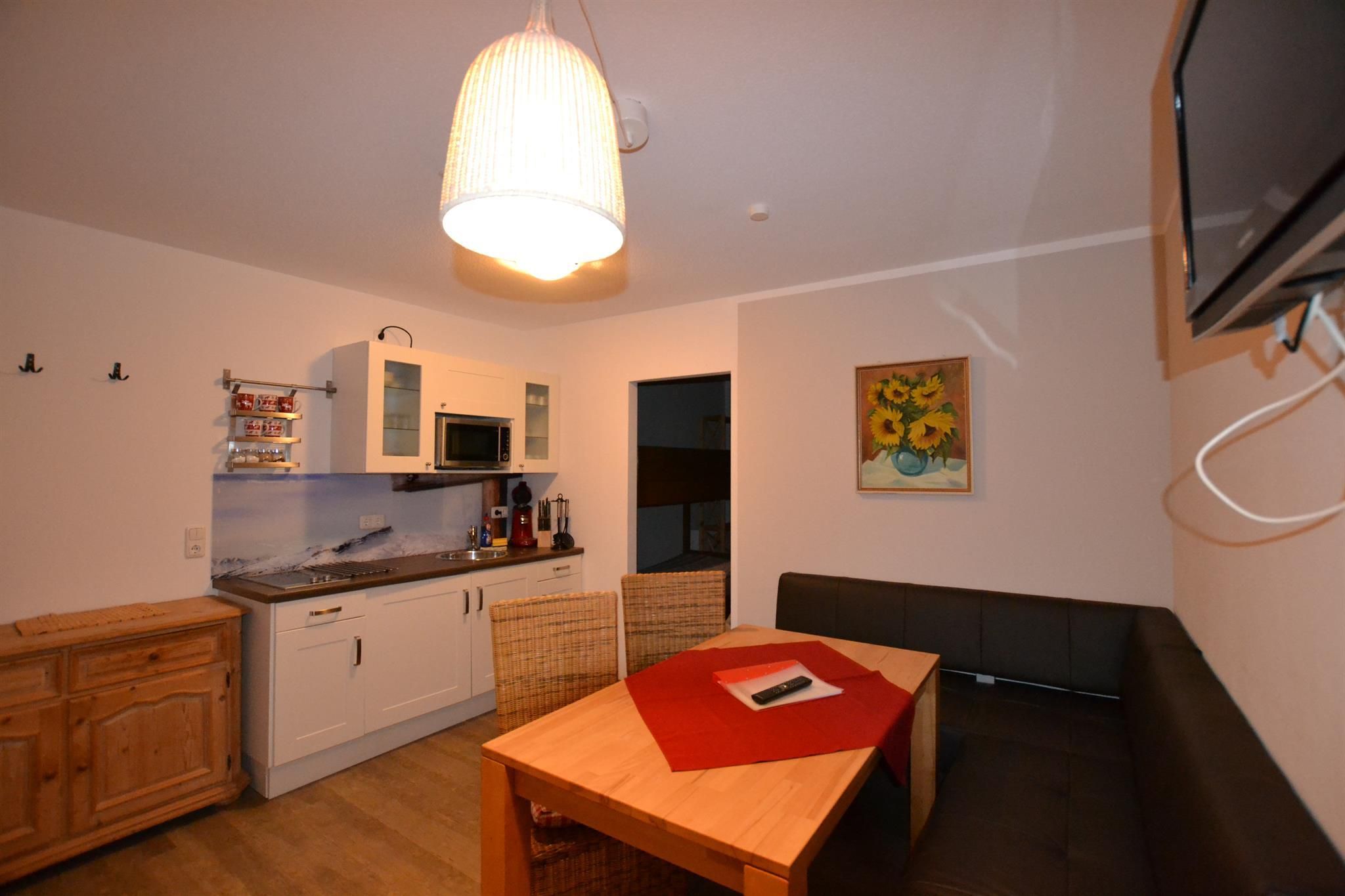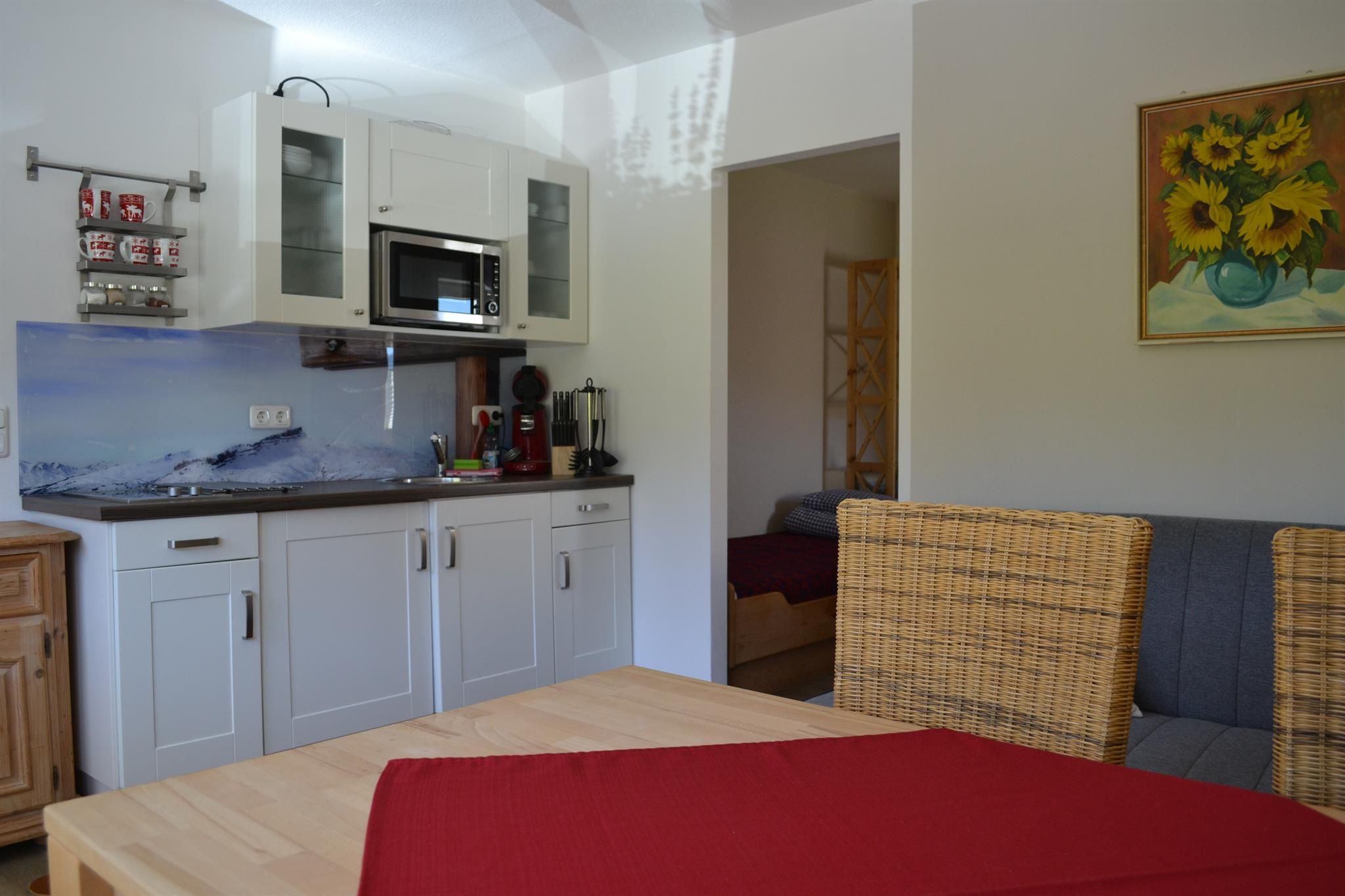 Gemütliches, kleines Appartement mit eigenem Eingang über die Terrasse. Im Wohn- Essbereich befindet sich eine Eckcouch mit Esstisch und eine voll ausgestattete Küchenzeile. 2-Platten Herd, Micro-Grill, Wasserkocher, Toaster und Kaffemaschine.