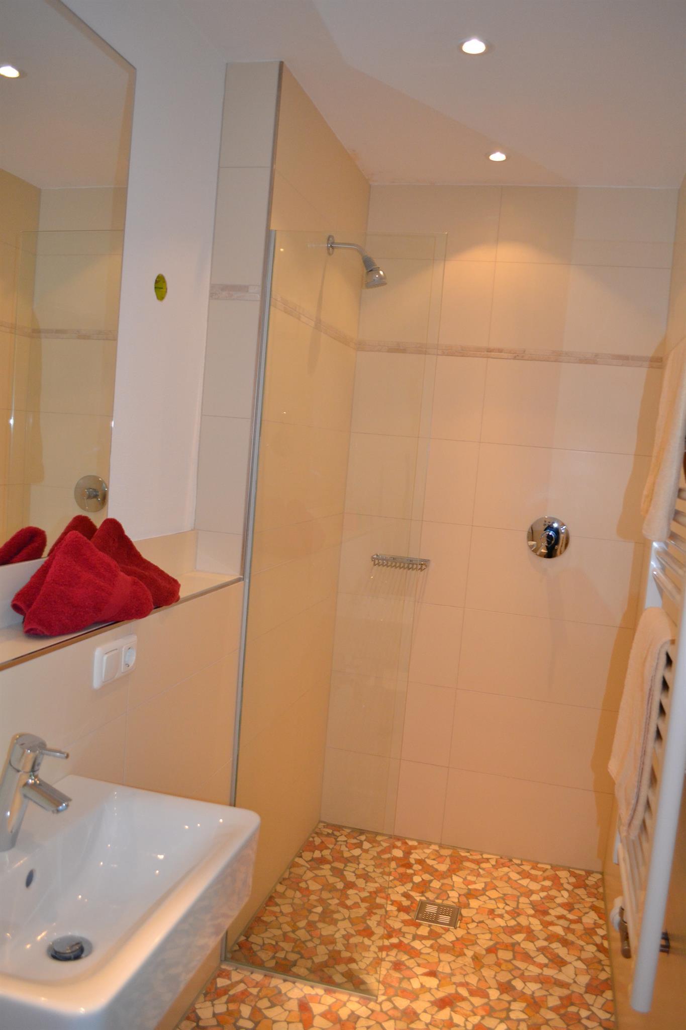 Ebenerdiges Dusch-Bad, inkl. Hand- und Duschseife.