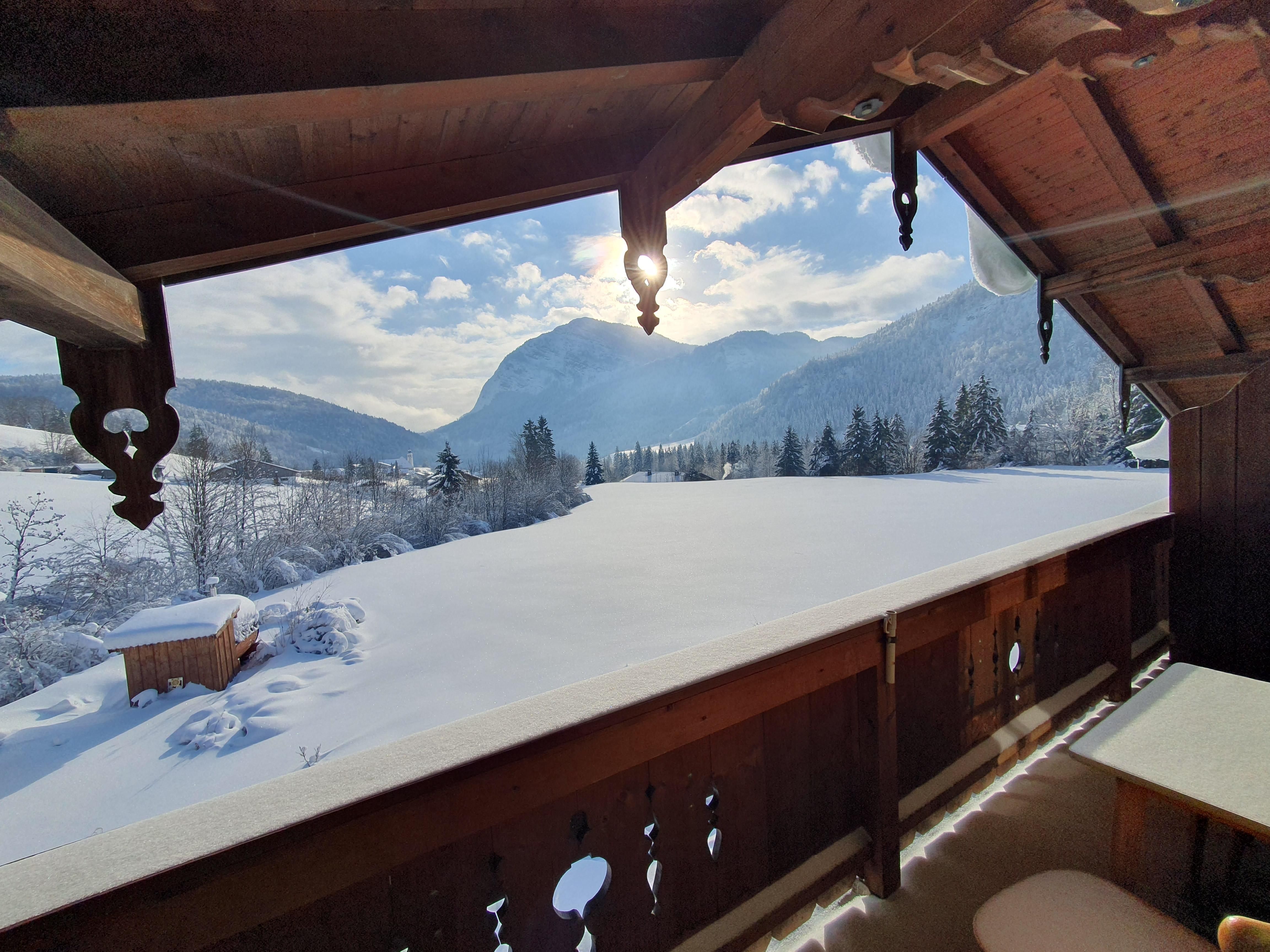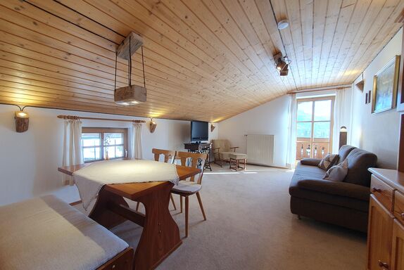 Als Quartier stehen ihnen zwei Ferienwohnungen zur Verfügung. Diese sind direkt nebeneinander im zweiten Stockwerk und haben Zugang zu einem Balkon auf der Südseite des Hauses. Der Balkon ist durch eine Holzwand getrennt. Die eigene Privatsphäre ist somit sehr gut gewährleistet. Bei Bedarf, beispielsweise bei Belegung beider Ferienwohnungen, kann diese jedoch auch geöffnet werden. Die zwei Ferienwohnungen liegen im 2. Obergeschoss des Prümbachhofes mit sehr schönem Blick auf das Weißbachtal, die umliegenden Berge und die Weißbacher Kirche.